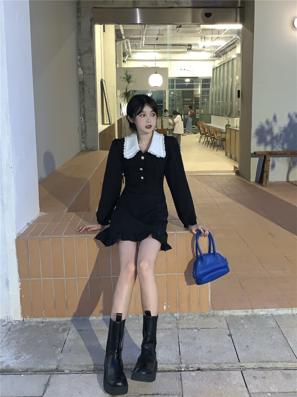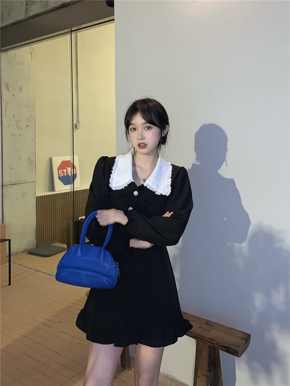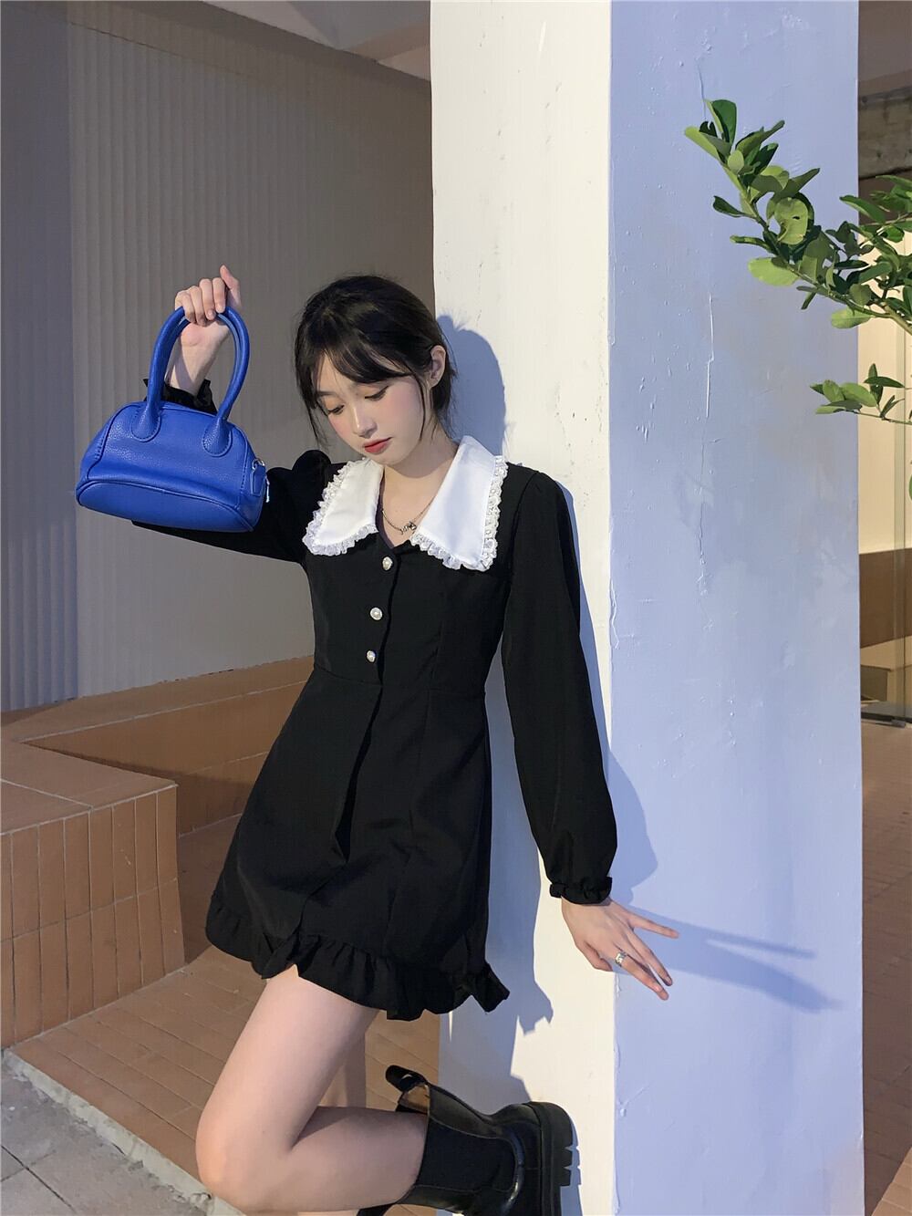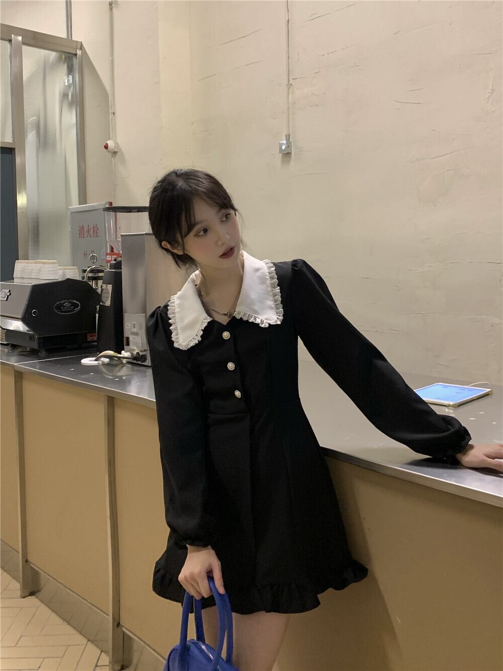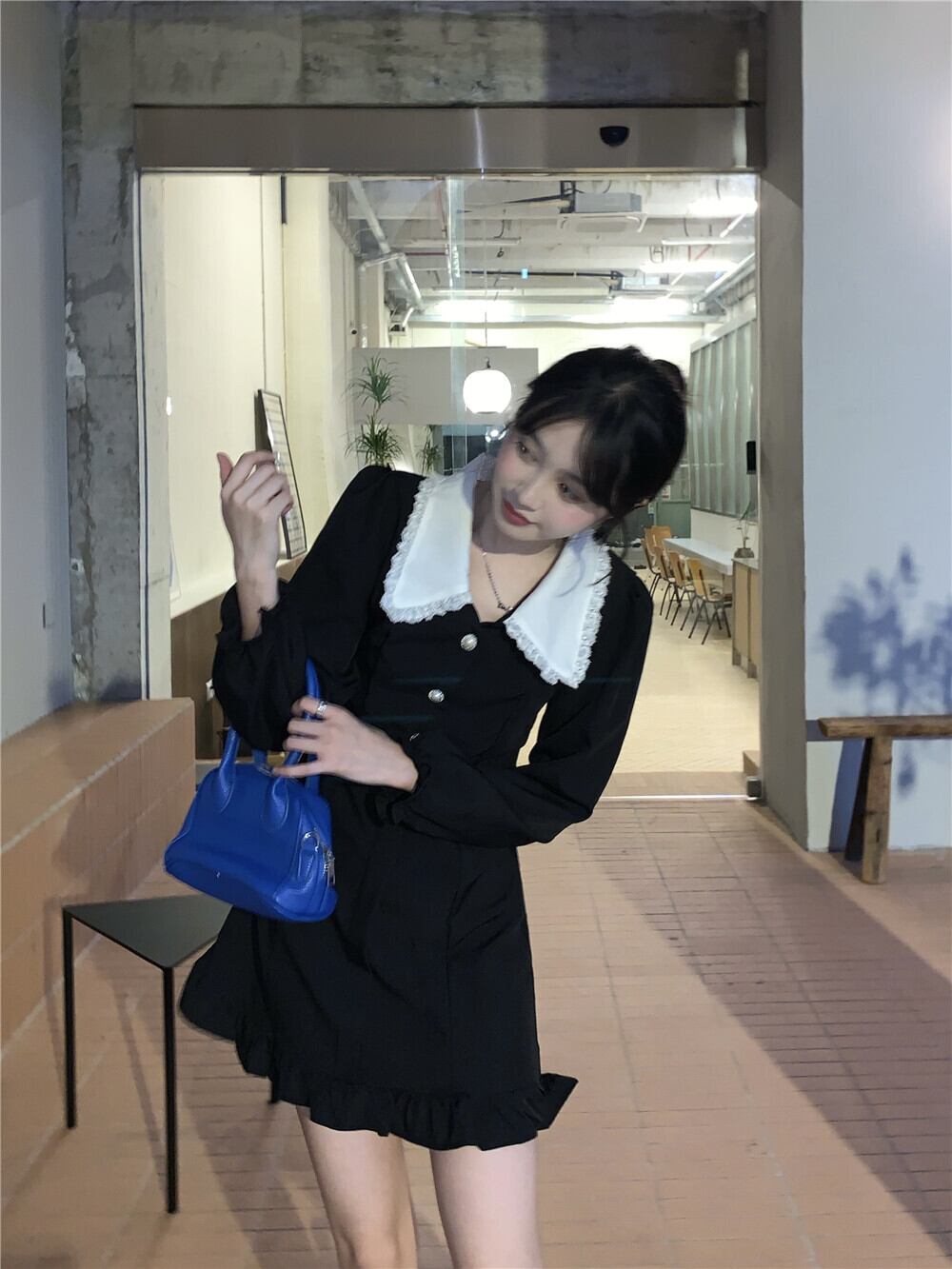 ミニ丈ワンピース 魅せる ワンピース ミニスカート ブラック 黒 ミニ丈 袖あり 長袖 襟付き ボタン 大人女子 大人 上品 おしゃれ エレガント レトロ レトロ風 キュート ガーリー かわいい 女子 個性的 デザイン 主役級 存在感 ラブリー 無地 秋 オータム 10代 20代 レディース 女性用 女の子 学生 通学 デート お出かけ 女子会 イベント リゾート 旅行 着回し 普段使い トレンド ファッション コーデ 細見え スタイル S M モノトーン