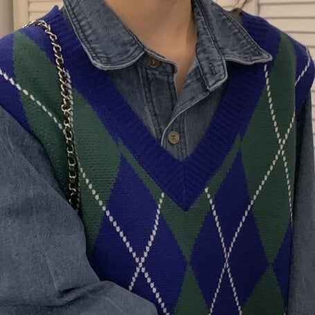 ダイア柄がアクセントになる、ブルーとグリーンのカラーリングがおしゃれなニットベストです。Vネックでスッキリとした印象になるデザインは、スリムなシルエットで女性らしいラインを引き立てます。また、セーターやシャツなどのアウターとのレイヤードスタイルにも合わせやすく、コーディネートの幅が広がります。
