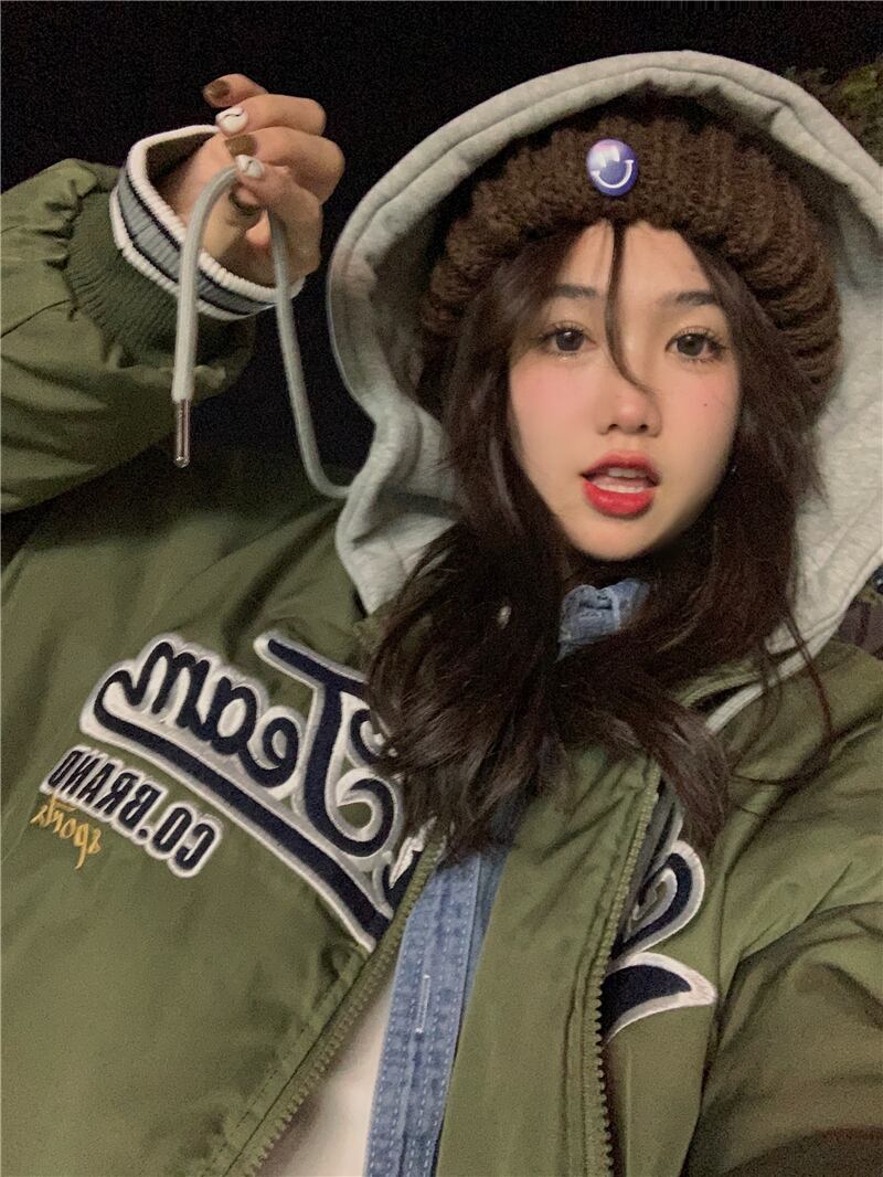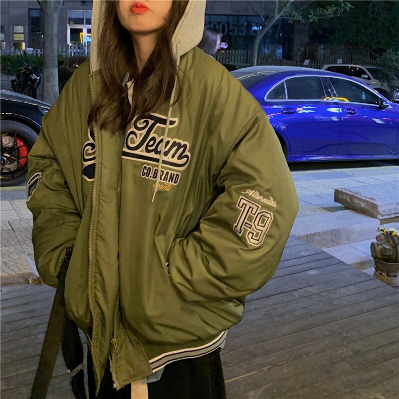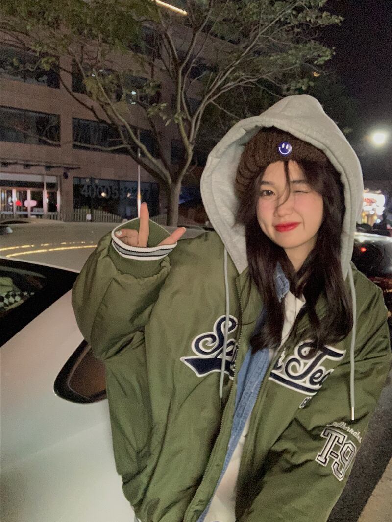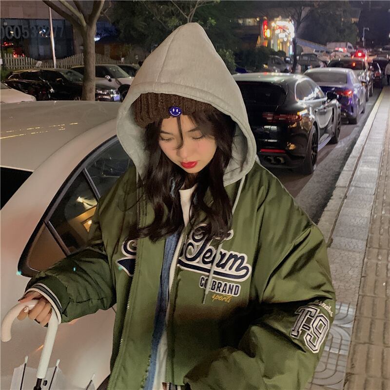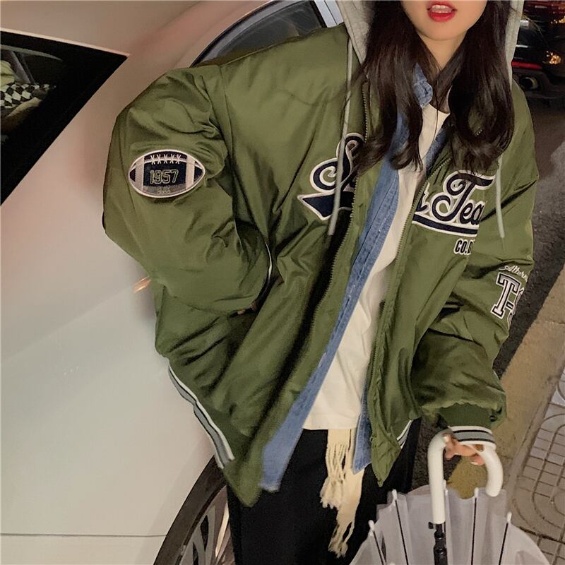 ベースボール ユニフォーム風コート シャンパー トップス もこもこアウター 袖あり 長袖 フード もこもこ モコモコ フード付き ファスナー ポケット 前開き 厚手 かわいい カジュアル かっこいい 大人可愛い メンズライク マニッシュ ボーイッシュ スポーティー ラブリー キュート 主役級 存在感 柄 秋 冬 10代 20代 30代 レディース 女性用 ママ 普段使い ファッション コーデ スタイル 楽ちん 暖かい 防寒 トレンド 流行 インスタ映え 緑 グリーン カーキ ユニセックス コットン