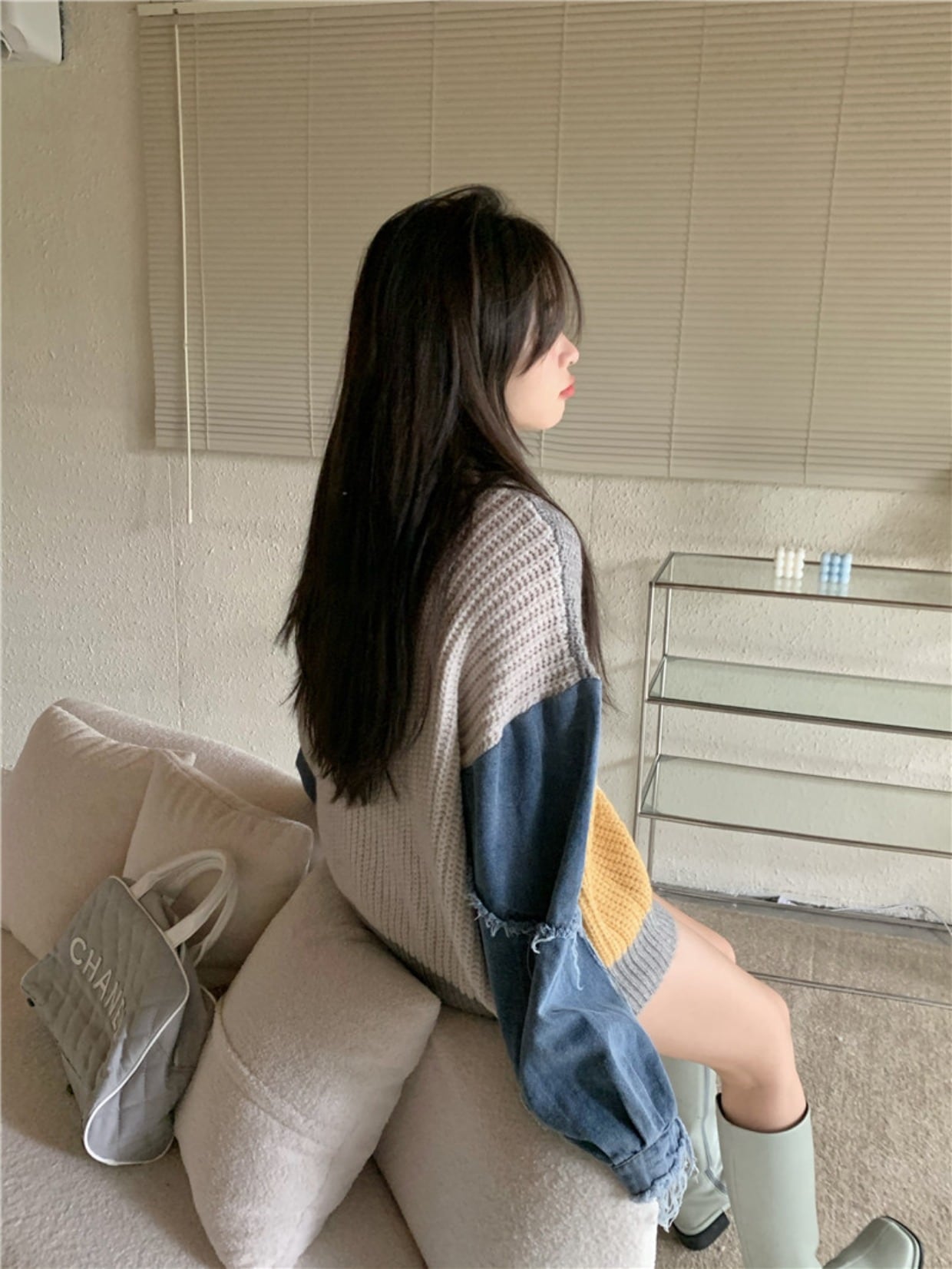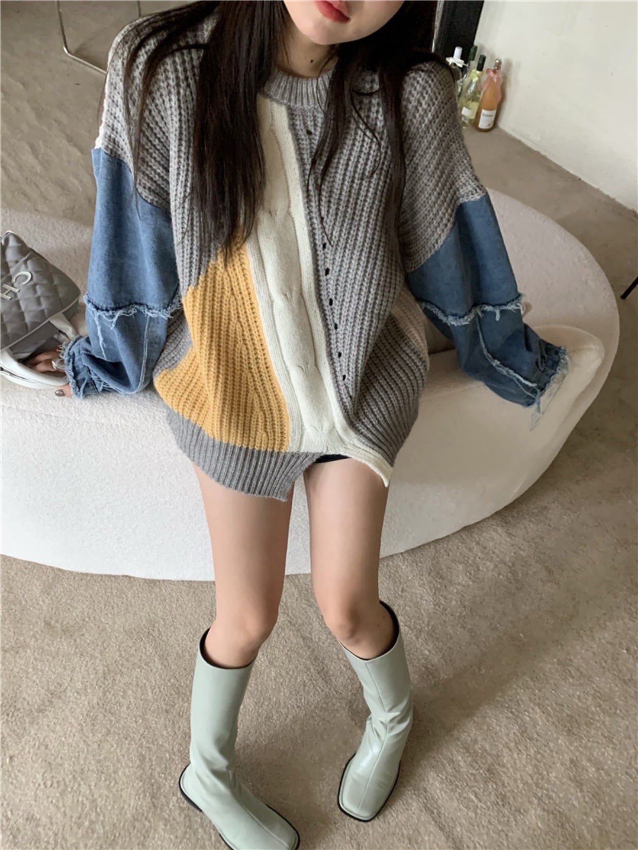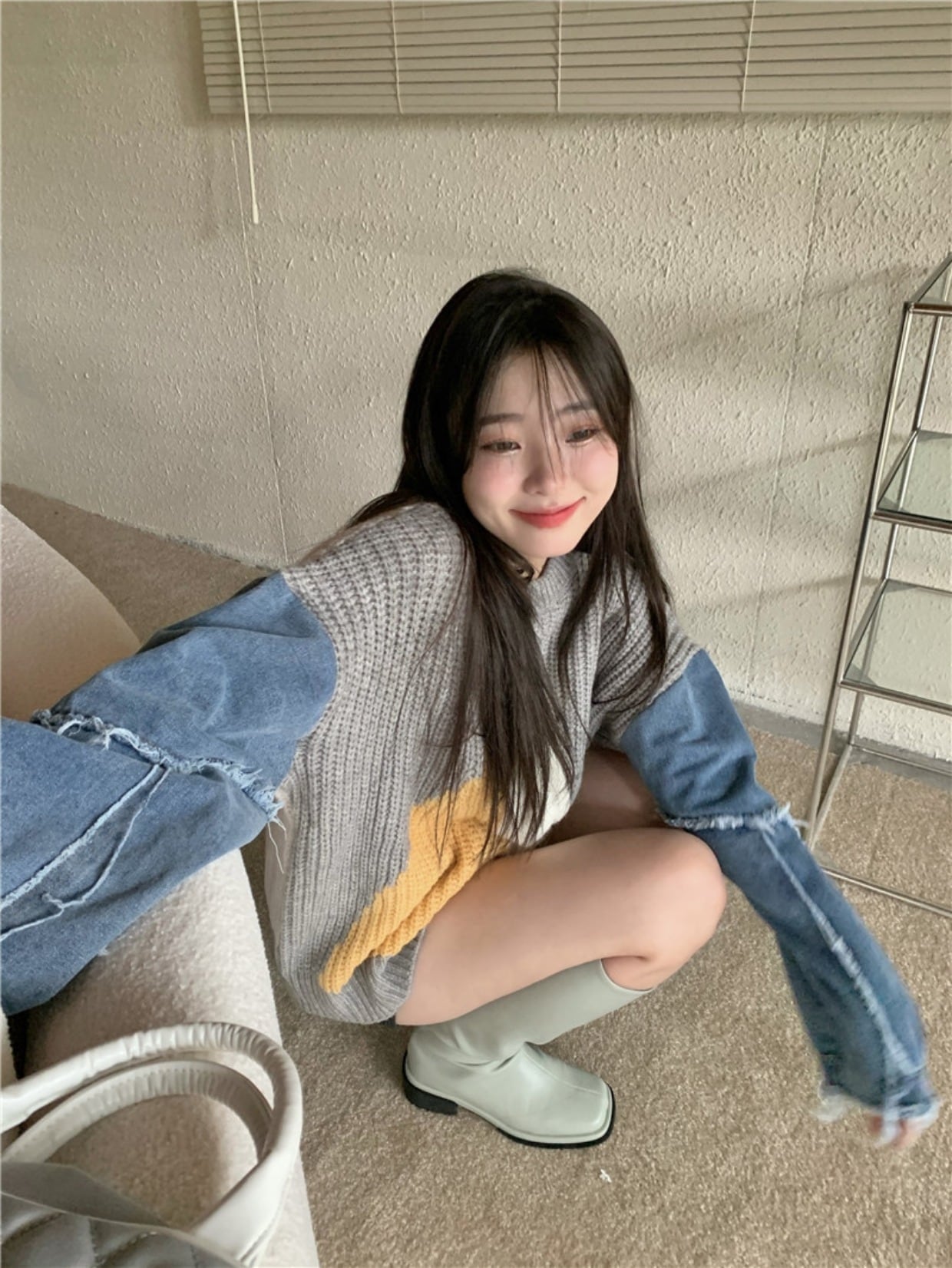 異素材ミックス セーター ニット グレー 灰色 ブラック 黒 デニム シャツ ジーンズ トップス 袖あり 長袖 ボリューム袖 ドロップショルダー 萌袖 Uネック ラウンドネック かわいい 大人可愛い きれいめ シンプル カジュアル おしゃれ お洒落 大人女子 こなれ感 キュート 主役級 存在感 秋 冬 2021 レディース 女性用 学生 通学 デート 休日 お出かけ 女子会 イベント 旅行 着回し 普段使い 定番 韓国系 モテ トレンド 流行 インスタ映え おすすめ インポート ワンサイズ フリーサイズ