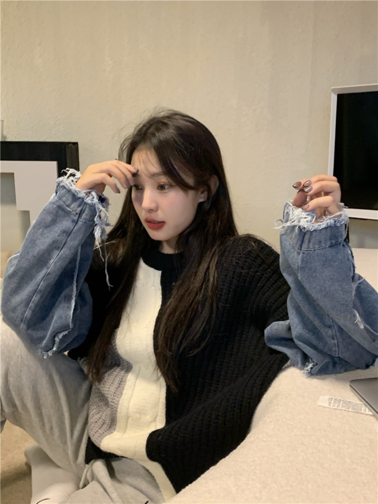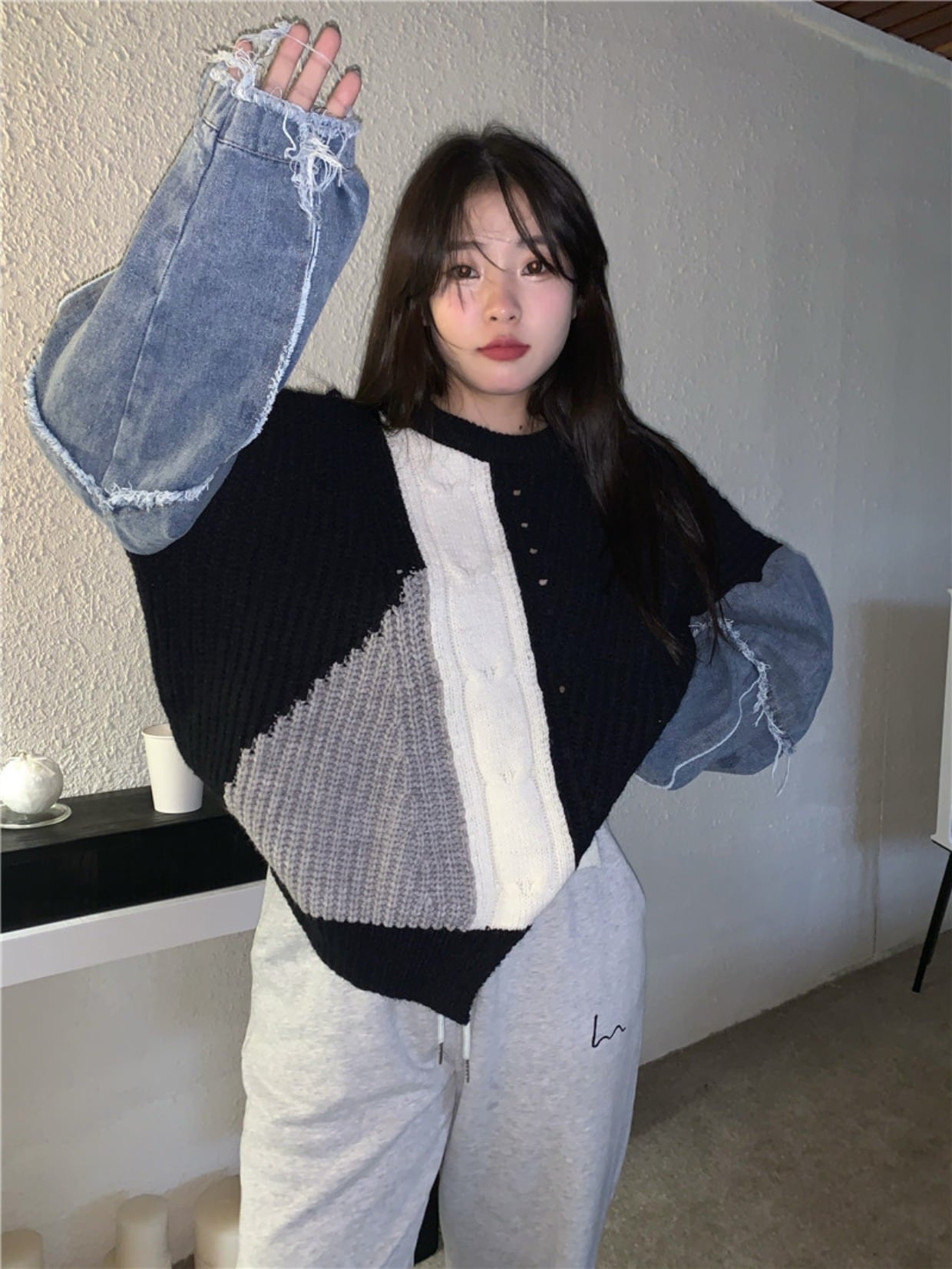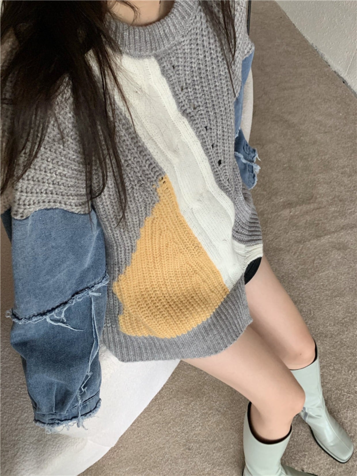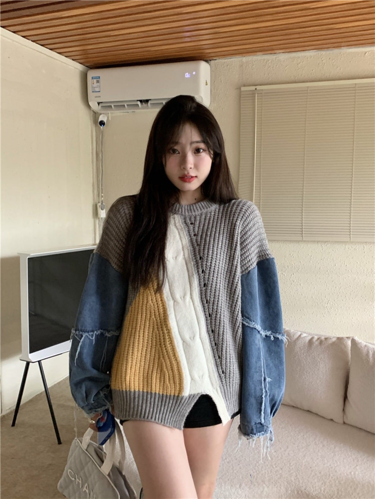 異素材ミックス セーター ニット グレー 灰色 ブラック 黒 デニム シャツ ジーンズ トップス 袖あり 長袖 ボリューム袖 ドロップショルダー 萌袖 Uネック ラウンドネック かわいい 大人可愛い きれいめ シンプル カジュアル おしゃれ お洒落 大人女子 こなれ感 キュート 主役級 存在感 秋 冬 2021 レディース 女性用 学生 通学 デート 休日 お出かけ 女子会 イベント 旅行 着回し 普段使い 定番 韓国系 モテ トレンド 流行 インスタ映え おすすめ インポート ワンサイズ フリーサイズ