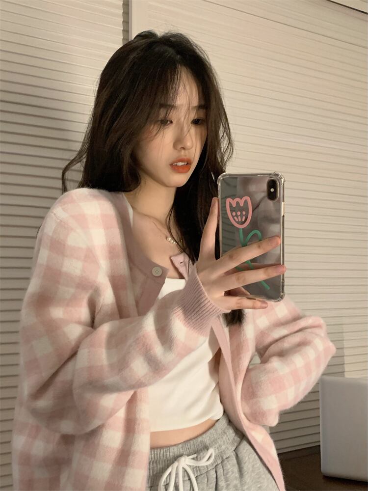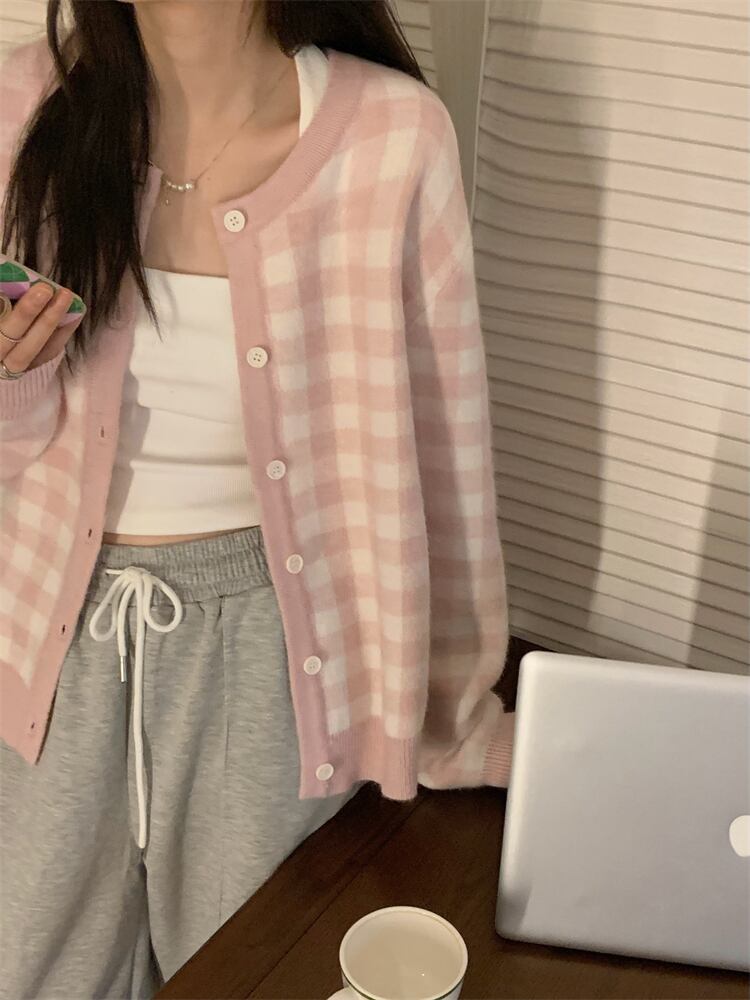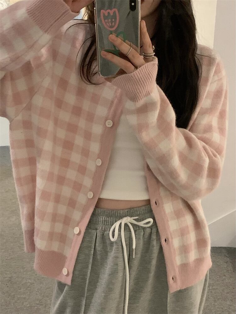 レトロ感のあるギンガムチェック柄が可愛いニットカーディガン。