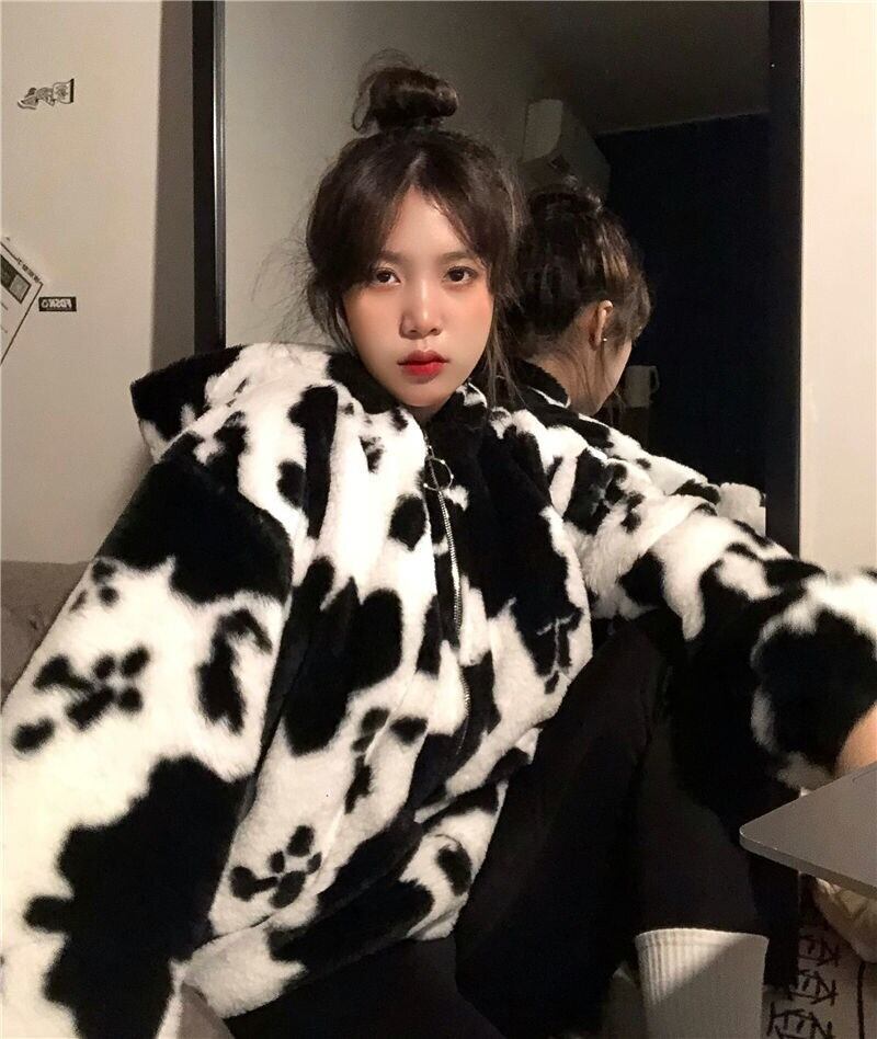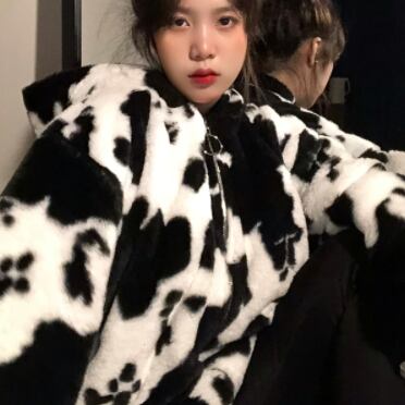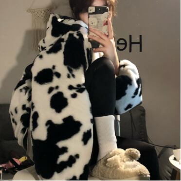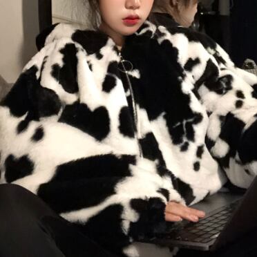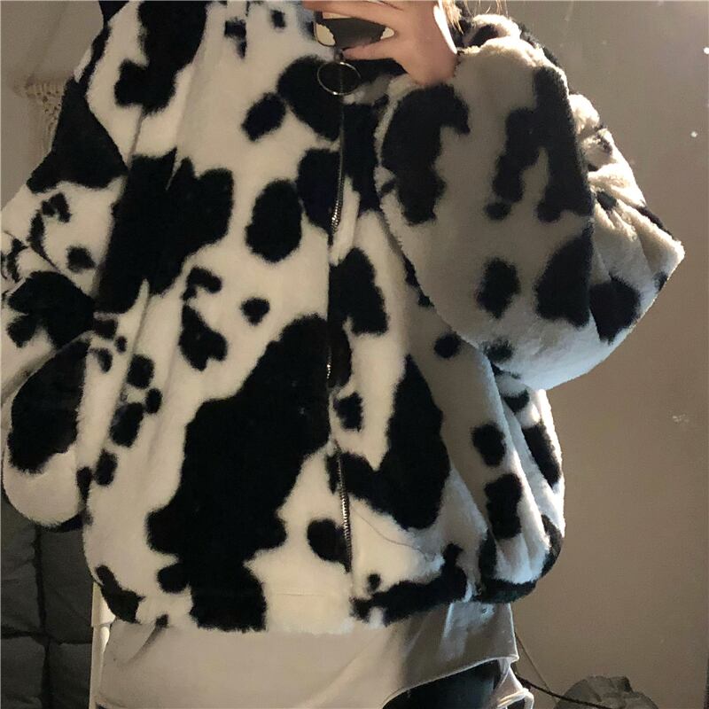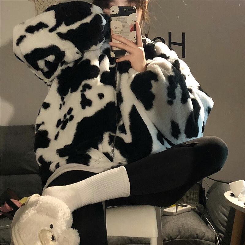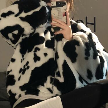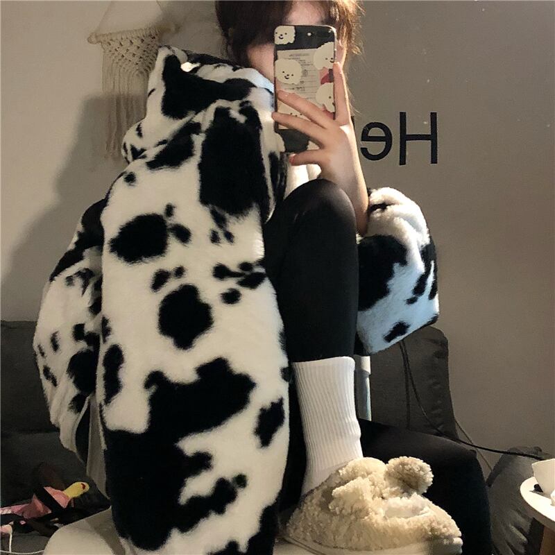 ジャケット アウター フーディー ブルゾン シャンパー もこもこアウター 長袖 襟なし ストレート もこもこ モコモコ ふわふわ フード付き ファスナー ポケット 前開き フリース ボア 厚手 かわいい カジュアル おしゃれ お洒落 かっこいい ラフ キュート ルーズ 個性的 主役級 存在感 牛柄 秋 冬 誕生日 クリスマス 10代 20代 学生 通学 デート お出かけ 女子会 休日 普段使い お揃い 双子 韓国系 ファッション コーデ スタイル 暖かい 防寒 インスタ映え フリーサイズ ゆったり