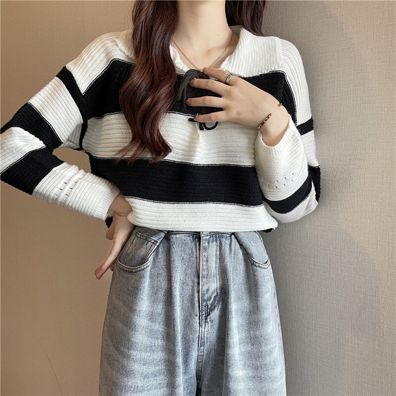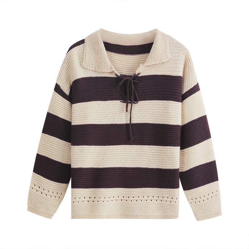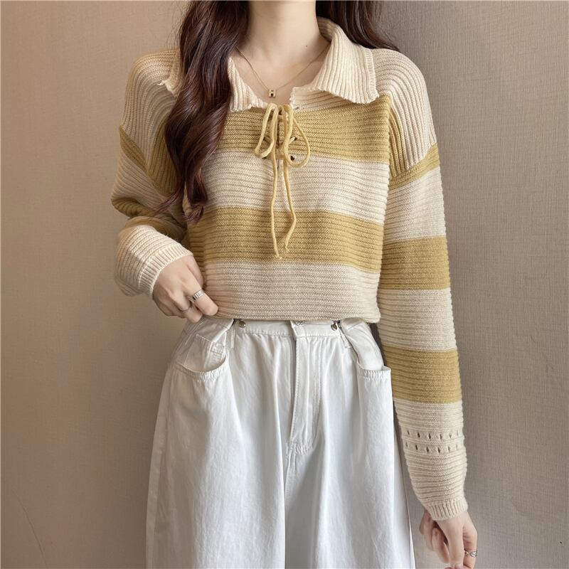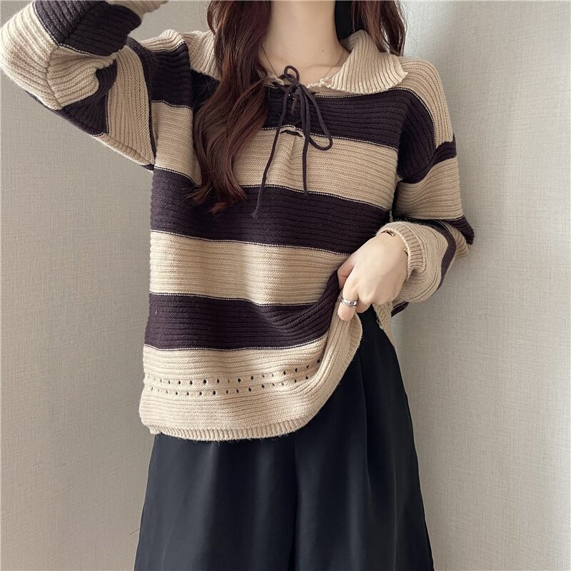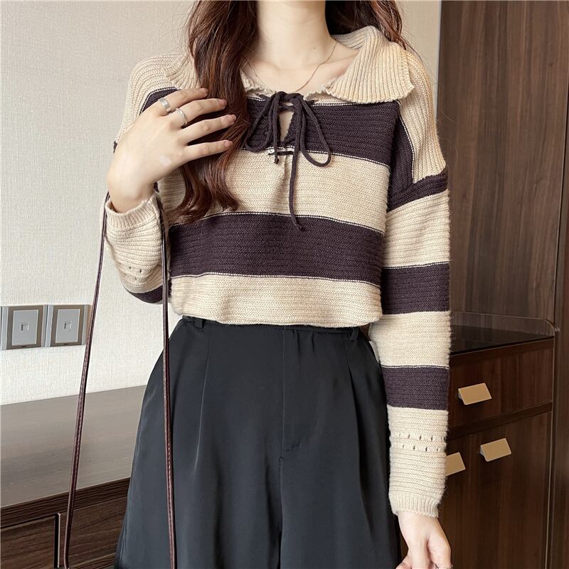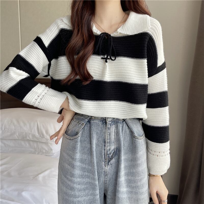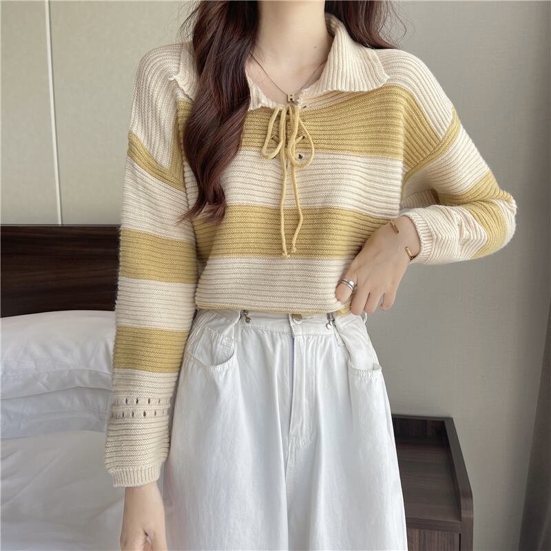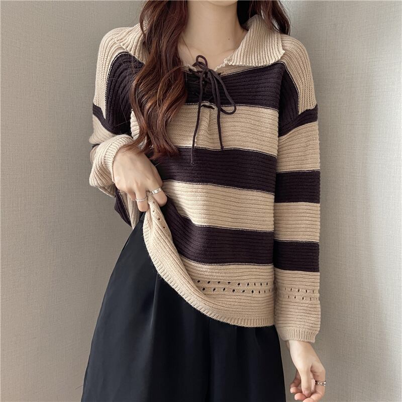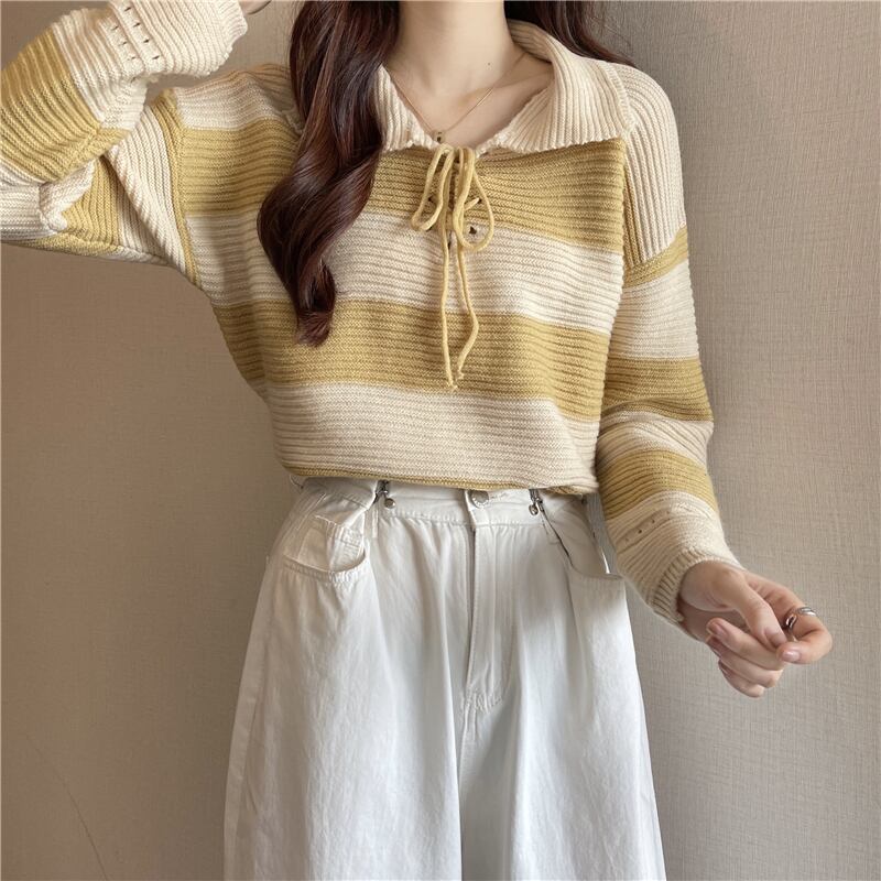 首元で蝶結びするレースアップデザインが可愛い太めボーダー柄の襟付きニットソー。