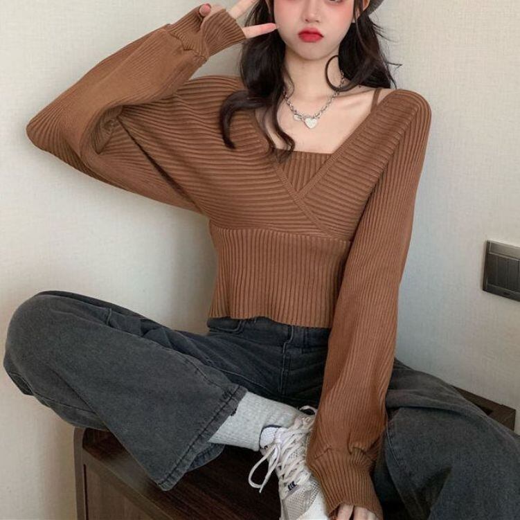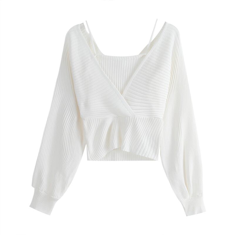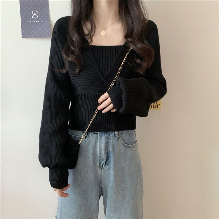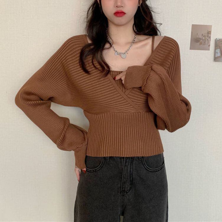 フェイクレイヤード アンサンブル風 ハイウエスト切り替え ドッキング トップス ニットソー セーター ショート丈 長袖 萌袖 Vネック 切り替えデザイン リブ ニット きれいめ シンプル カジュアル おしゃれ かっこいい 大人女子 こなれ感 セクシー 無地 春 秋 冬 2021 レディース 女性用 ママ 女の子 通勤 学生 通学 デート お出かけ 女子会 休日 着回し 普段使い 韓国系 オルチャン ファッション コーデ スタイル 楽ちん モテ 新作 フリーサイズ 大きめ ゆったり ゆる 新作