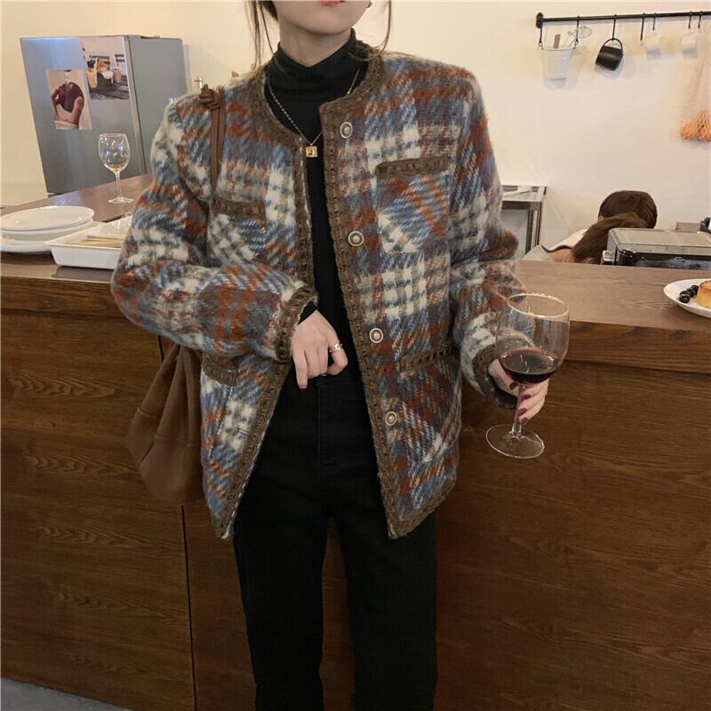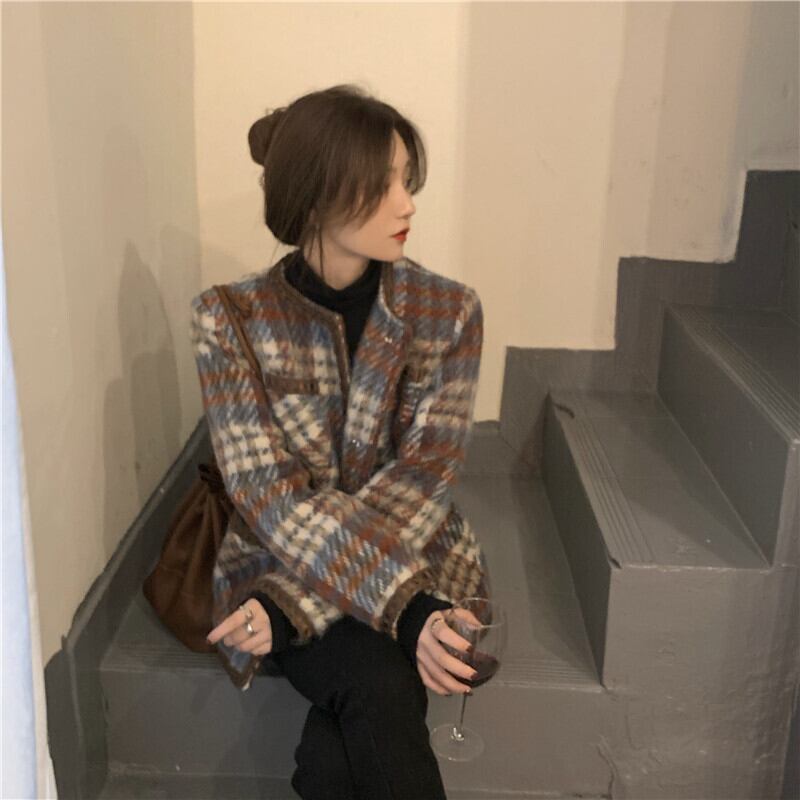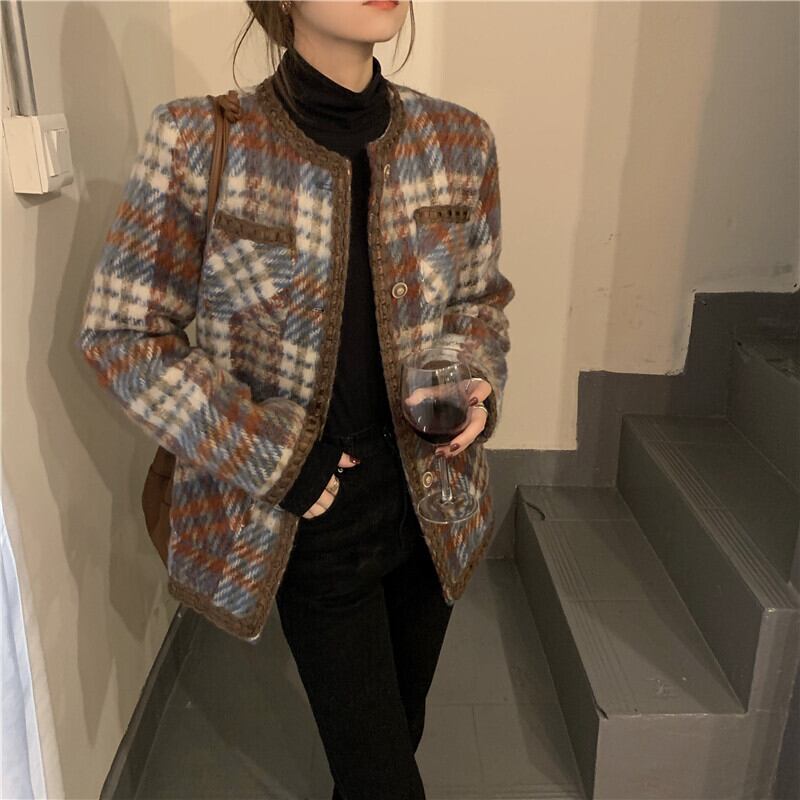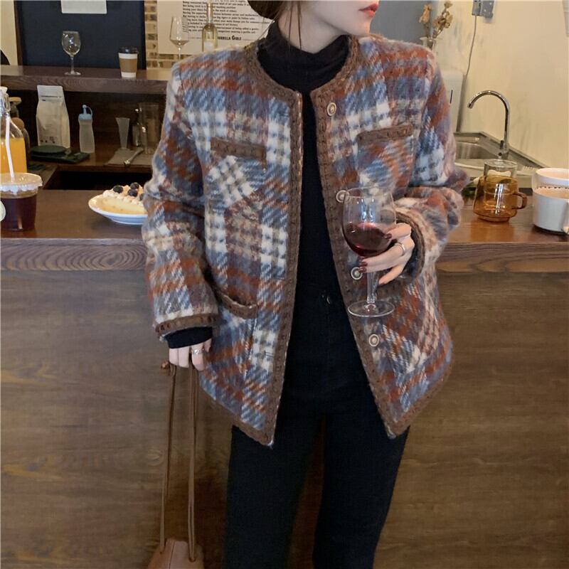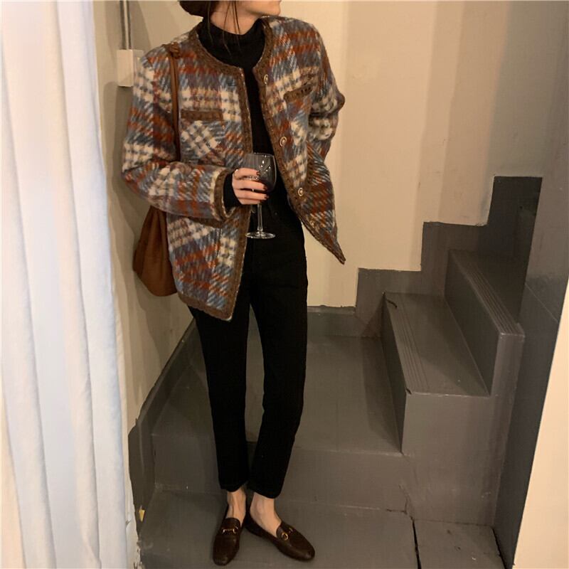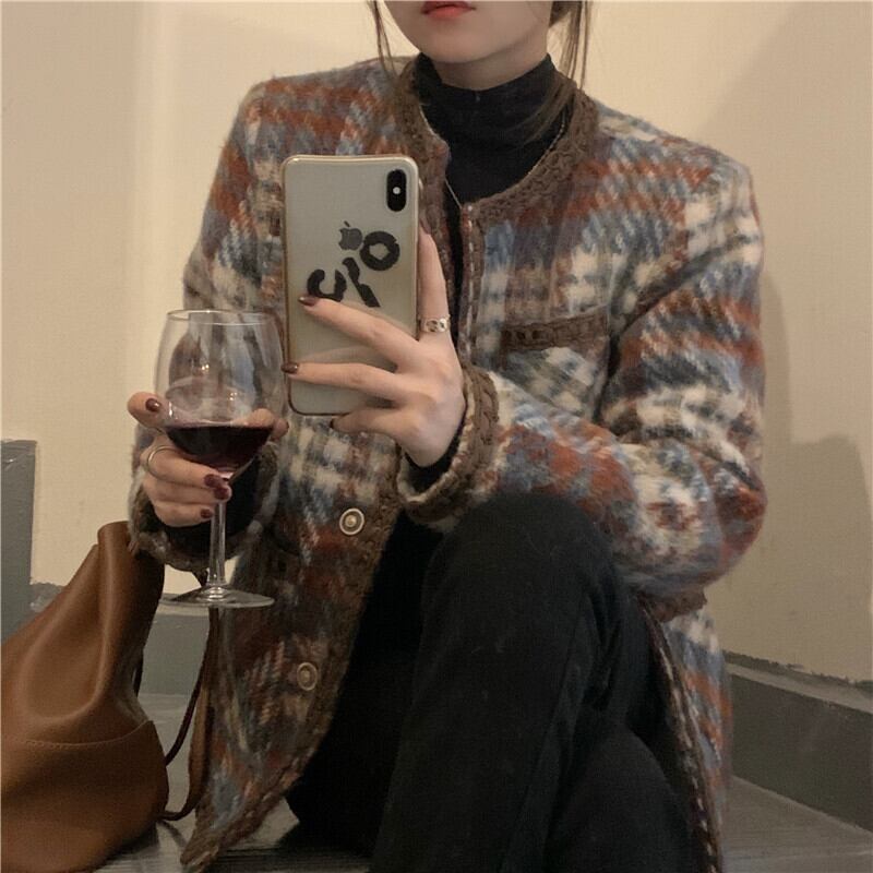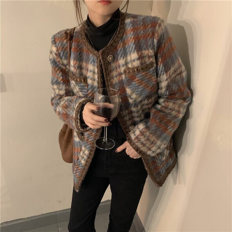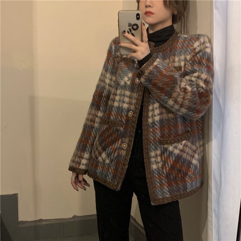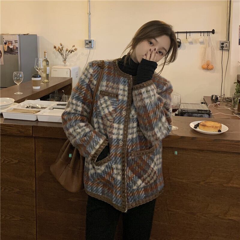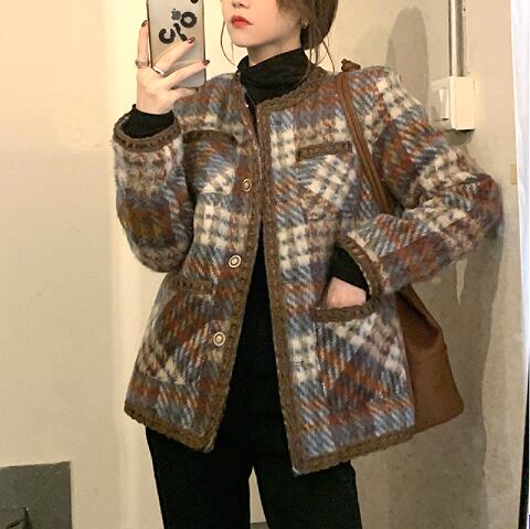 コート アウター ジャケット 上着 茶色 ブラウン ミディアム丈 長袖 ラウンドネック 襟なし ふわふわ ポケット 前開き ボタン ウール 厚手 大人可愛い きれいめ 大人 おしゃれ かっこいい レトロ 大人女子 こなれ感 個性的 エレガント 主役級 存在感 フォーマル チェック柄 秋 冬 謝恩会 二次会 クリスマス バレンタイン 10代 20代 OL 通勤 学生 通学 デート お出かけ 女子会 休日 ホテル レストラン 着回し 普段使い 韓国系 ファッション コーデ スタイル 暖かい フリーサイズ