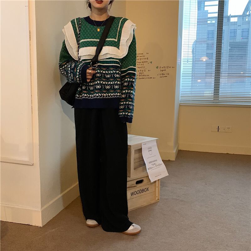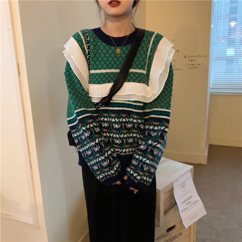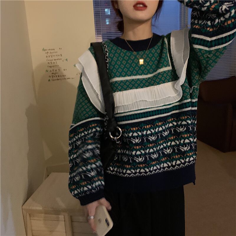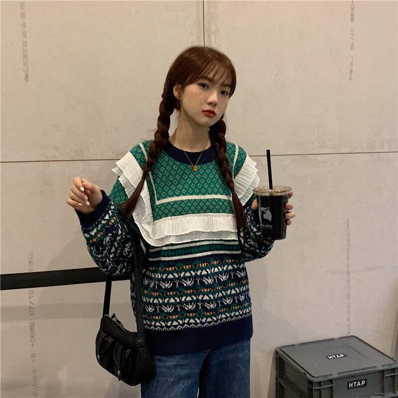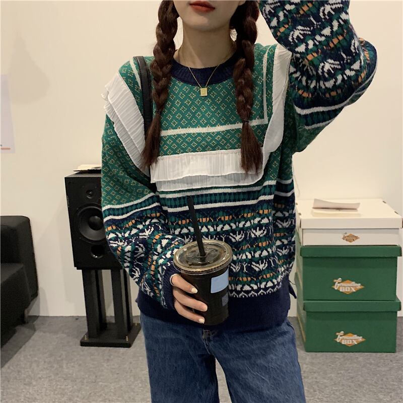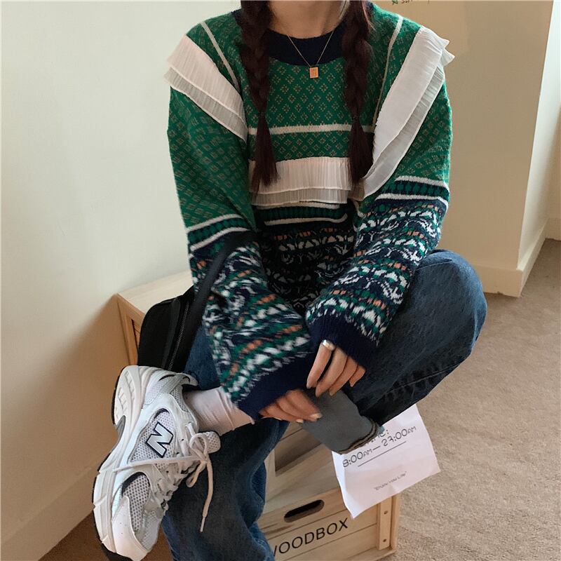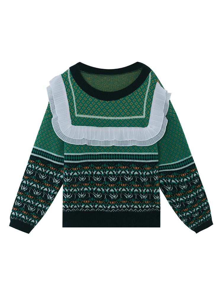 オーバーサイズ ヨーク2段フリル 模様編み 配色 トップス セーター プルオーバー ミディアム丈 長袖 ドロップショルダー クルーネック フリル 切り替えデザイン ニット 異素材MIX かわいい 大人可愛い カジュアル おしゃれ お洒落 レトロ こなれ感 個性的 存在感 秋 冬 2022 レディース 女性用 女の子 ママ お出かけ 公園デビュー 女子会 休日 普段使い 韓国系 オルチャン ファッション スタイル 楽ちん 暖かい 体系カバー フリーサイズ 大きめ ゆったり ゆる サイズ グリーン