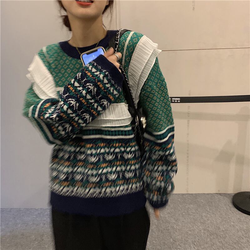 上半分はダイヤ柄・下半分は植物柄風のパターンの切り替えデザインが個性的なレトロムードのニット。