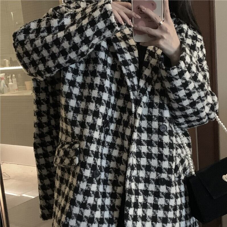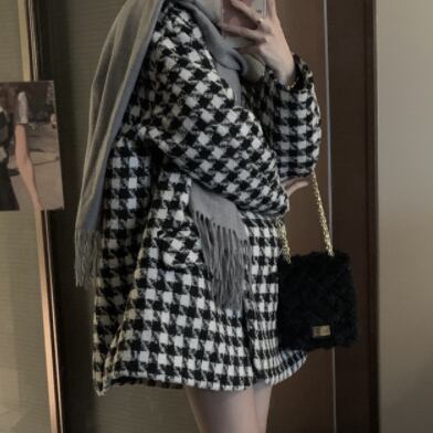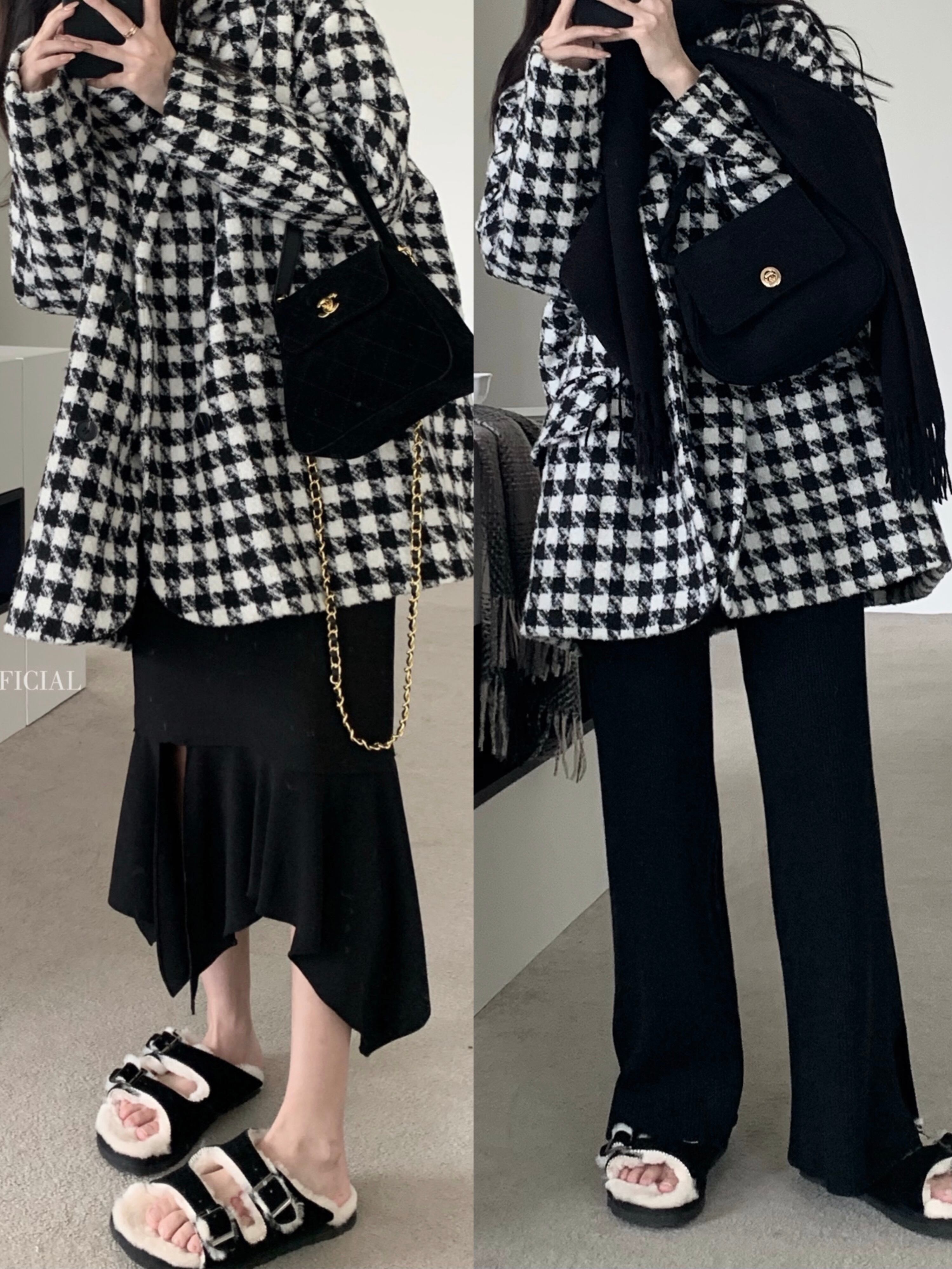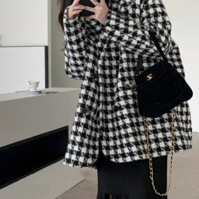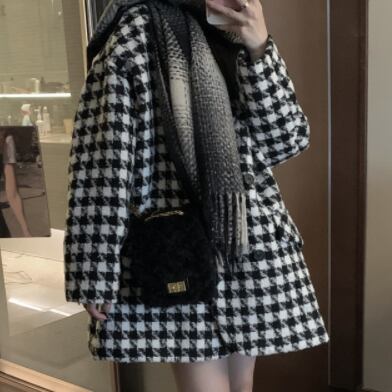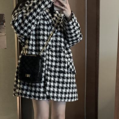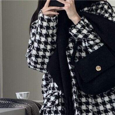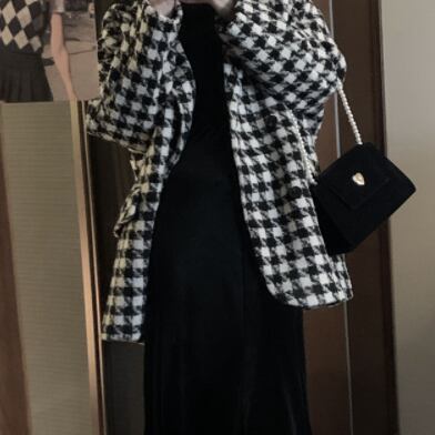華麗な千鳥柄が印象的な、ブラックとホワイトの上品なコートです。さまざまなシーンで使いやすいデザインで、通学やデート、パーティーなど、あらゆる場面で活躍してくれます。