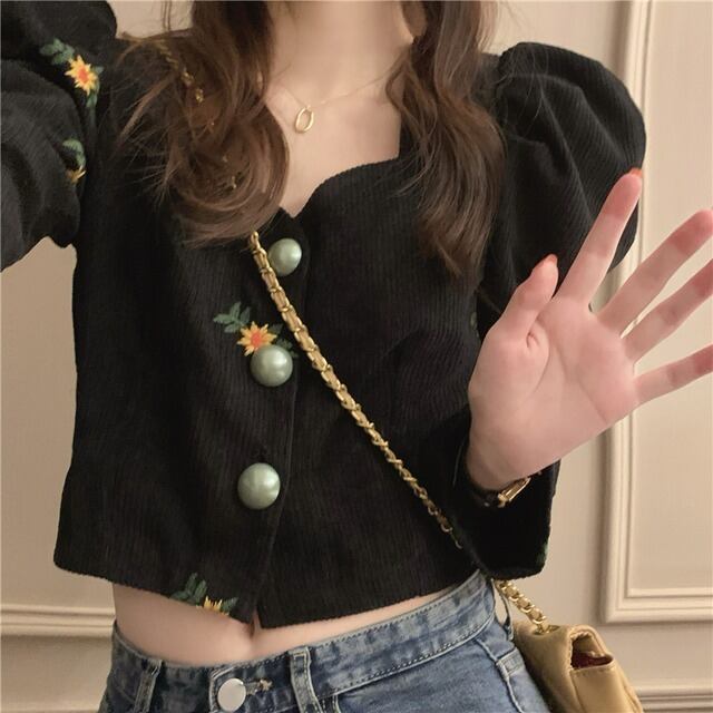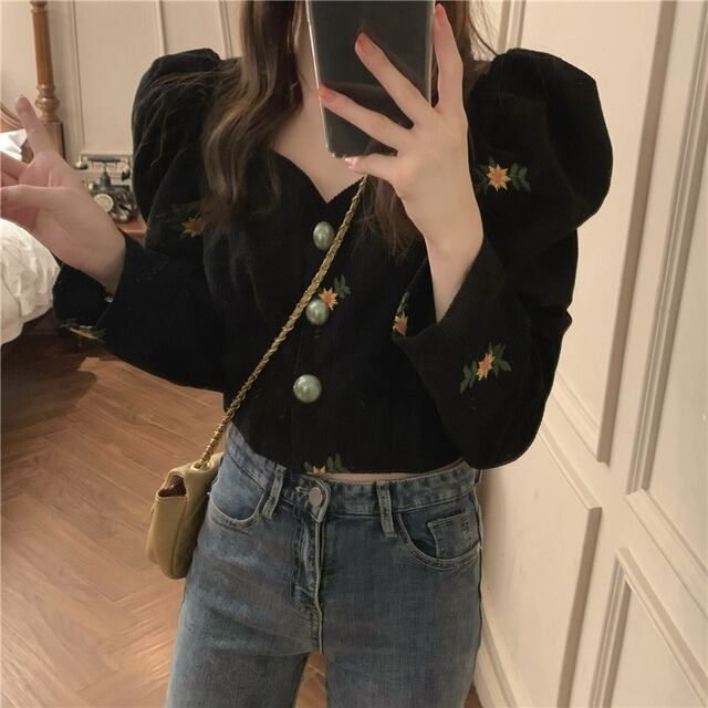 ブラウス シャツ 白 ホワイト 黒 ブラック 袖あり 長袖 ベルスリーブ パフスリーブ トップス レディース 襟なし ボタン 前開き へそ出し かわいい 大人可愛い 大人 大人女子 きれいめ おしゃれ お洒落 シンプル ラブリー キュート ガーリー フェミニン 10代 20代 30代 通勤 学生 通学 デート お出かけ 女子会 休日 普段使い カジュアル こなれ感 ルーズ 抜け感 ゆる 披露宴 パーティー イベント ひまわり ヒマワリ 向日葵 フローラル 花柄 小花柄 フラワー ボタニカル