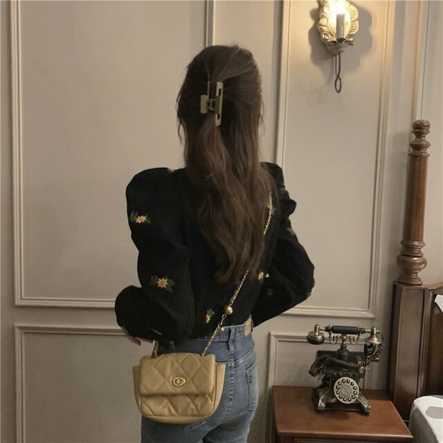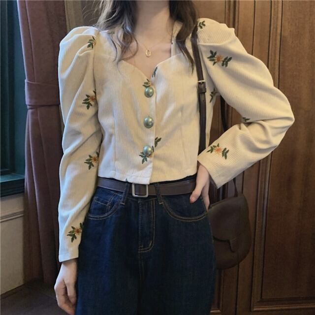 控えめな花柄刺繍のブラウスです。