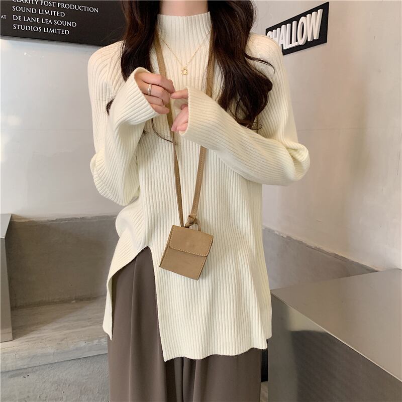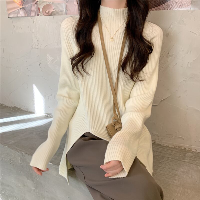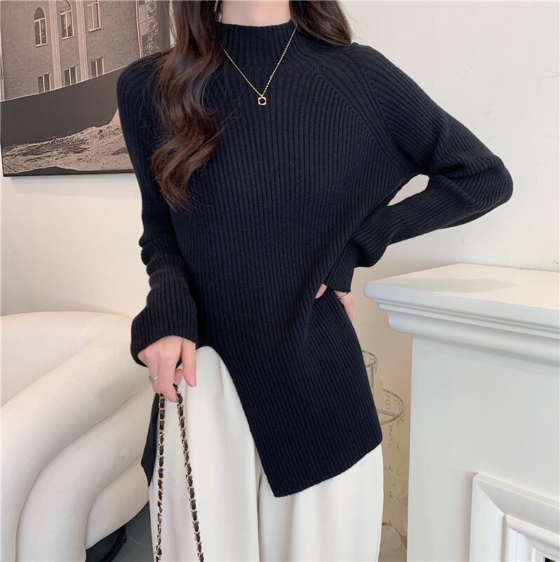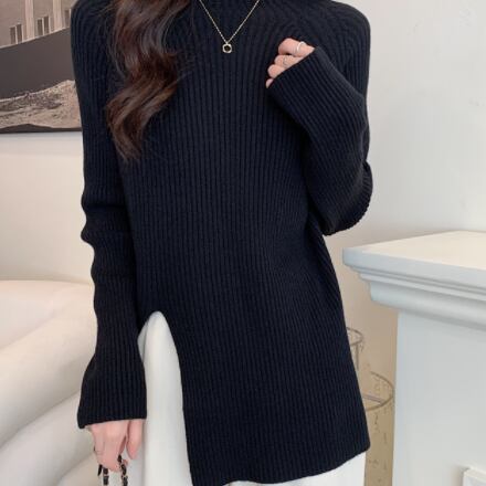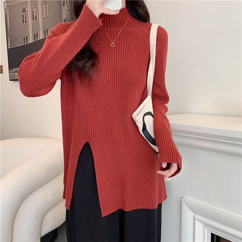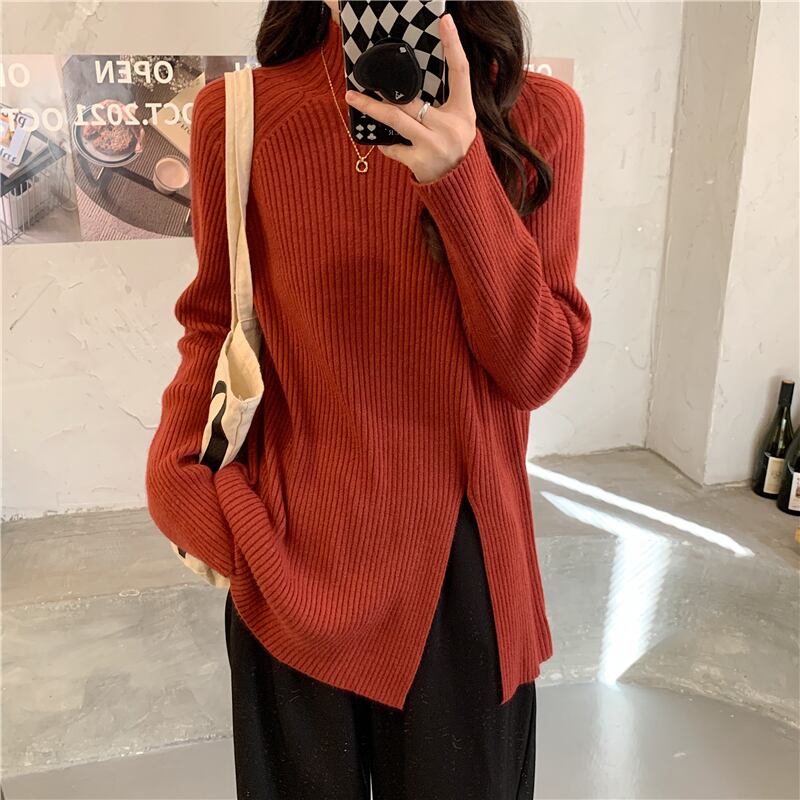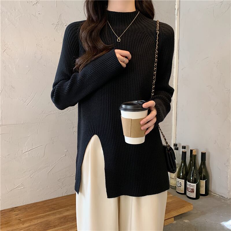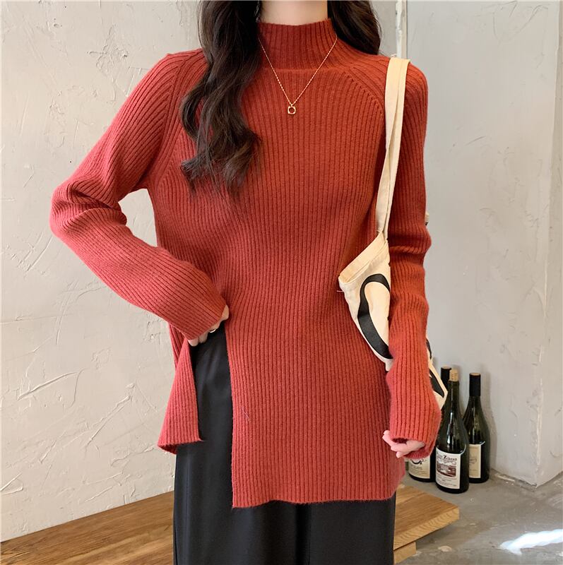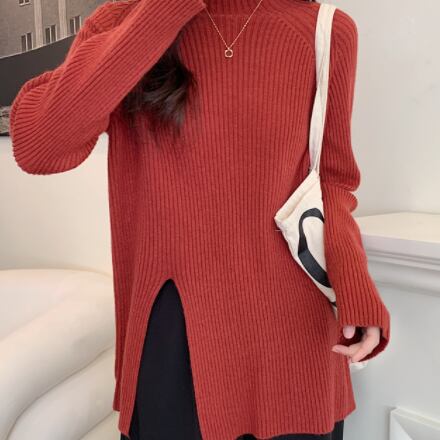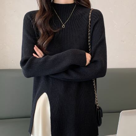 スリット入り モックネック トップス ニットソー セーター プルオーバー ミディアム丈 長袖 萌袖 ハイネック リブニット 伸縮性 ニット かわいい きれいめ シンプル カジュアル 上品 おしゃれ お洒落 大人女子 こなれ感 抜け感 無地 春 秋 冬 2021 レディース 女性用 ママ 女の子 通勤 学生 通学 デート お出かけ 公園デビュー 女子会 休日 着回し 普段使い 重ね着 韓国系 オルチャン ファッション スタイル 楽ちん 新作 フリーサイズ ブラック レッド オフホワイト