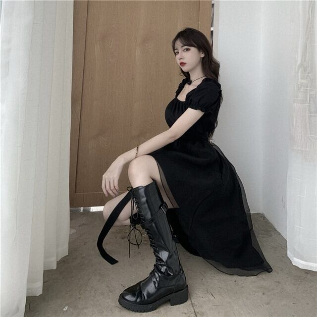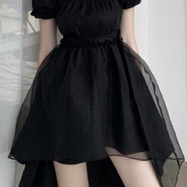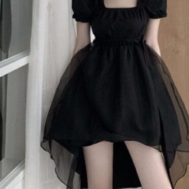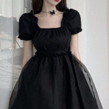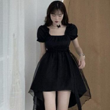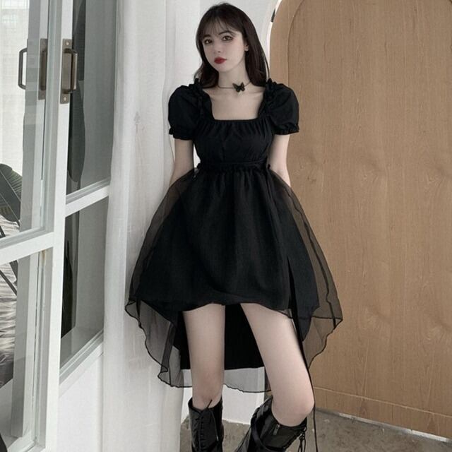ブラックドレス パフスリーブ 半袖 スクエアネック 無地 単色 黒 ミニ丈 フィッシュテール ゴシック風 クラシカル 小悪魔アイテム モノトーンコーデ レディース チュールスカート プリンセスライン ハイウエスト バックルベルト ふんわりスカート デコルテ見せ フレアスカート パーティー 韓国服 韓国ファッション インポート 低価格 お買い得 プチプラ トレンド おしゃれ デコルテギャザー クールフェミニン フェミニンドレス ドラマチック 女の子っぽい 乙女系 姫系 コスプレ ステージ 衣装 S M L