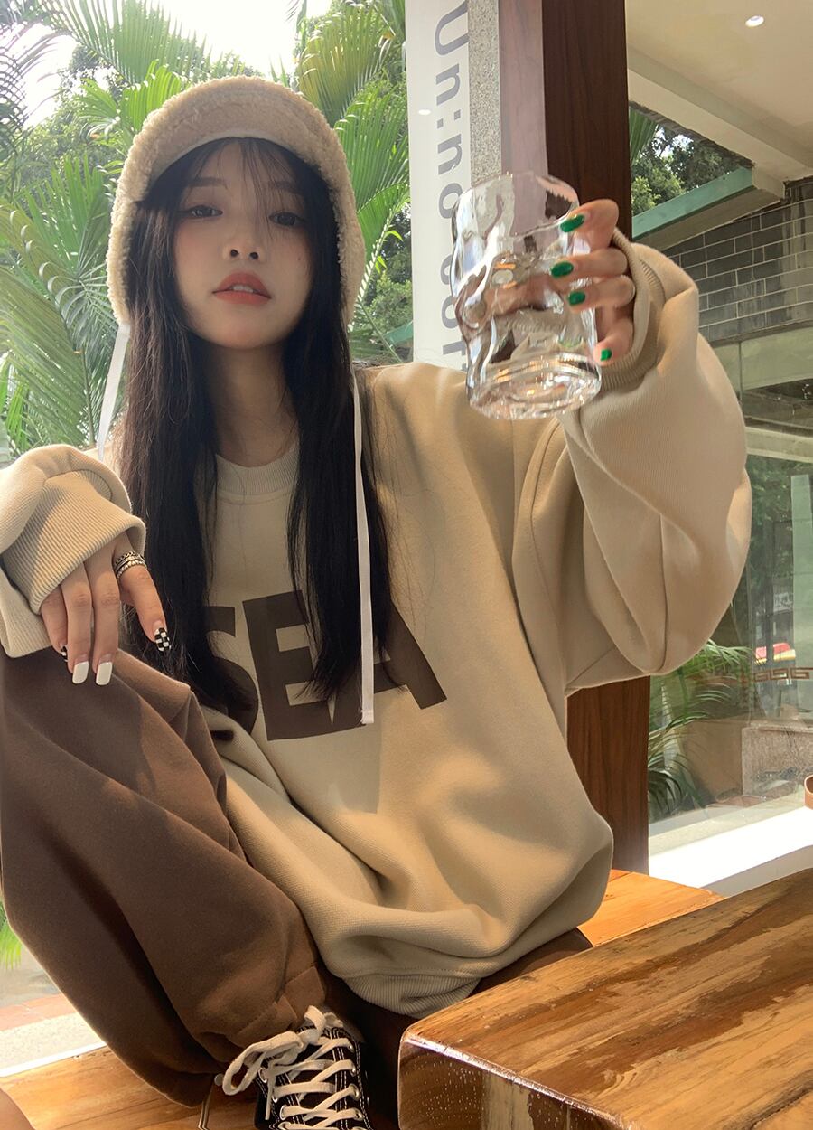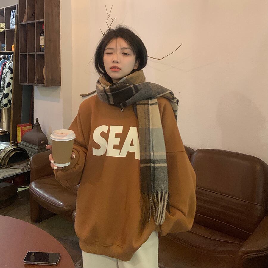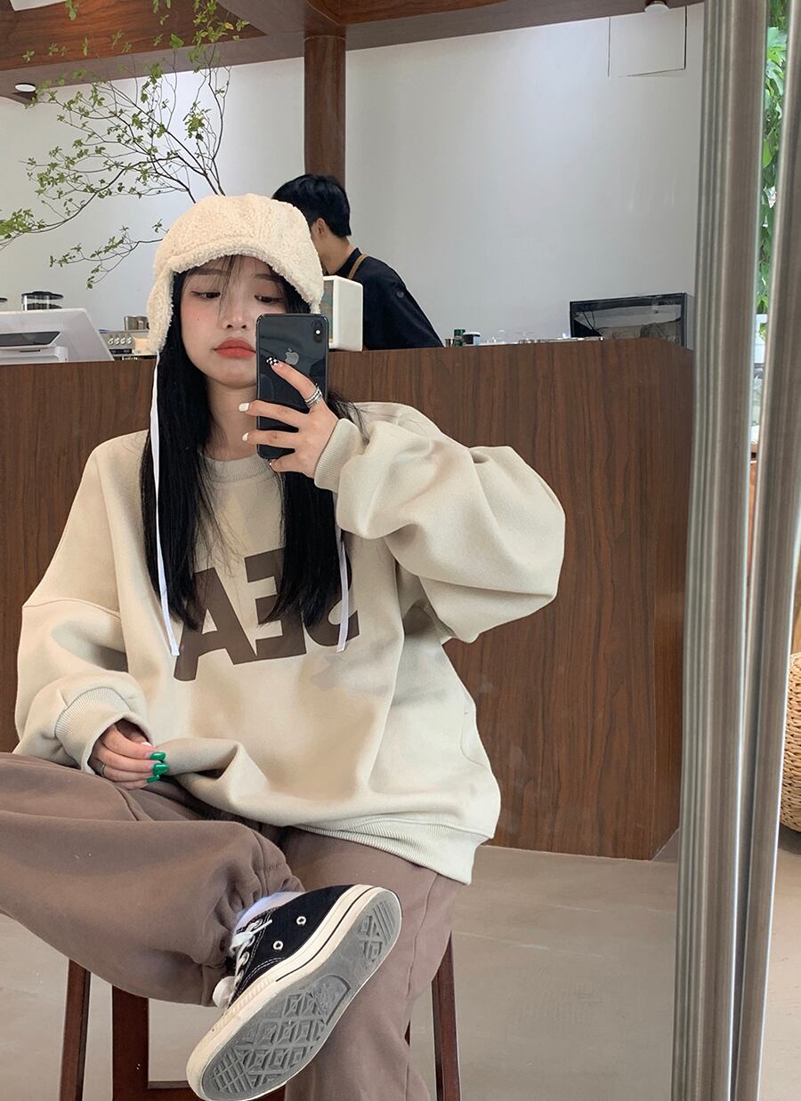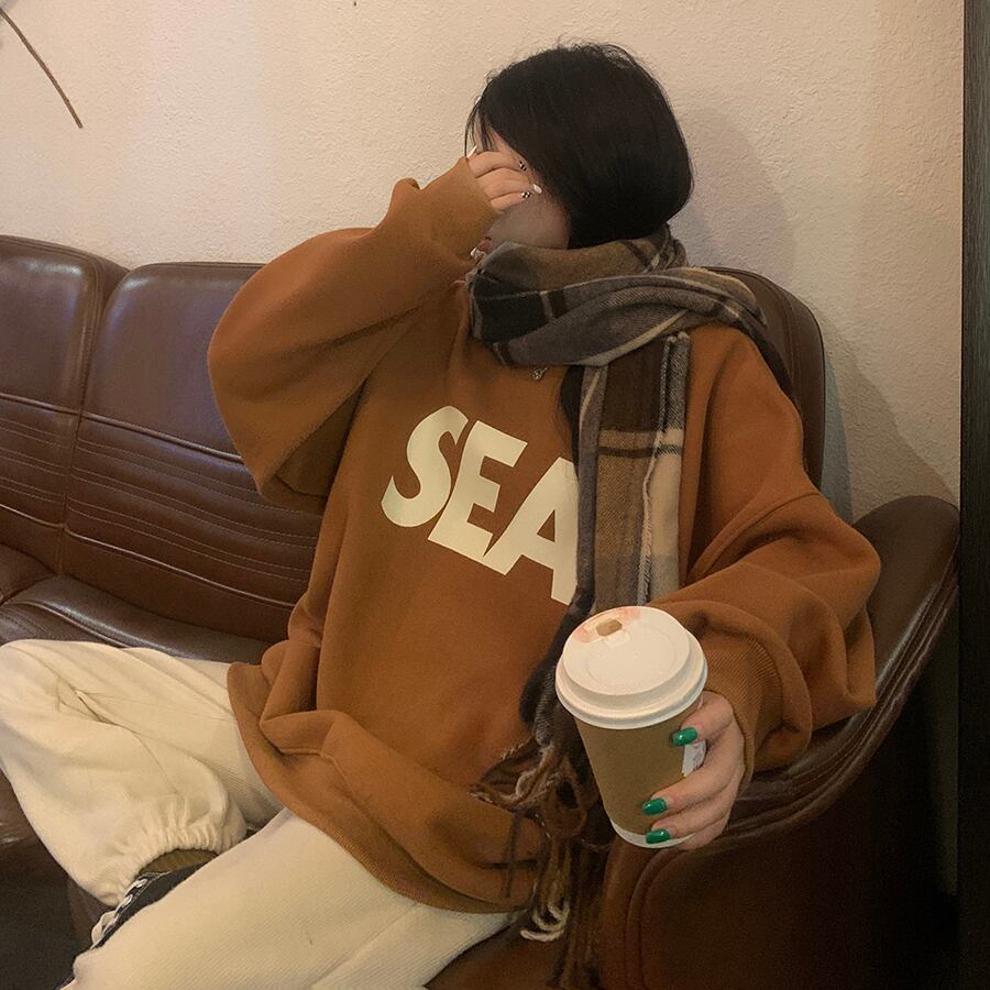 トレーナー シンプル トップス セーター アプリコット オレンジ ミディアム丈 袖あり 長袖 ラウンドネック ワイド 大人女子 大人 上品 おしゃれ カジュアル レトロ レトロ風 こなれ感 ラフ ルーズ シルエット 主役級 存在感 柄 アルファベット 文字 秋 冬 10代 20代 30代 レディース 女性用 ママ 学生 通学 デート お出かけ 女子会 運動 アウトドア 動きやすい 休日 おうち 着回し 普段使い トレンド ファッション コーデ ワンサイズ