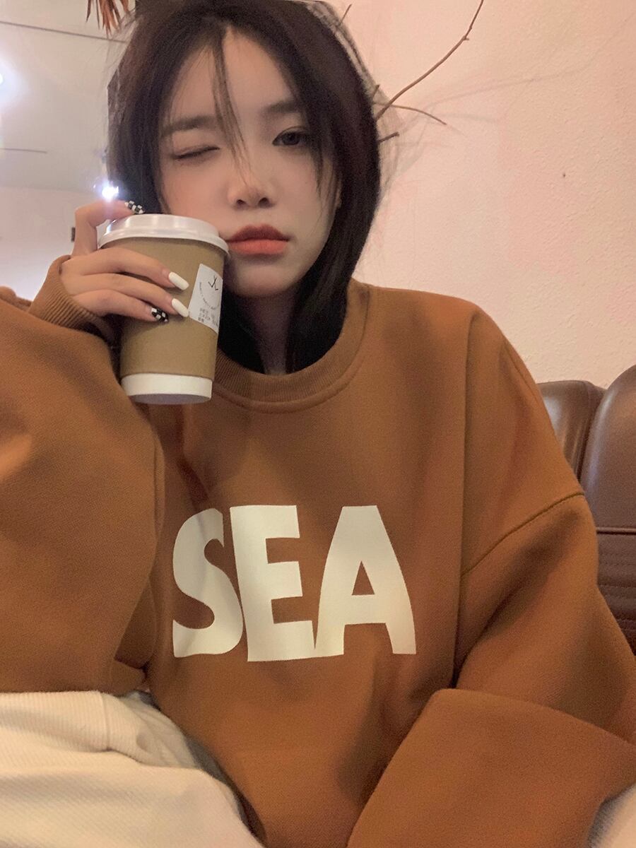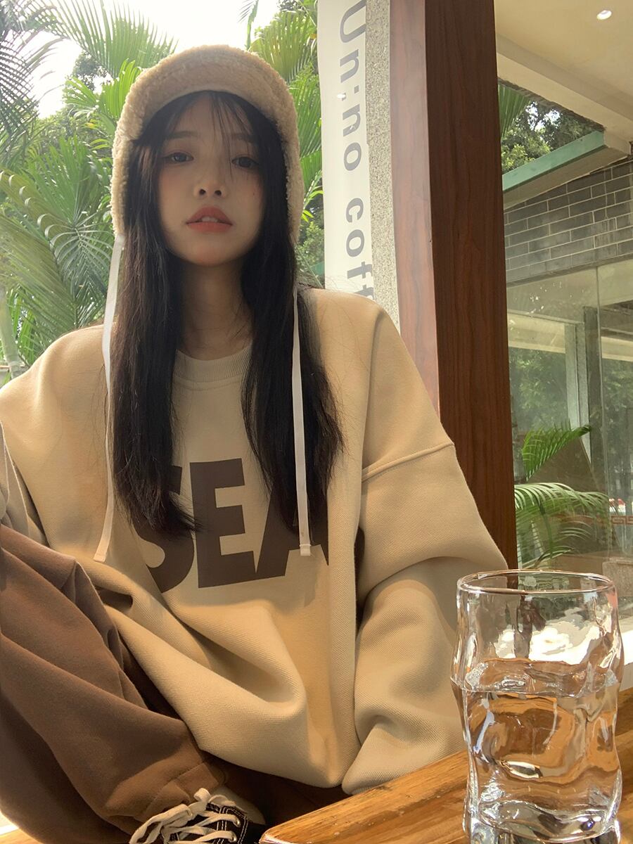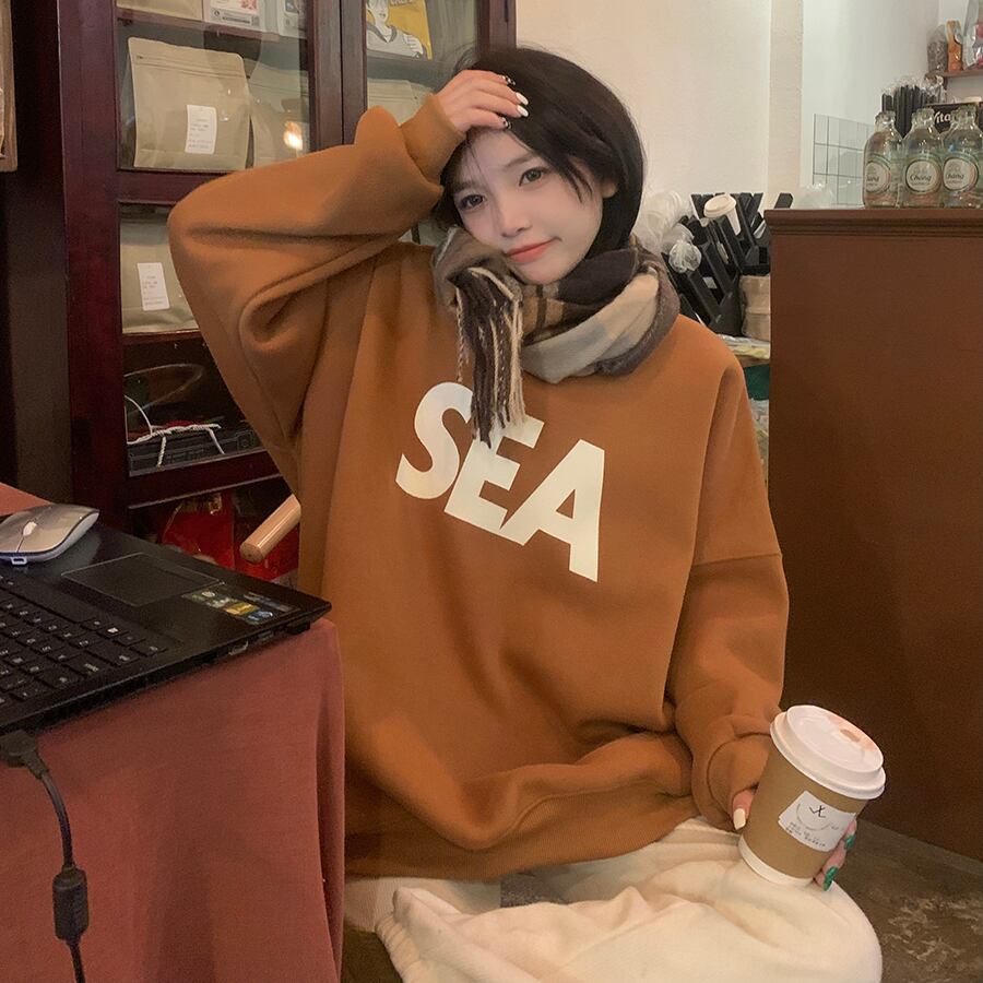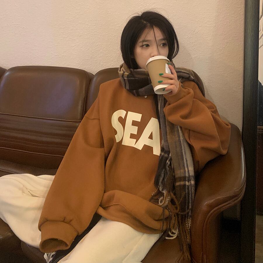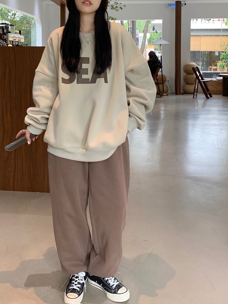 トレーナー シンプル トップス セーター アプリコット オレンジ ミディアム丈 袖あり 長袖 ラウンドネック ワイド 大人女子 大人 上品 おしゃれ カジュアル レトロ レトロ風 こなれ感 ラフ ルーズ シルエット 主役級 存在感 柄 アルファベット 文字 秋 冬 10代 20代 30代 レディース 女性用 ママ 学生 通学 デート お出かけ 女子会 運動 アウトドア 動きやすい 休日 おうち 着回し 普段使い トレンド ファッション コーデ ワンサイズ