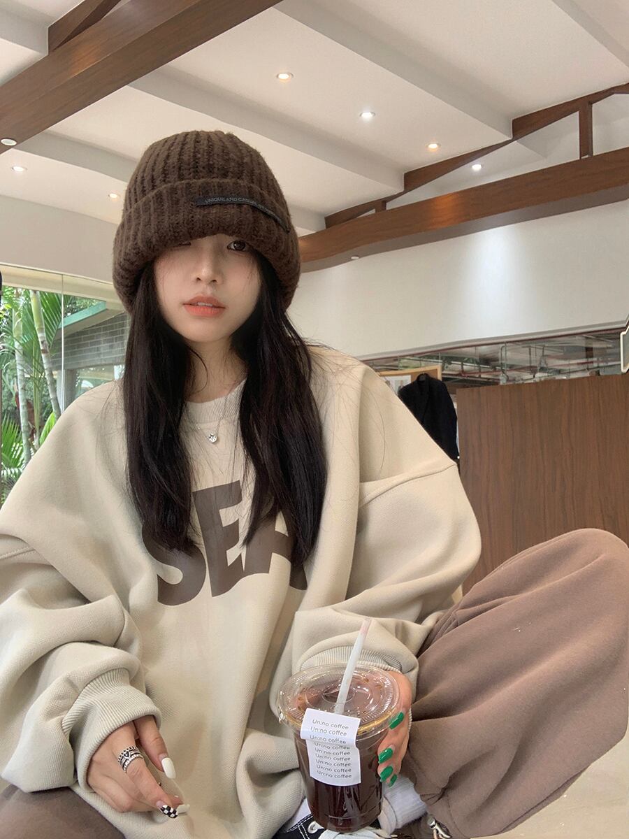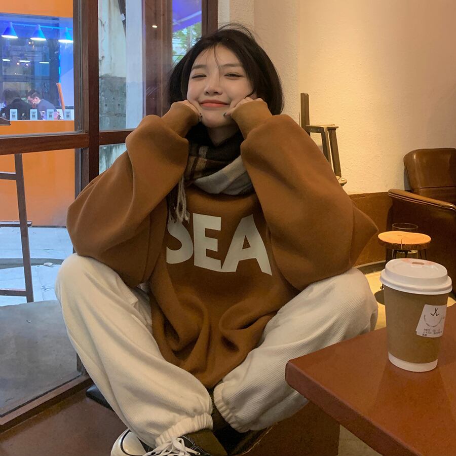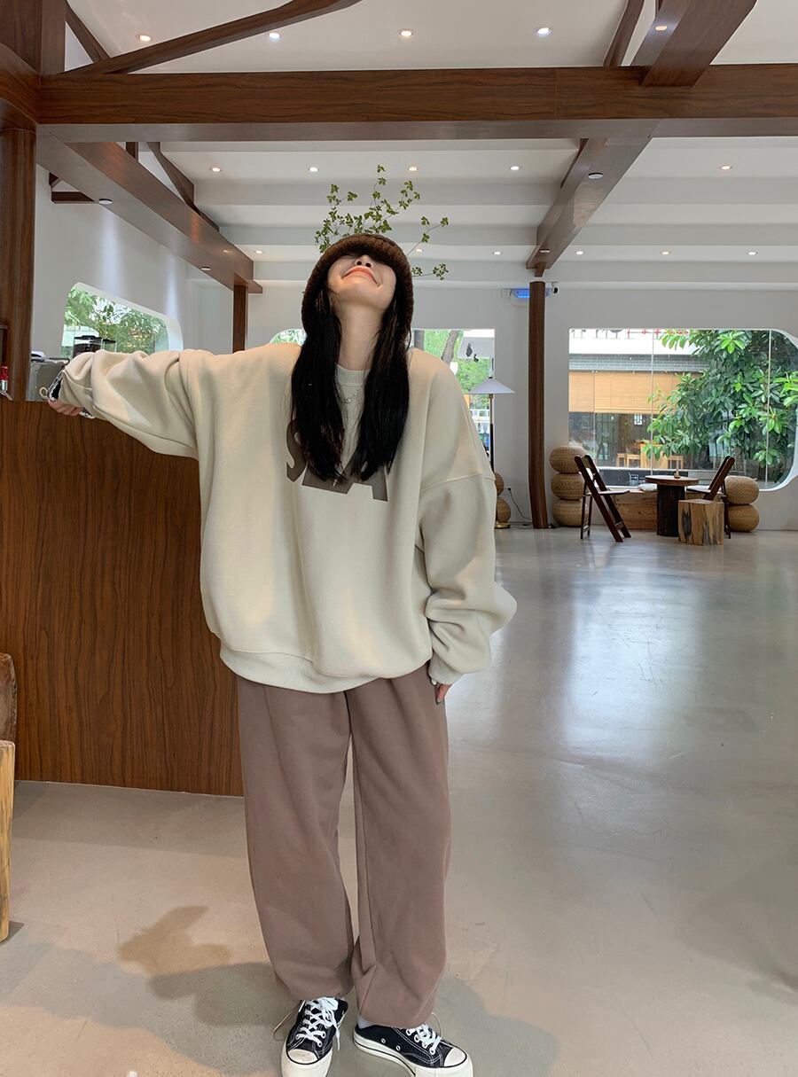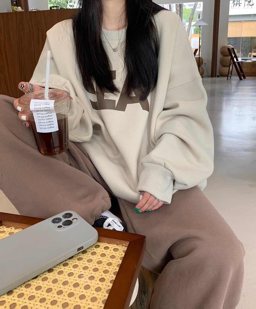 トレーナー シンプル トップス セーター アプリコット オレンジ ミディアム丈 袖あり 長袖 ラウンドネック ワイド 大人女子 大人 上品 おしゃれ カジュアル レトロ レトロ風 こなれ感 ラフ ルーズ シルエット 主役級 存在感 柄 アルファベット 文字 秋 冬 10代 20代 30代 レディース 女性用 ママ 学生 通学 デート お出かけ 女子会 運動 アウトドア 動きやすい 休日 おうち 着回し 普段使い トレンド ファッション コーデ ワンサイズ