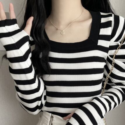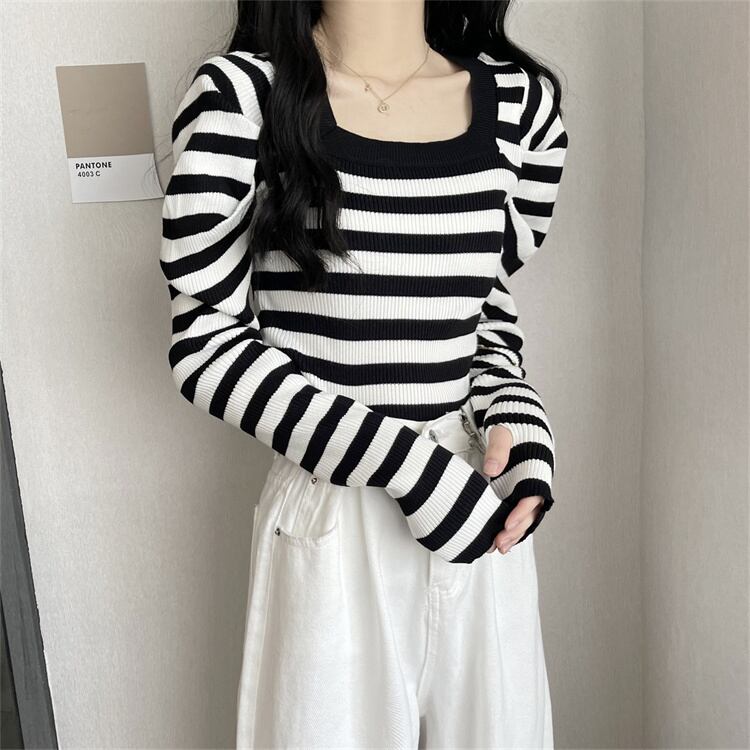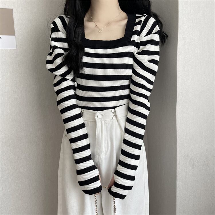 パフスリーブニットセータ トップス セーター 袖あり 長袖 スクエアネック 襟なし タイト 細身 リブ リブニット かわいい 大人可愛い きれいめ シンプル カジュアル 大人 おしゃれ お洒落 かっこいい レトロ 大人女子 こなれ感 ラブリー キュート 個性的 クール エレガント モダン ボーダー ストライプ 春 OL 通勤 学生 通学 デート お出かけ 女子会 休日 リゾート 旅行 着回し 普段使い ファッション コーデ スタイル 新作 流行 インスタ映え イメチェン 好感度 イメージアップ 新入荷