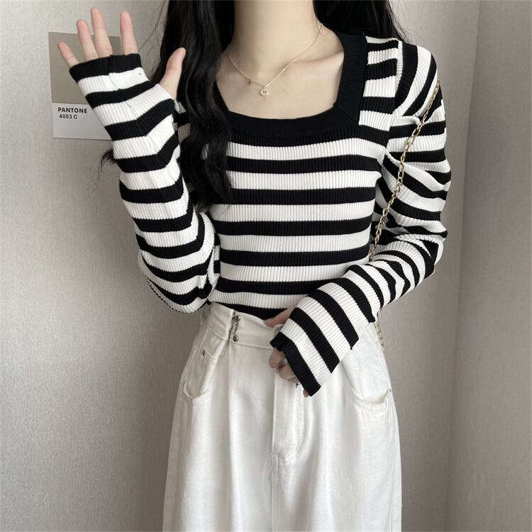 スクエアネックとストライプで細見え効果もバツグンです♪