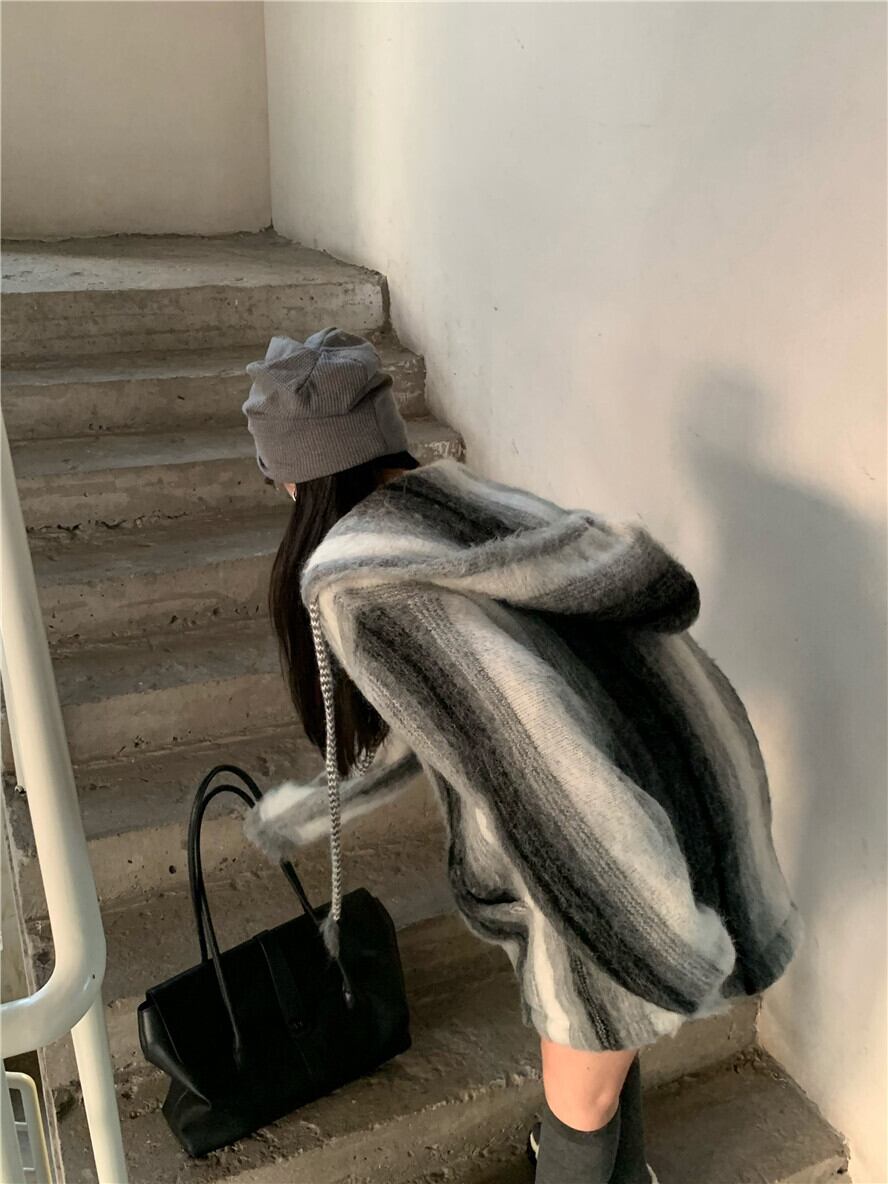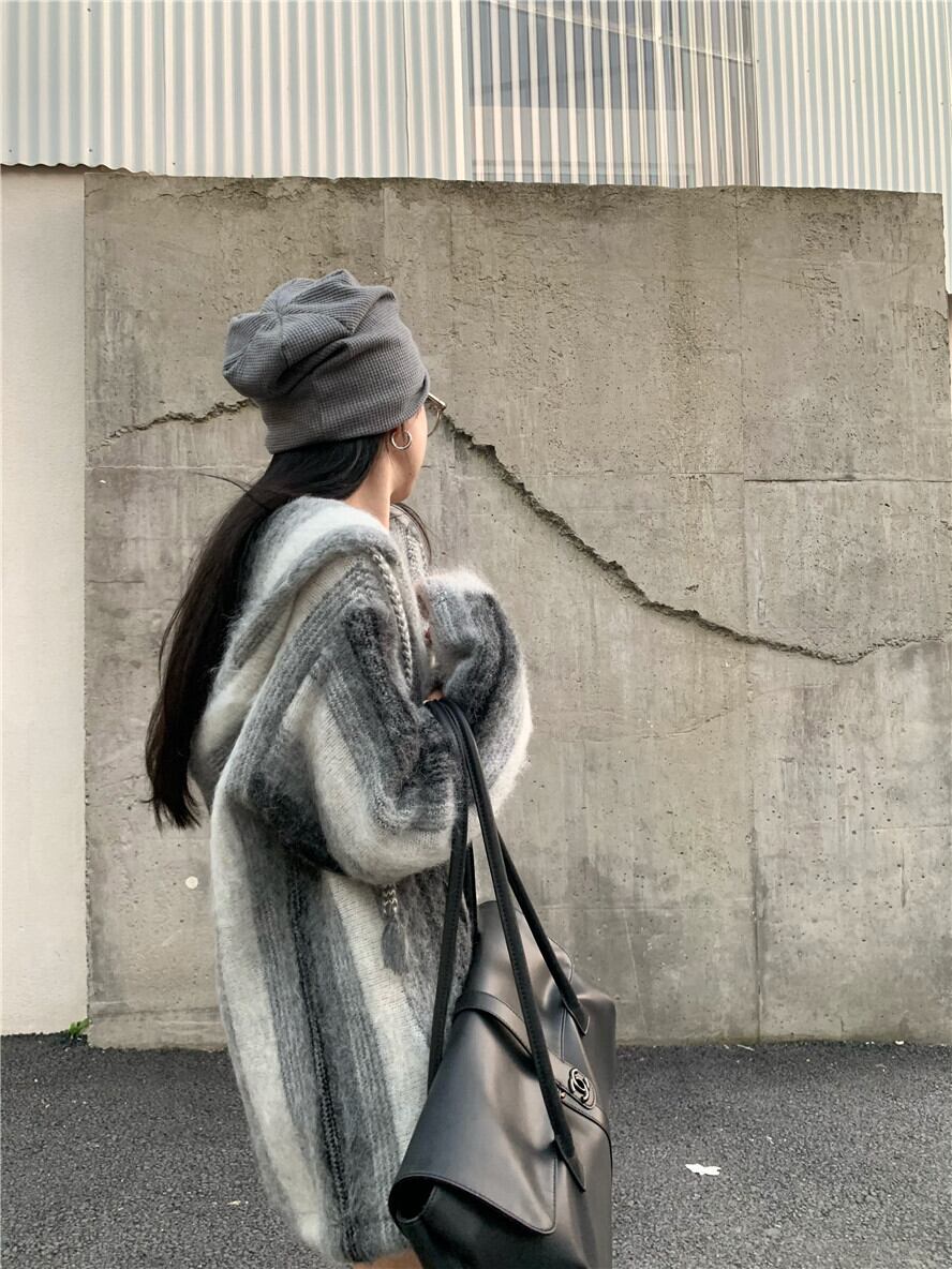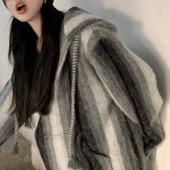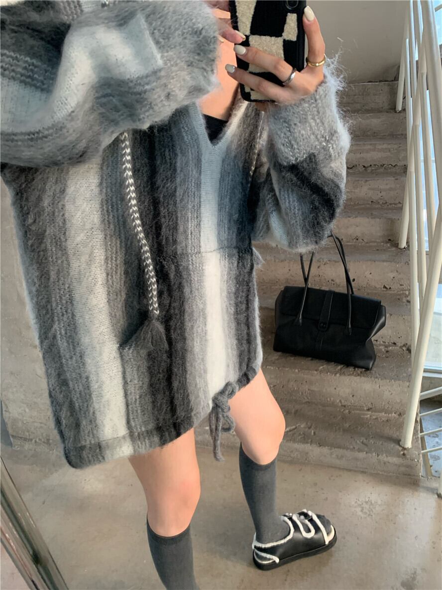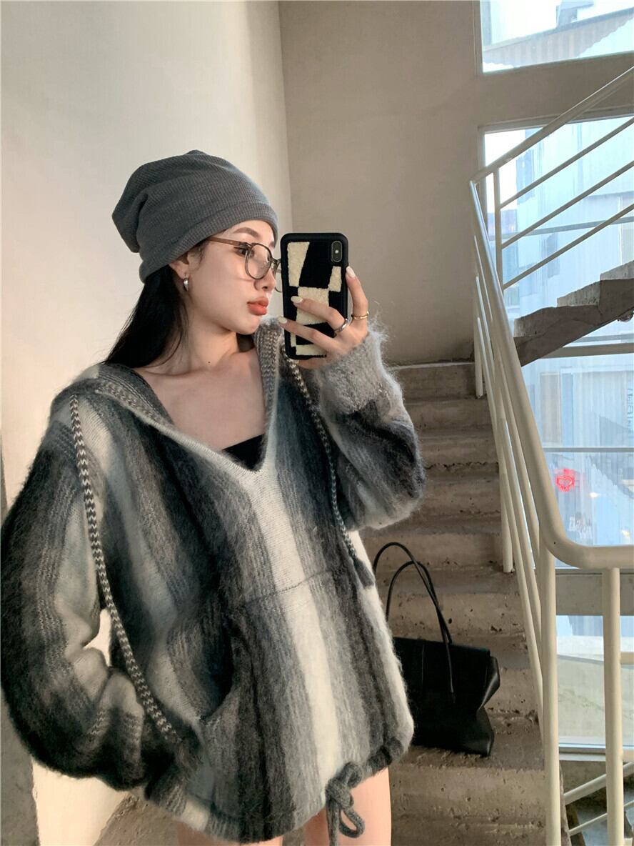 フード付きニット トップス セーター 長袖 Vネック かわいい 大人可愛い おしゃれ お洒落 かっこいい 大人可愛い 大人女子 こなれ感 ラフ メンズライク ボーイッシュ キュート ガーリー ルーズ 個性的 クール 主役級 存在感 抜け感 ストライプ 春 秋 冬 10代 20代 30代 レディース 女性用 女の子 学生 通学 デート お出かけ 女子会 お泊まり 休日 着回し 普段使い 重ね着 韓国 韓国系 ファッション コーデ スタイル 楽ちん 暖かい モテ 体系カバー 送料無料 トレンド 流行 大きい