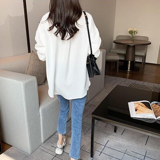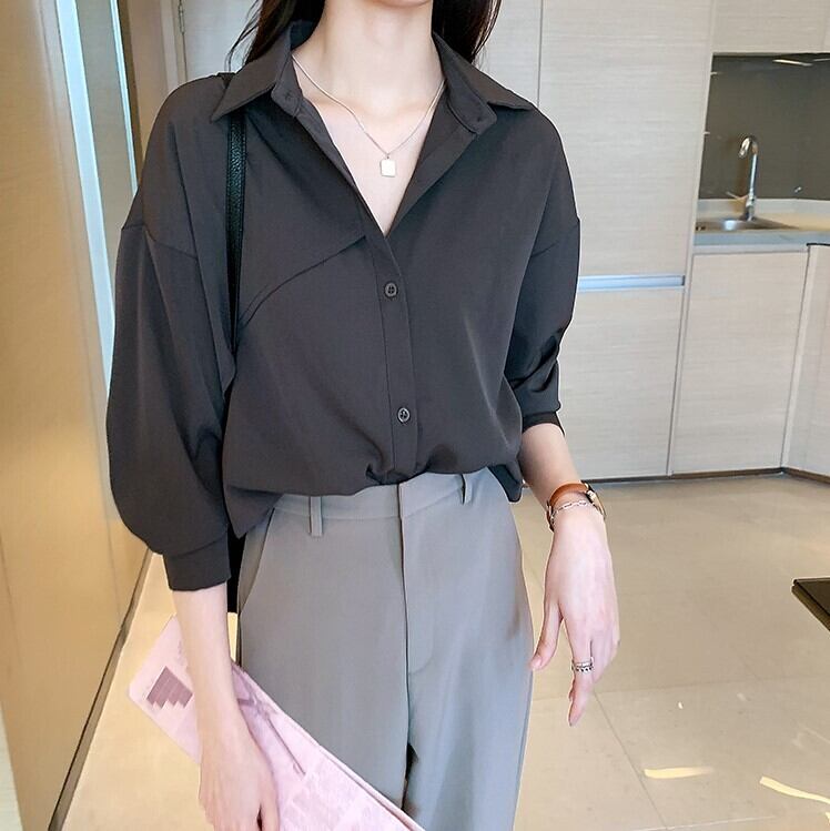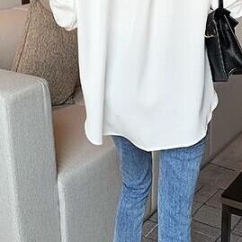 こちらは、スリムで細身のシルエットが魅力的なカラーブラウスです。ホワイト、グレー、アイボリーの3色展開で、シンプルながらも上品で大人っぽい印象を与えます。オフィスやパーティーなど、様々なシーンで活躍してくれますよ。