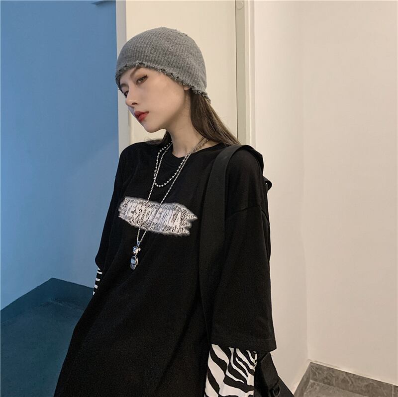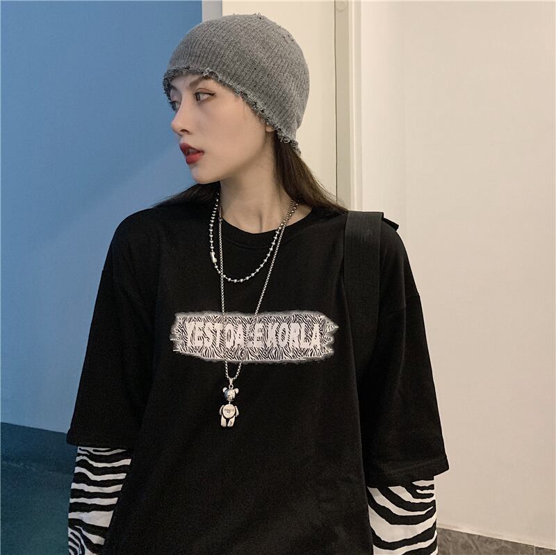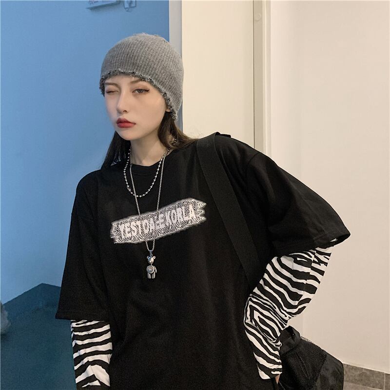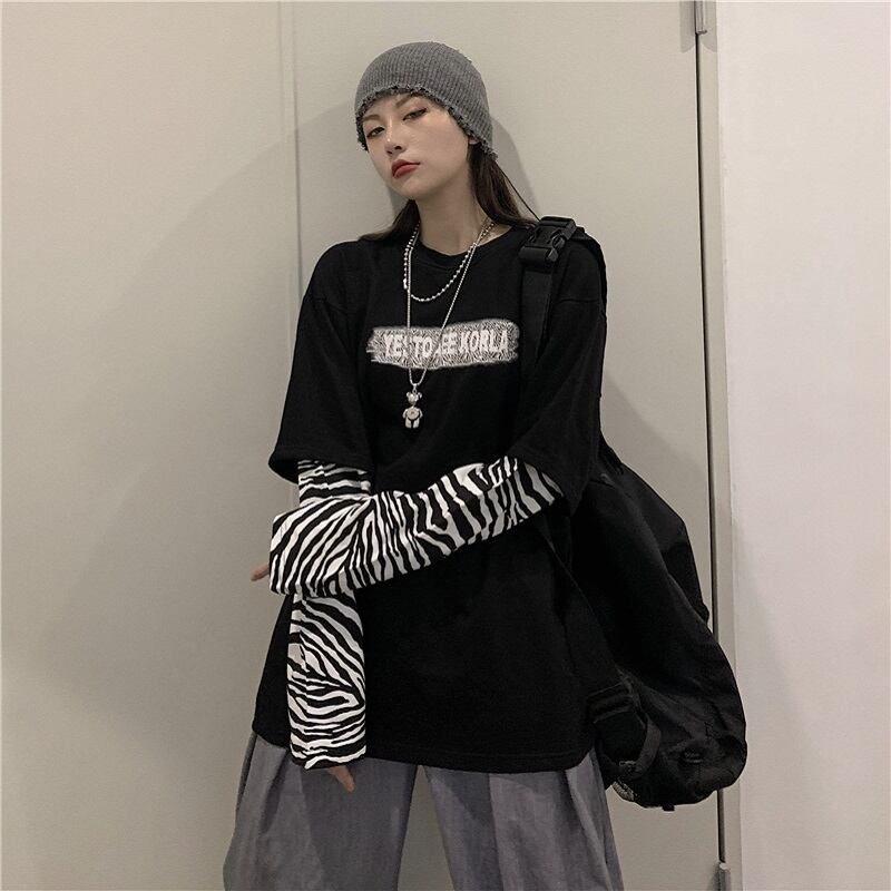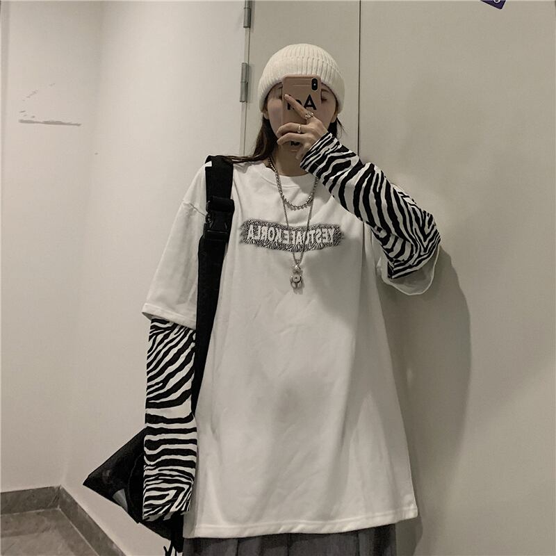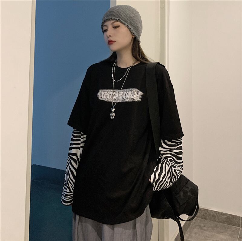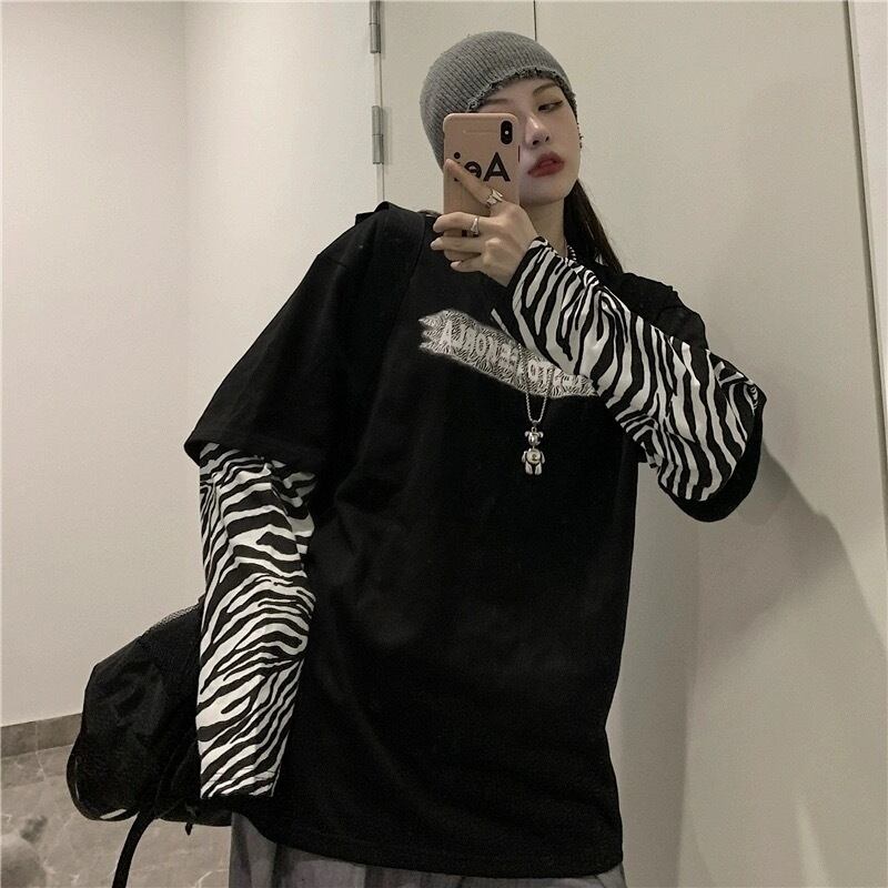 ゼブラ柄トップスと胸ロゴプリントトップスを重ね着しているように見えるフェイクレイヤードデザインのロングTシャツ。
