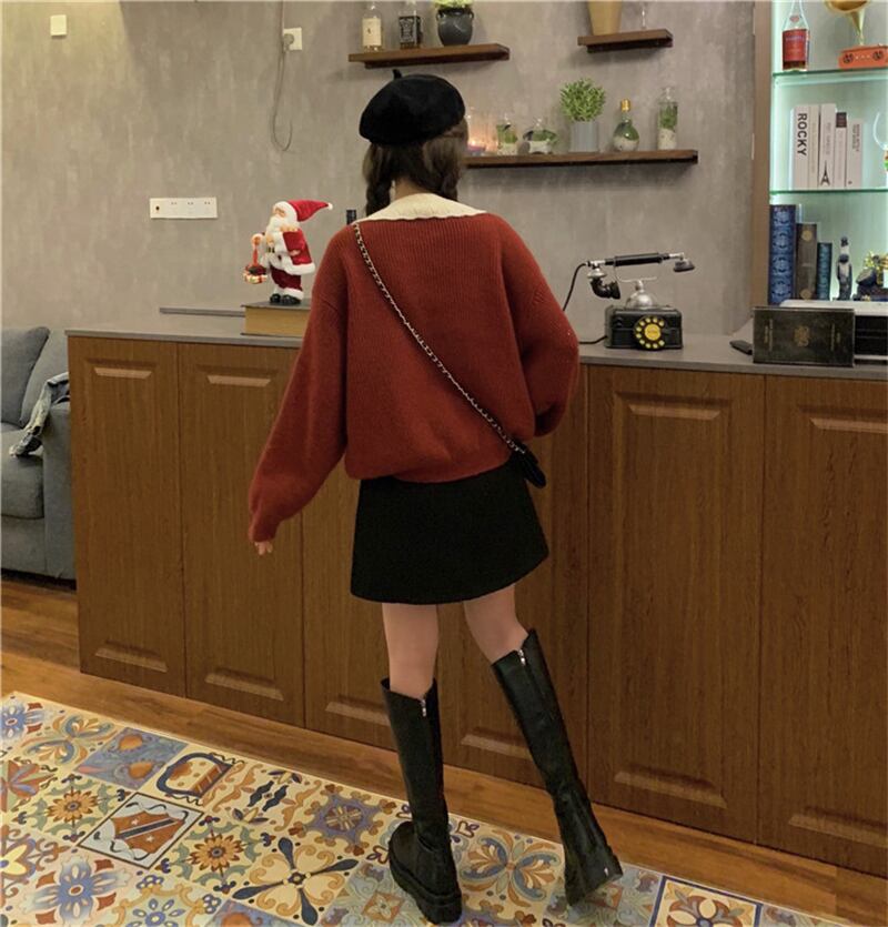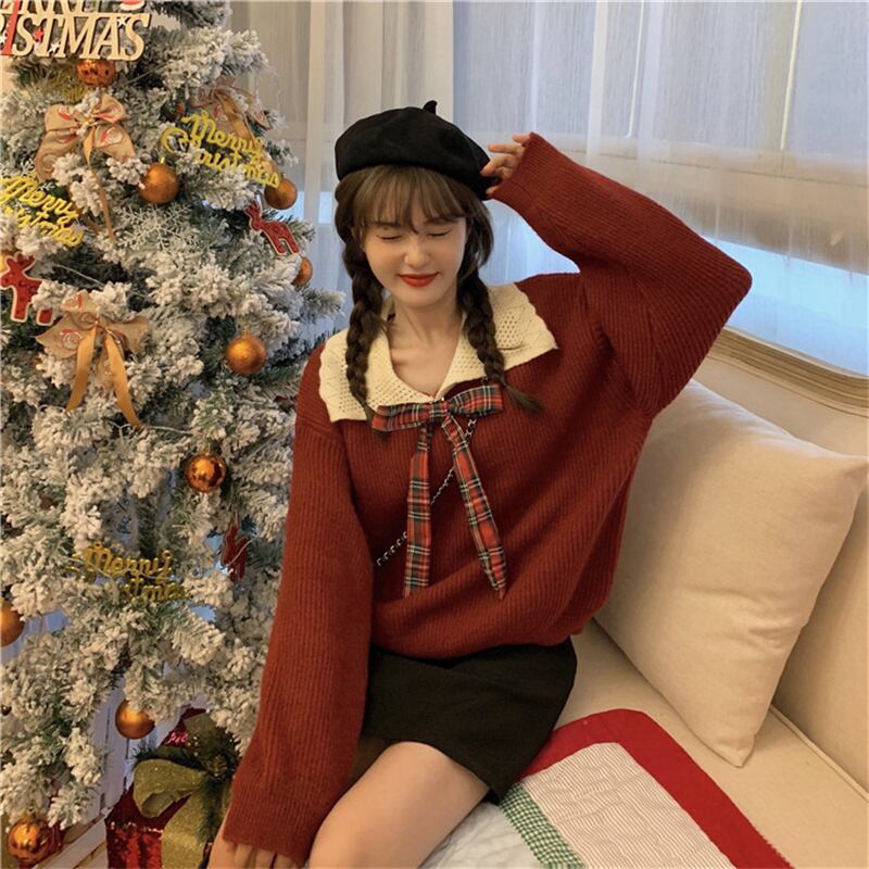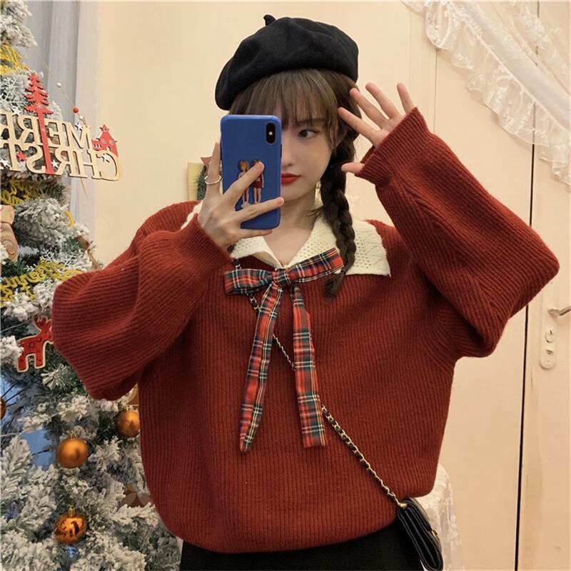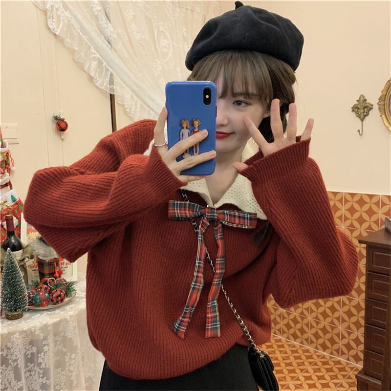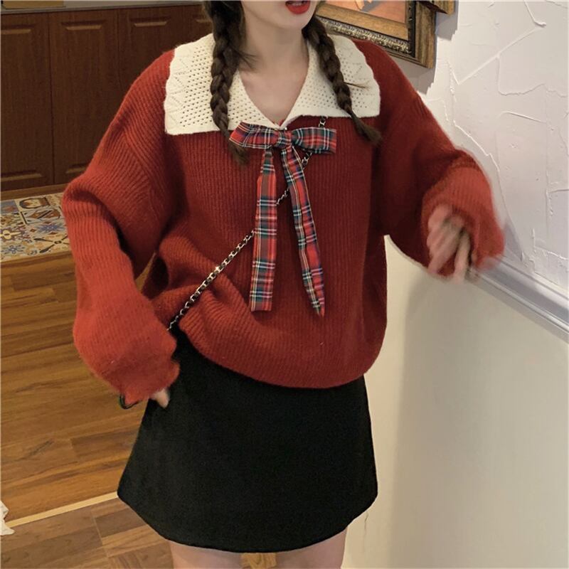 ドーリー 襟付き チェックリボン セーラー セーター ニット レッド 赤 トップス 袖あり 長袖 ボリューム袖 ゆる だぼ Vネック かわいい 大人可愛い きれいめ シンプル カジュアル 大人 おしゃれ お洒落 大人女子 こなれ感 キュート ガーリー 主役級 存在感 秋 冬 2021 レディース 女性用 学生 通学 デート 休日 お出かけ 女子会 イベント 旅行 着回し 普段使い 定番 韓国系 オルチャン モテ トレンド 流行 インスタ映え おすすめ プレゼント インポート ワンサイズ フリーサイズ