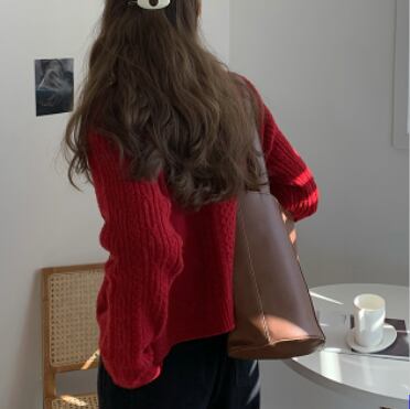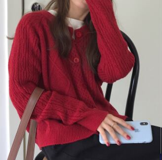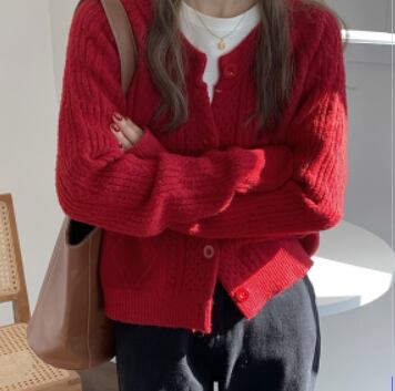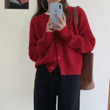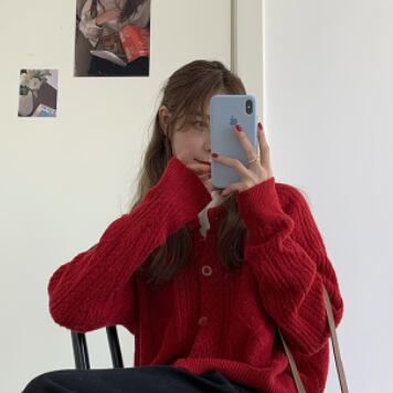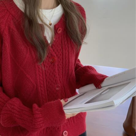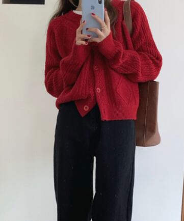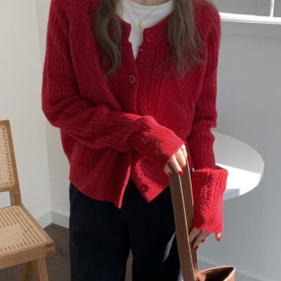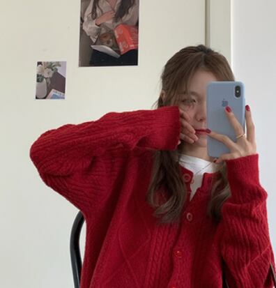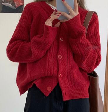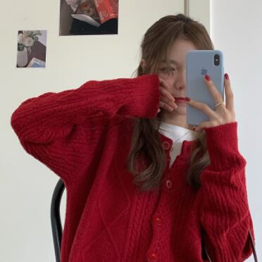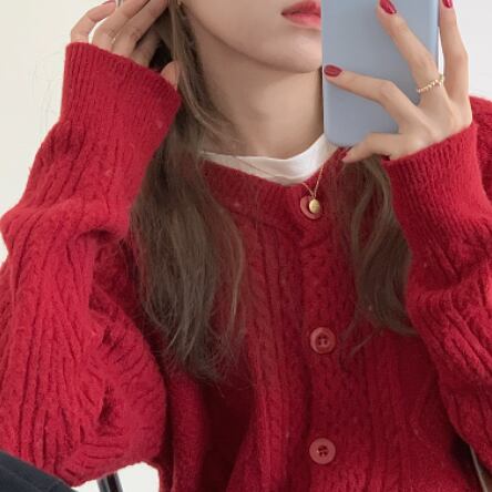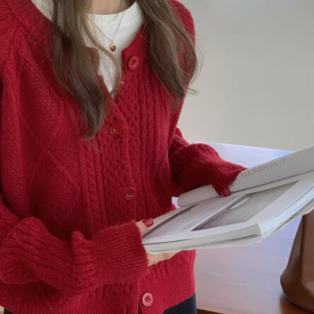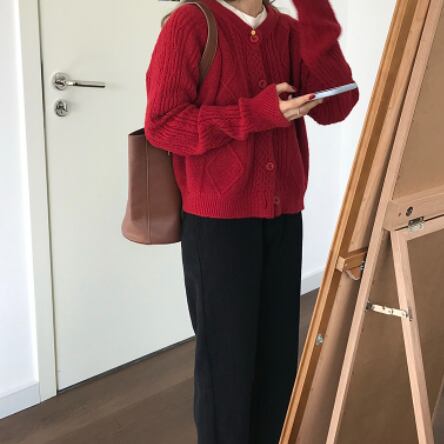 レッドカラーがかわいいざっくりニットカーディガンです。