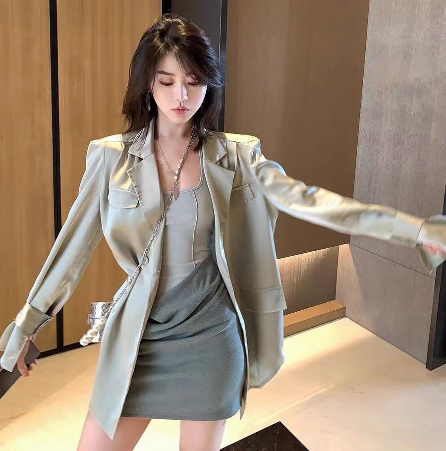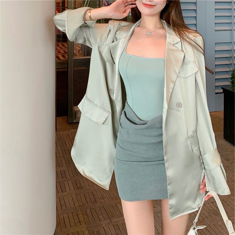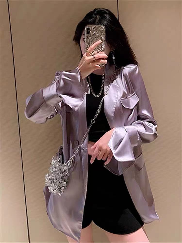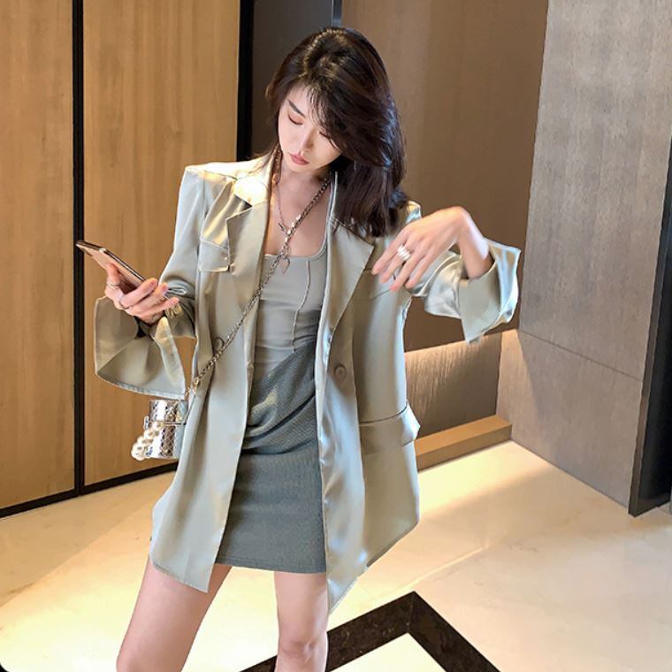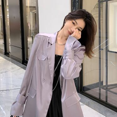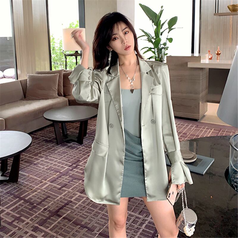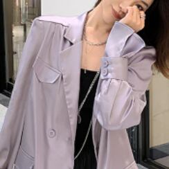 シルク風 サテン ツヤ感 ダブルブレスト ライトアウター 羽織りもの チュニック丈 キャンディスリーブ テーラードカラー アウター ジャケット 上着 ミディアム丈 長袖 萌袖 Vネック 襟付き 前開き 薄手 きれいめ シンプル カジュアル 上品 おしゃれ かっこいい 大人女子 こなれ感 クール モード系 とろみ感 無地 春 夏 秋 2021 レディース 女性用 デート お出かけ 女子会 着回し 普段使い 韓国系 オルチャン スタイル 楽ちん 体系カバー 新作 S M ブラック グリーン パープル