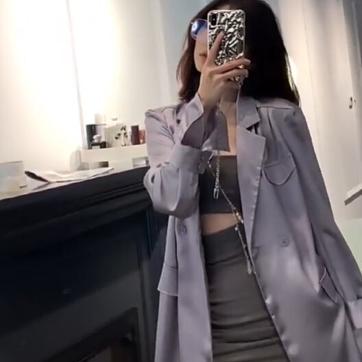 シルクのようなつや感が上品なサテン生地のダブルブレストテーラードジャケットです。