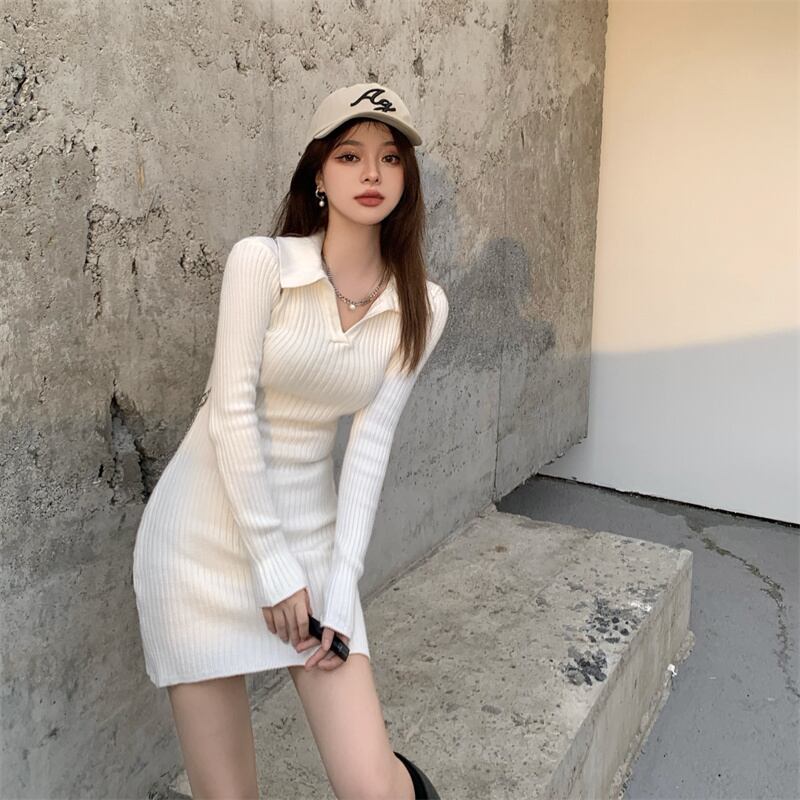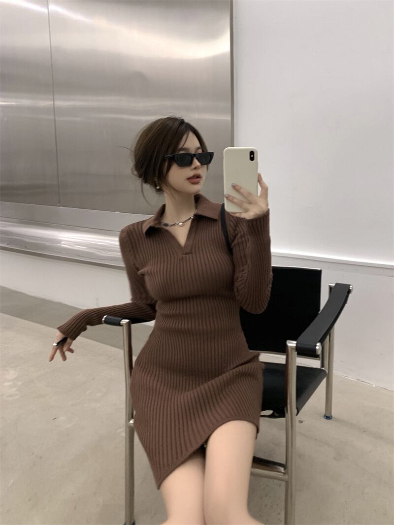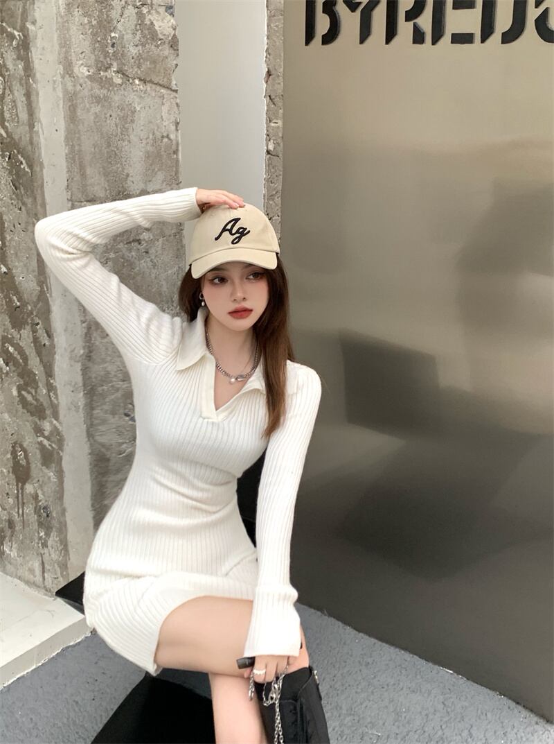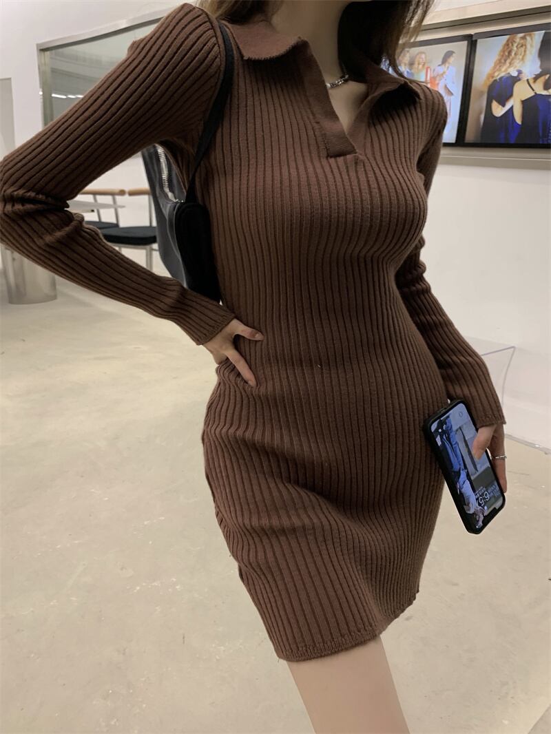 タイトな襟付きニットワンピースです。