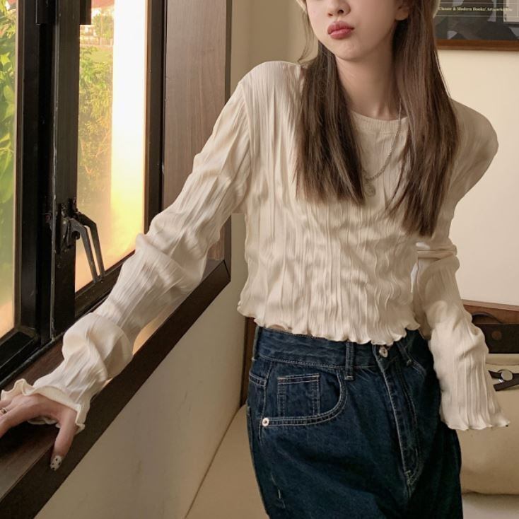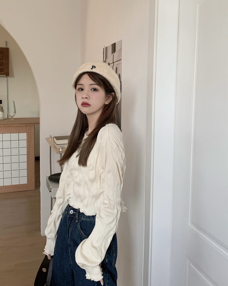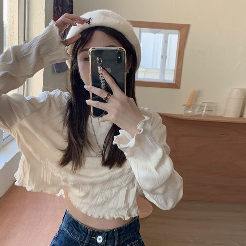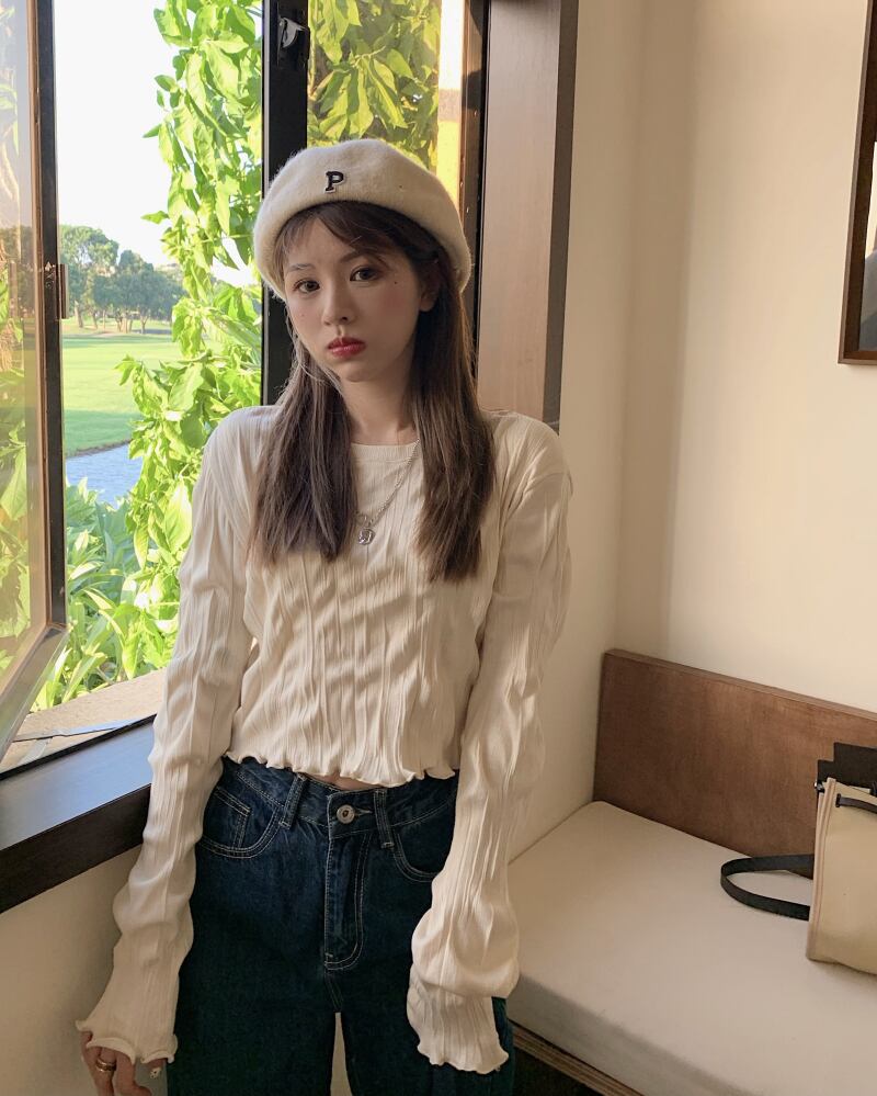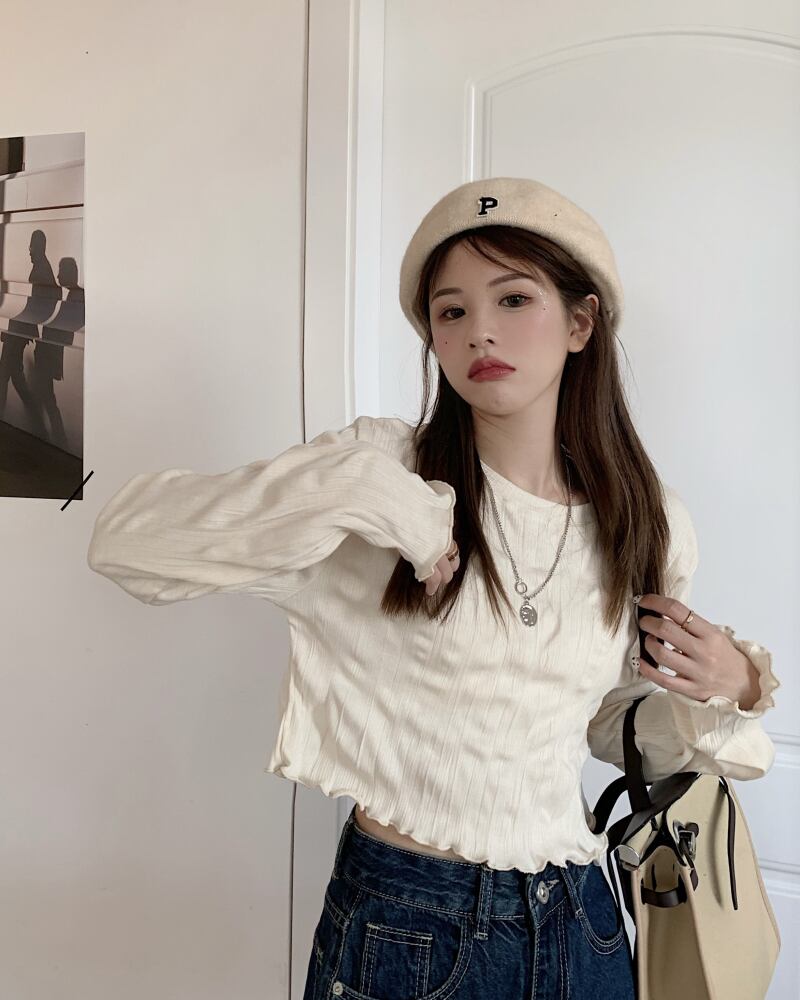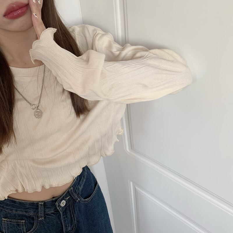 袖口と裾周りのフリルのようなメロウ仕上げが可愛いショート丈カットソー。
