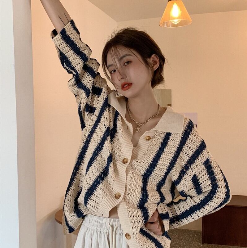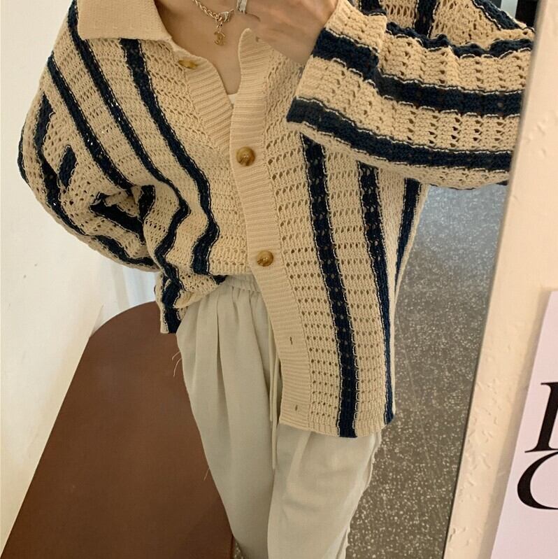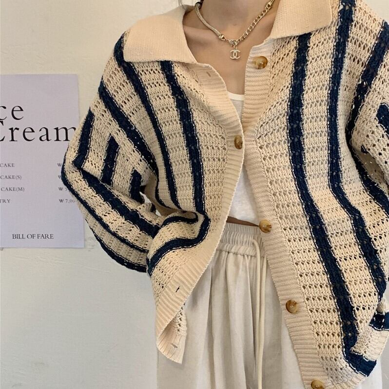 商品の特徴というところでは、まずは鮮やかなストライプ柄が目を引くセーターカーディガンです。色合いもシンプルで使いやすく、上品な印象を与えます。また、スマートなシルエットが体型カバーにも繋がり、細身やストレートなパンツにも合わせやすいこなれ感のある一枚です。