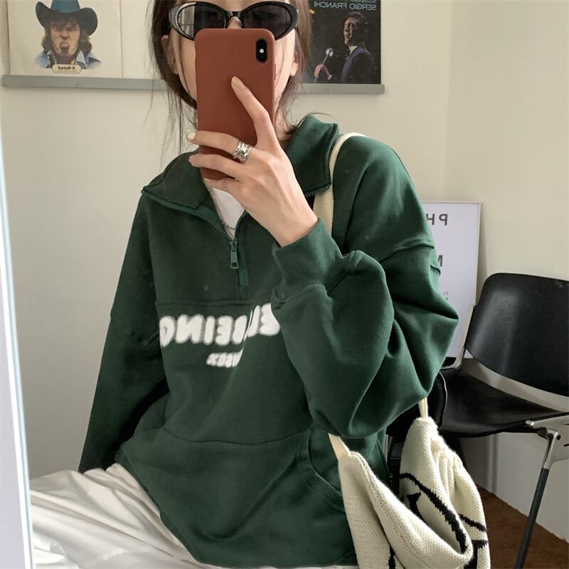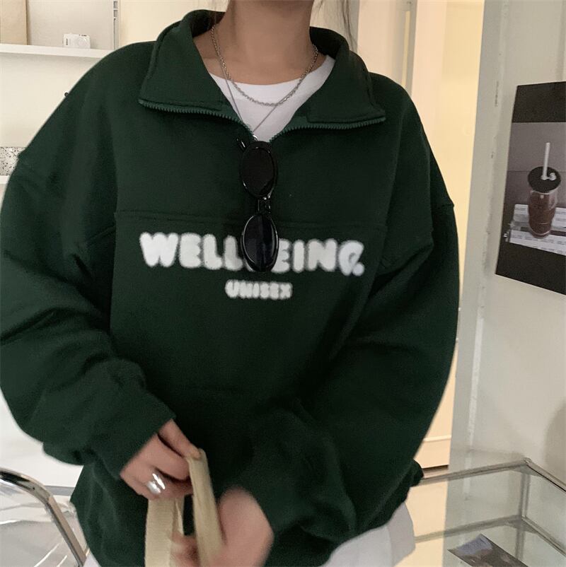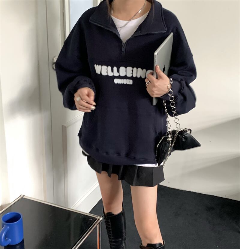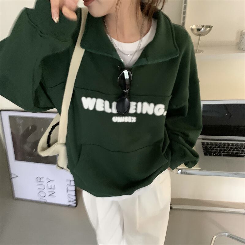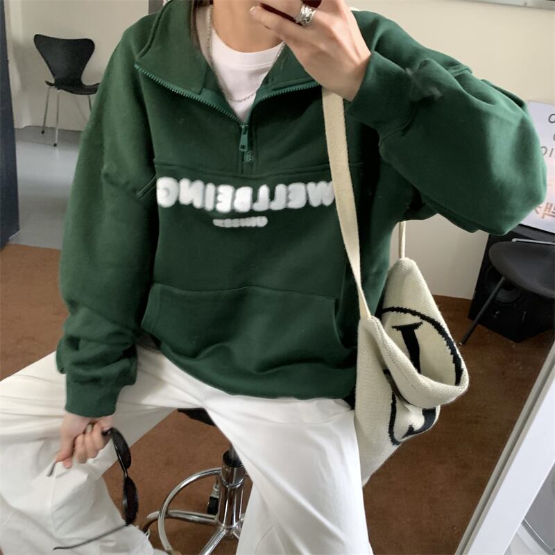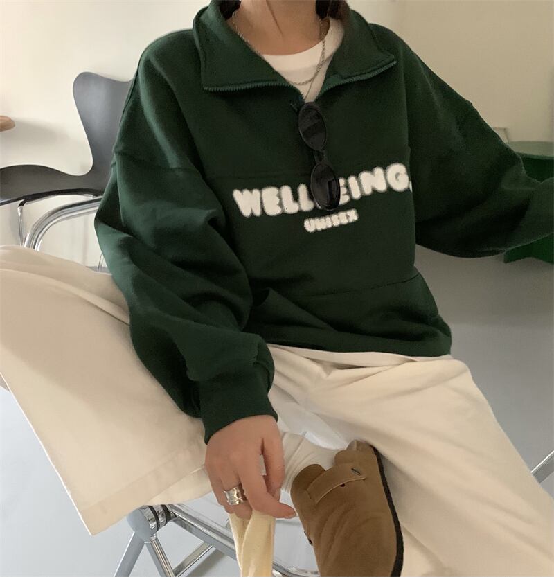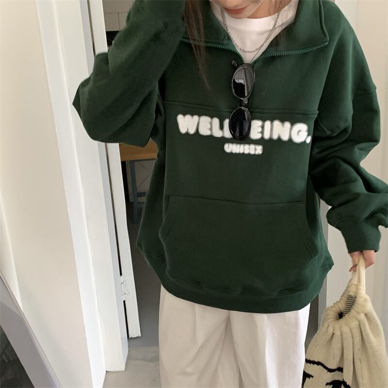 オーバーサイズ 英字ロゴプリント カンガルーポケット ハーフジップアップ トップス プルオーバー トレーナー チュニック スウェット ミディアム丈 長袖 ドロップショルダー 襟付き ファスナー 大人可愛い シンプル カジュアル おしゃれ こなれ感 ボーイッシュ スポーティー 春 秋 冬 2021 レディース メンズ 男女兼用 女の子 男の子 学生 通学 お出かけ 公園デビュー 休日 普段使い お揃い 韓国系 オルチャン コーデ 楽ちん 体系カバー 新作 フリーサイズ ゆったり グリーン ネイビー