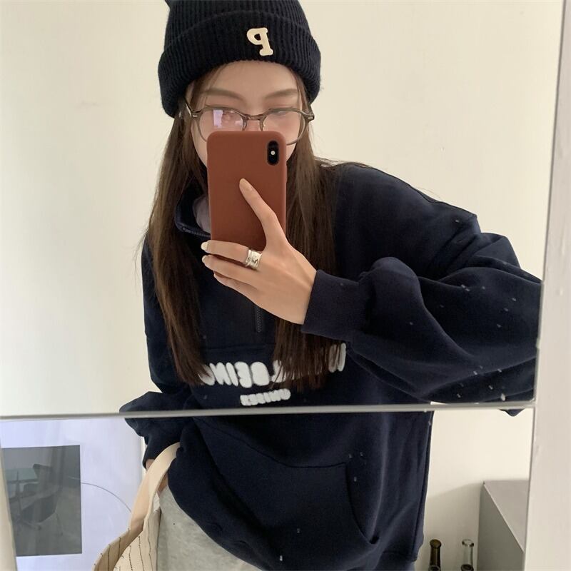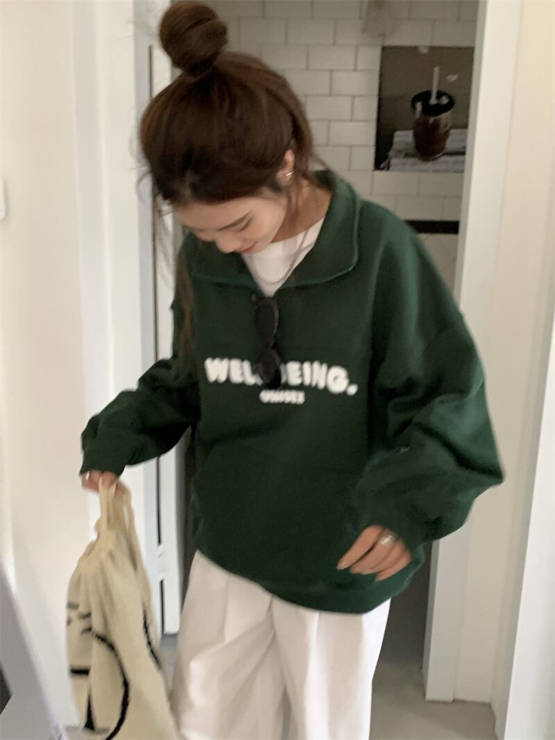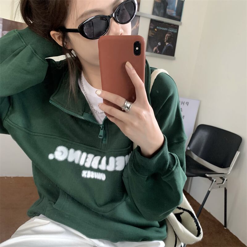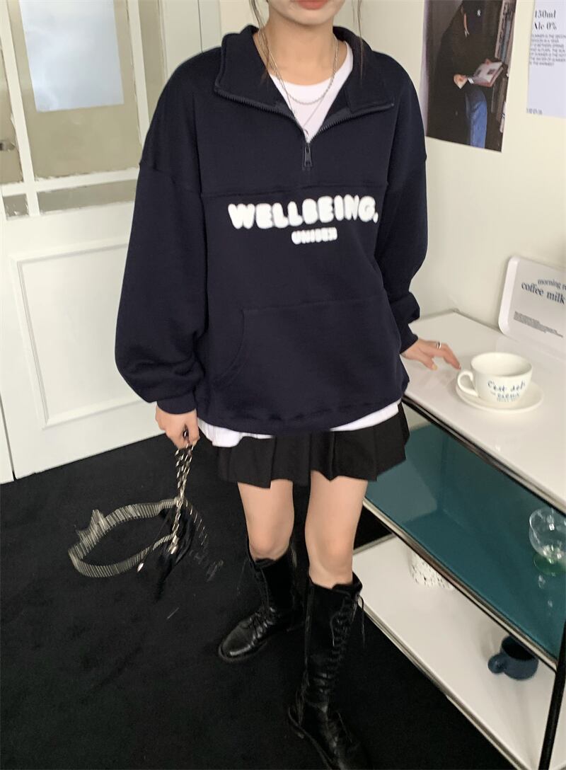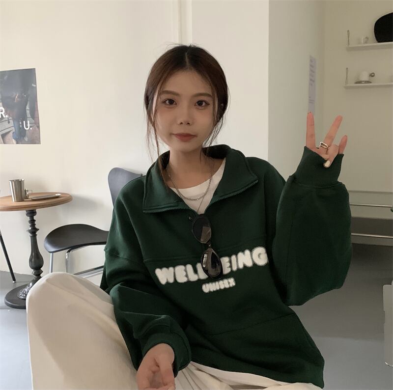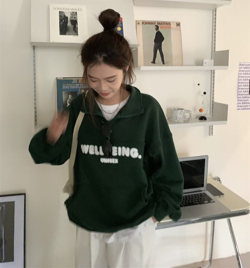 オーバーサイズ 英字ロゴプリント カンガルーポケット ハーフジップアップ トップス プルオーバー トレーナー チュニック スウェット ミディアム丈 長袖 ドロップショルダー 襟付き ファスナー 大人可愛い シンプル カジュアル おしゃれ こなれ感 ボーイッシュ スポーティー 春 秋 冬 2021 レディース メンズ 男女兼用 女の子 男の子 学生 通学 お出かけ 公園デビュー 休日 普段使い お揃い 韓国系 オルチャン コーデ 楽ちん 体系カバー 新作 フリーサイズ ゆったり グリーン ネイビー