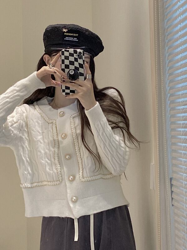 フリルと真珠ボタンが華やかなショートニットカーディガンです。