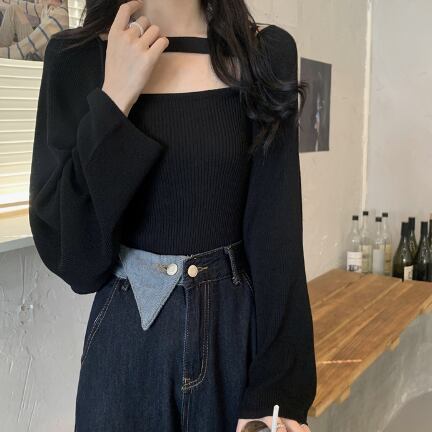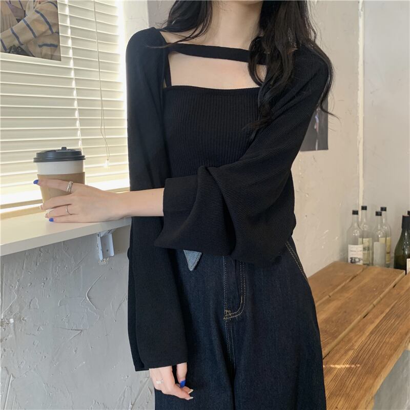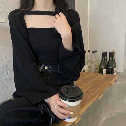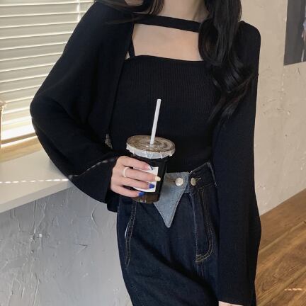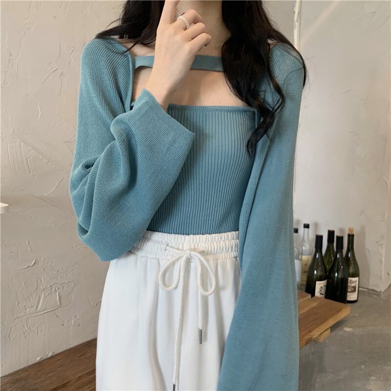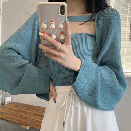 カーディガン トップス セーター プルオーバー キャミソール 黒 ブラック 青 ブルー ショート丈 長袖 ボリューム袖 襟なし スリム 薄手 2点セット ツーピース きれいめ シンプル 大人 おしゃれ 大人可愛い 大人女子 こなれ感 ラフ ルーズ 個性的 セクシー 主役級 存在感 抜け感 無地 春 夏 2022 10代 20代 通勤 通学 デート お出かけ 女子会 休日 着回し 普段使い 重ね着 韓国系 ファッション コーデ スタイル モテ 新作 トレンド フリーサイズ ゆったり ゆる 色展開