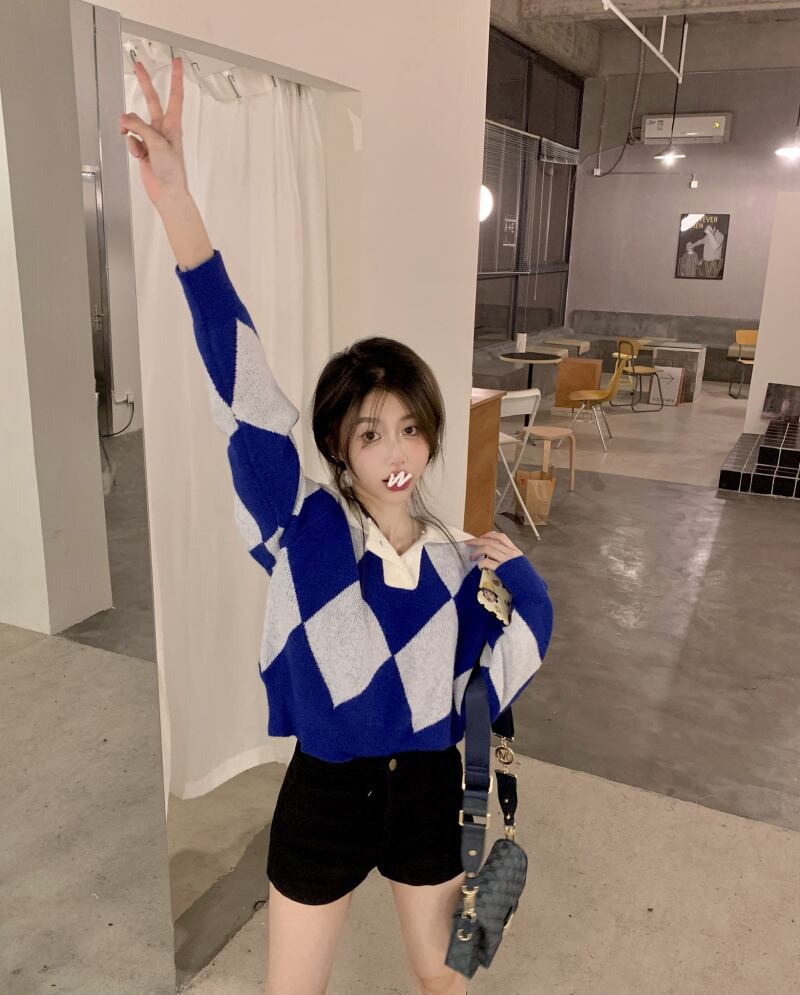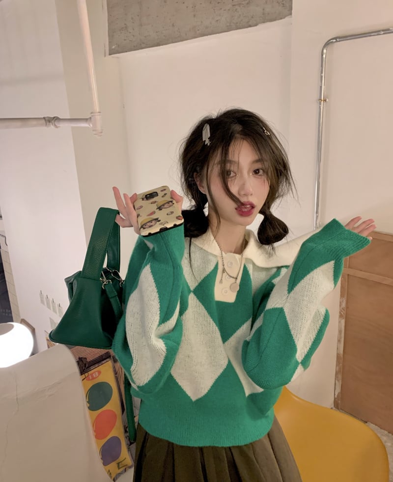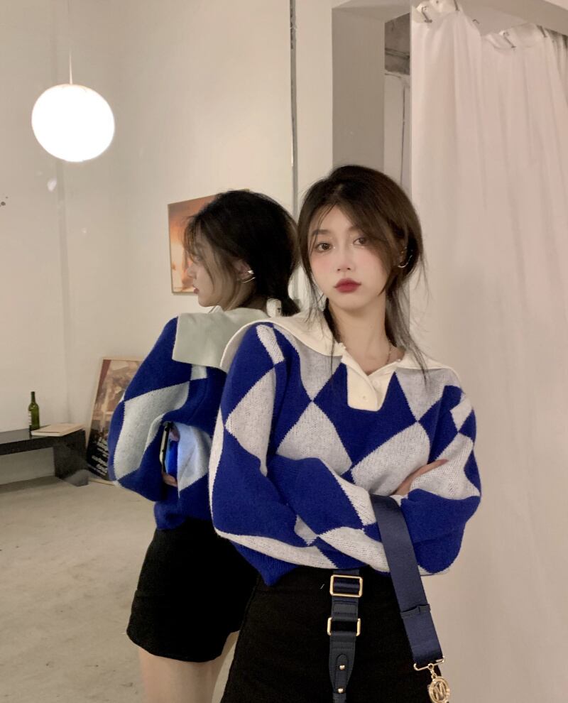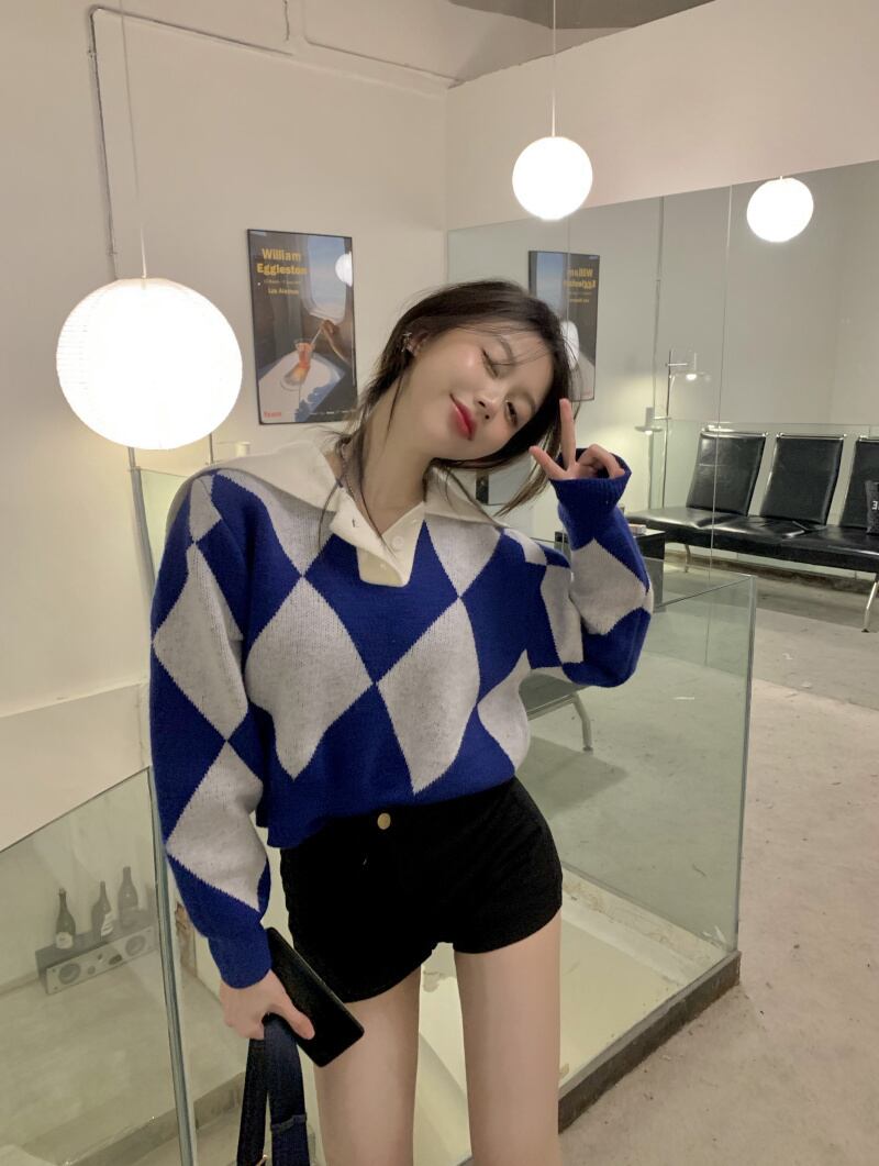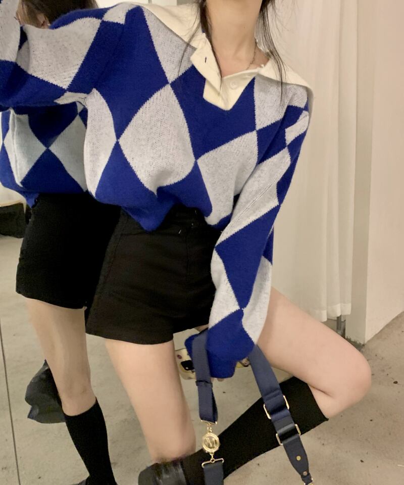 ニット セーター 魅せる トップス プルオーバー ブルー 青 グリーン 緑 ショート丈 袖あり 長袖 襟付き ストレート 大人女子 大人 上品 おしゃれ きれいめ シンプル カジュアル レトロ レトロ風 こなれ感 ラフ 個性的 デザイン 主役級 存在感 柄 ひし形 秋 オータム 冬 ウインター 10代 20代 レディース 女性用 学生 通学 デート お出かけ 女子会 イベント リゾート 旅行 着回し 普段使い トレンド ファッション コーデ ワンサイズ