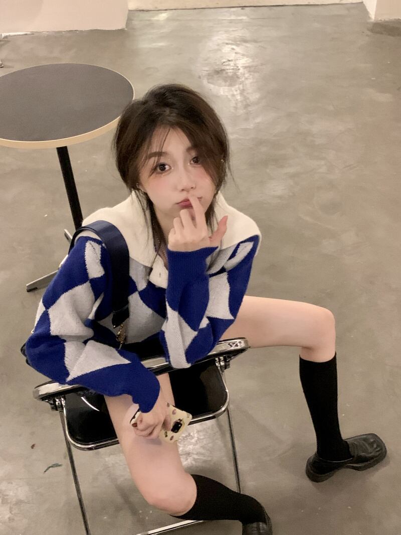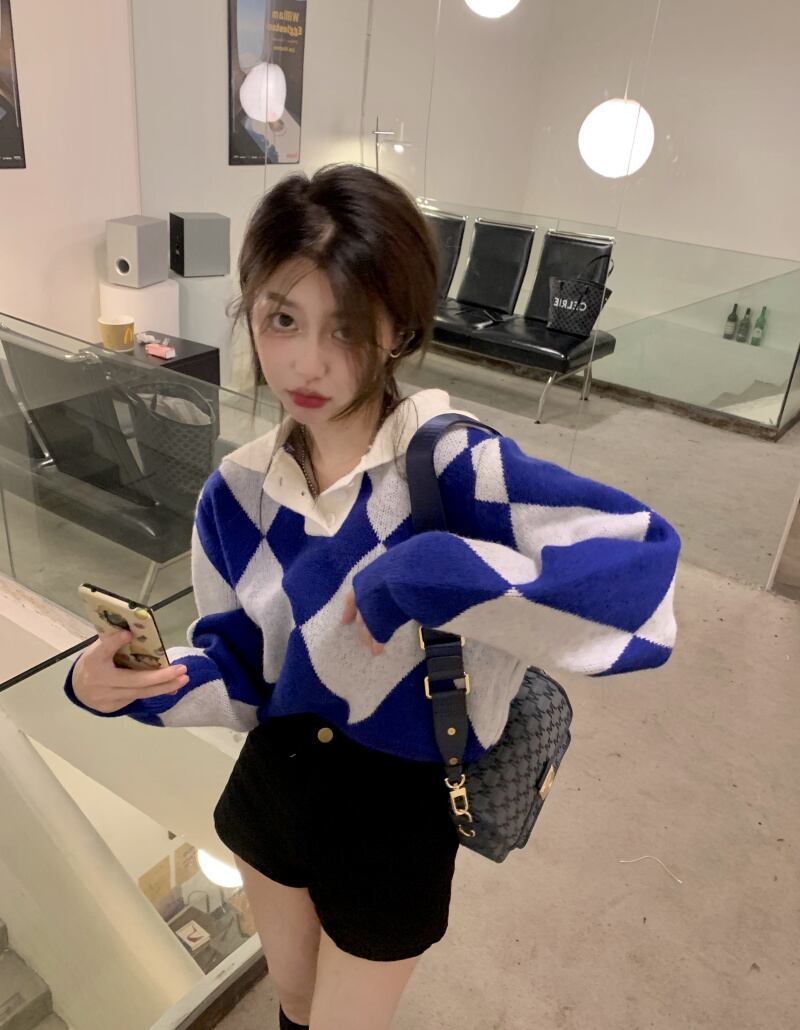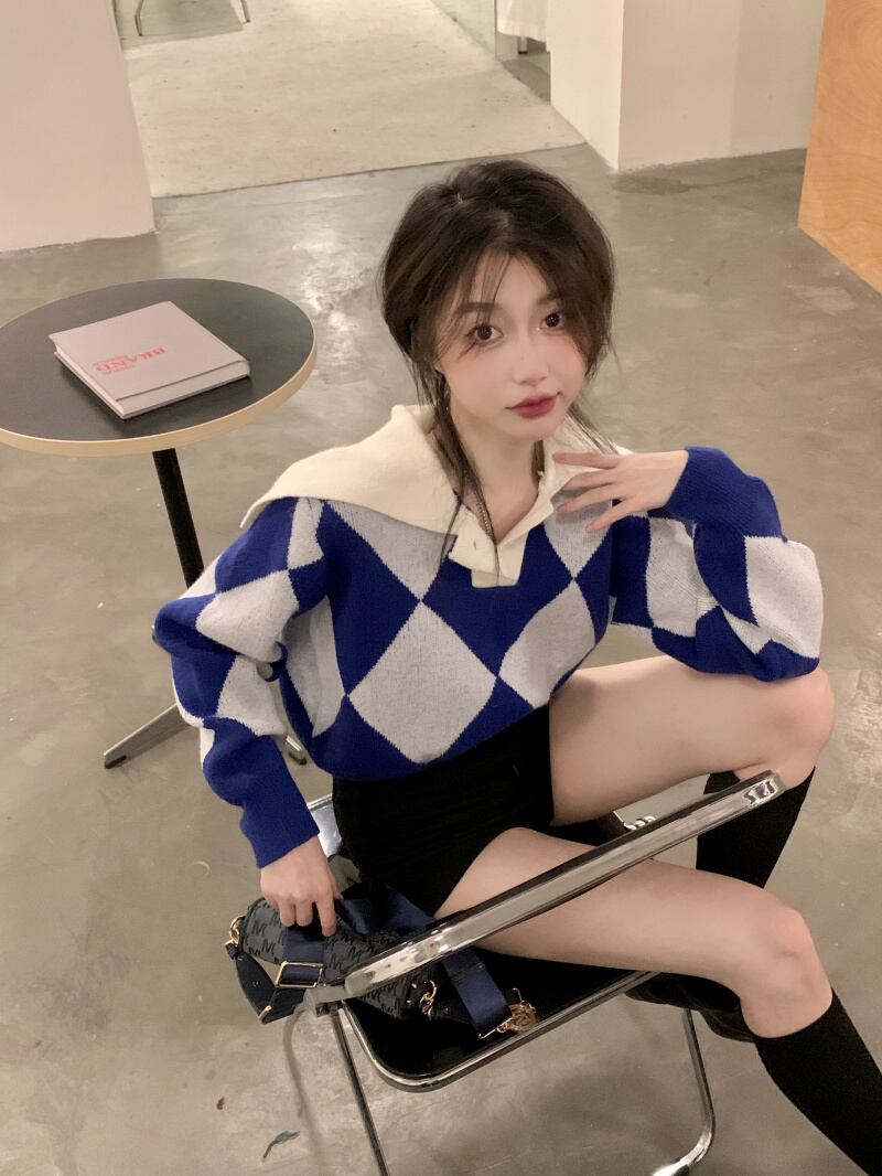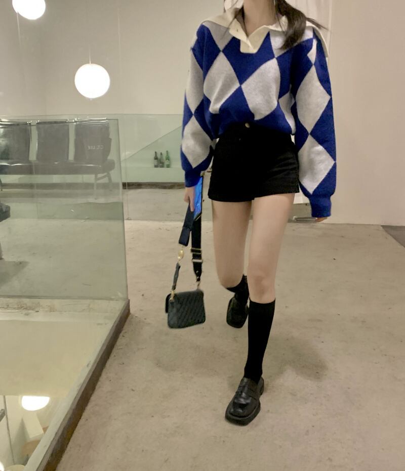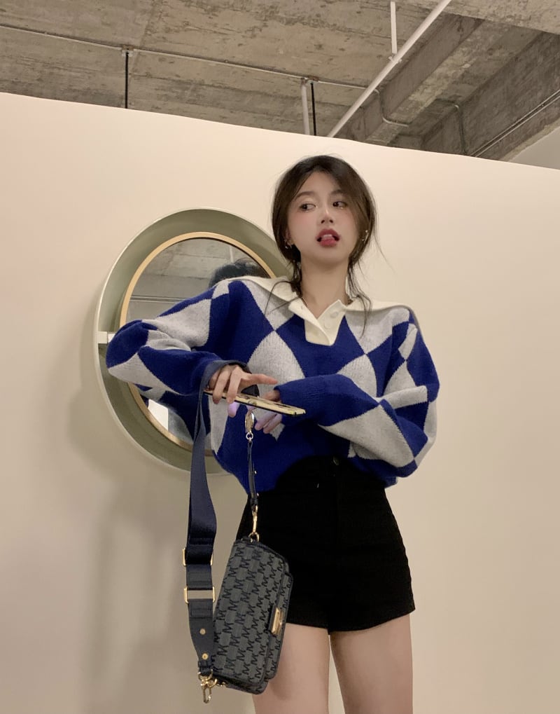 ショート丈の菱形模様セーター