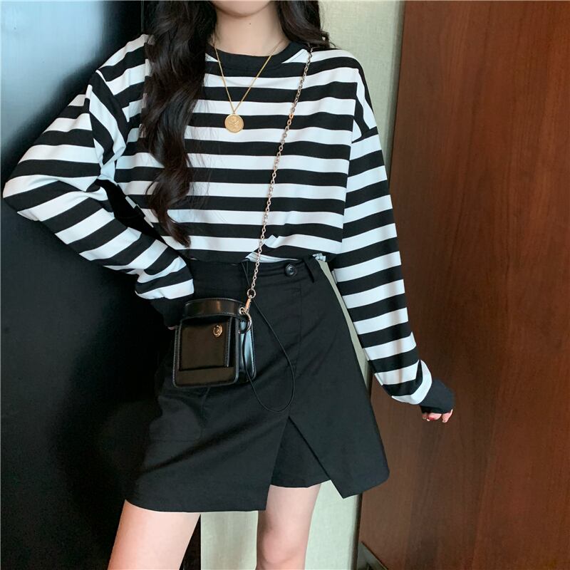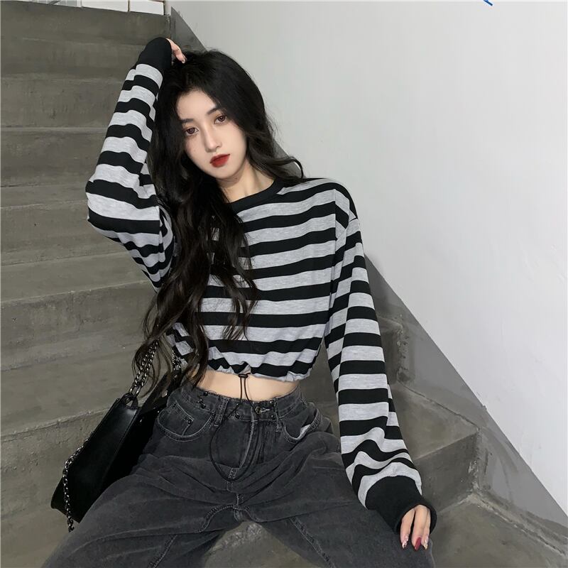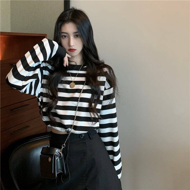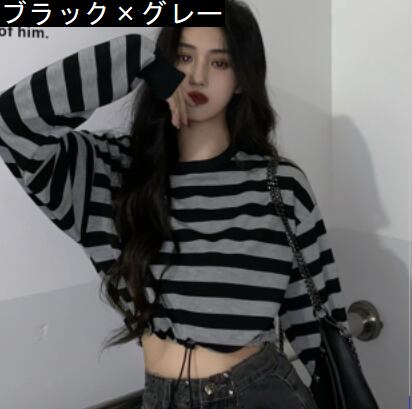 長袖Tシャツ 魅せる トップス ブラック 黒 ホワイト 白 グレー 灰色 ショート丈 袖あり 長袖 ラウンドネック 大人女子 大人 上品 おしゃれ カジュアル レトロ レトロ風 こなれ感 ラフ ルーズ シルエット 個性的 デザイン 主役級 存在感 スポーティー 柄 ストライプ 縞模様 ボーダー 春 スプリング 秋 オータム 10代 20代 レディース 女性用 女の子 運動 アウトドア 動きやすい ダンス 着回し 普段使い 重ね着 ワンサイズ モノトーン