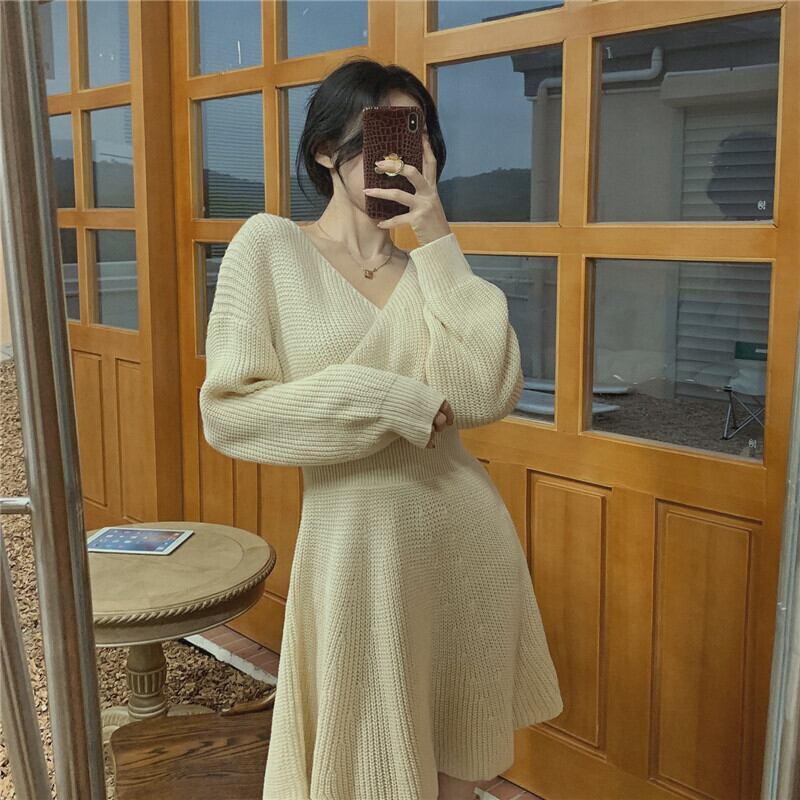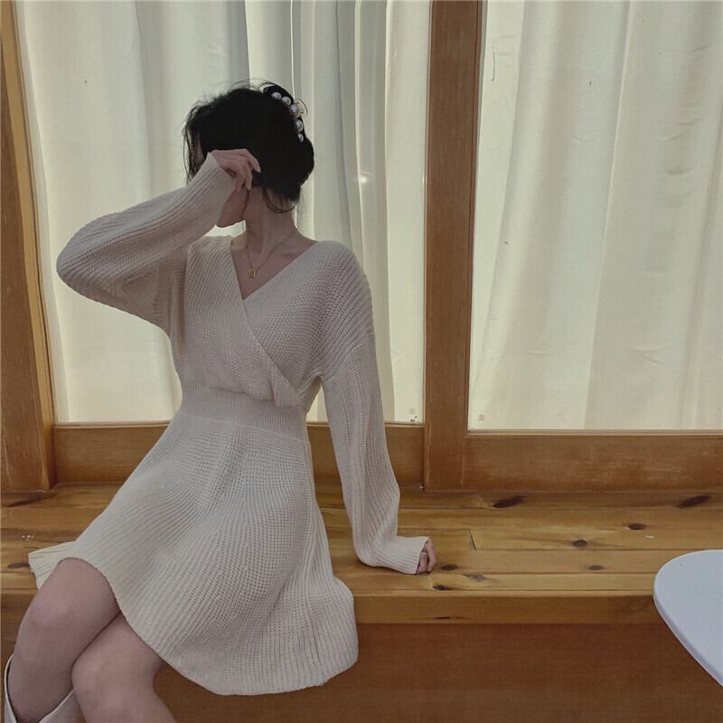 ニットワンピース シンプル ワンピース ミディアム丈 膝上 袖あり 長袖 Vネック ウエストマーク 大人女子 大人 上品 おしゃれ きれいめ シンプル エレガント レトロ レトロ風 こなれ感 ラフ 個性的 デザイン 主役級 存在感 無地 春 スプリング 秋 オータム 10代 20代 30代 レディース 女性用 ママ オフィス ビジネス OL 通勤 学生 通学 デート お出かけ 女子会 着回し 普段使い トレンド ファッション コーデ ワンサイズ 大きいサイズ