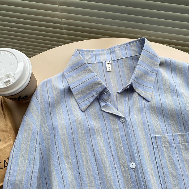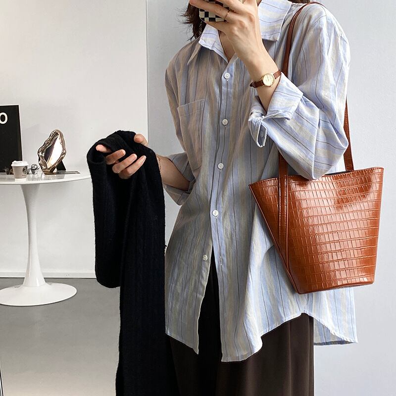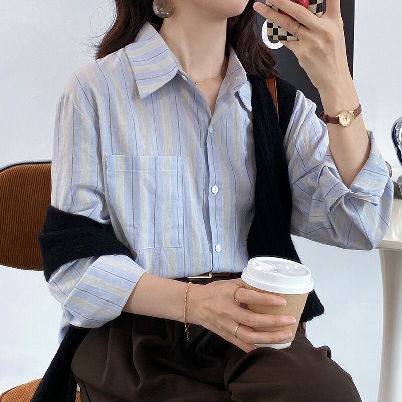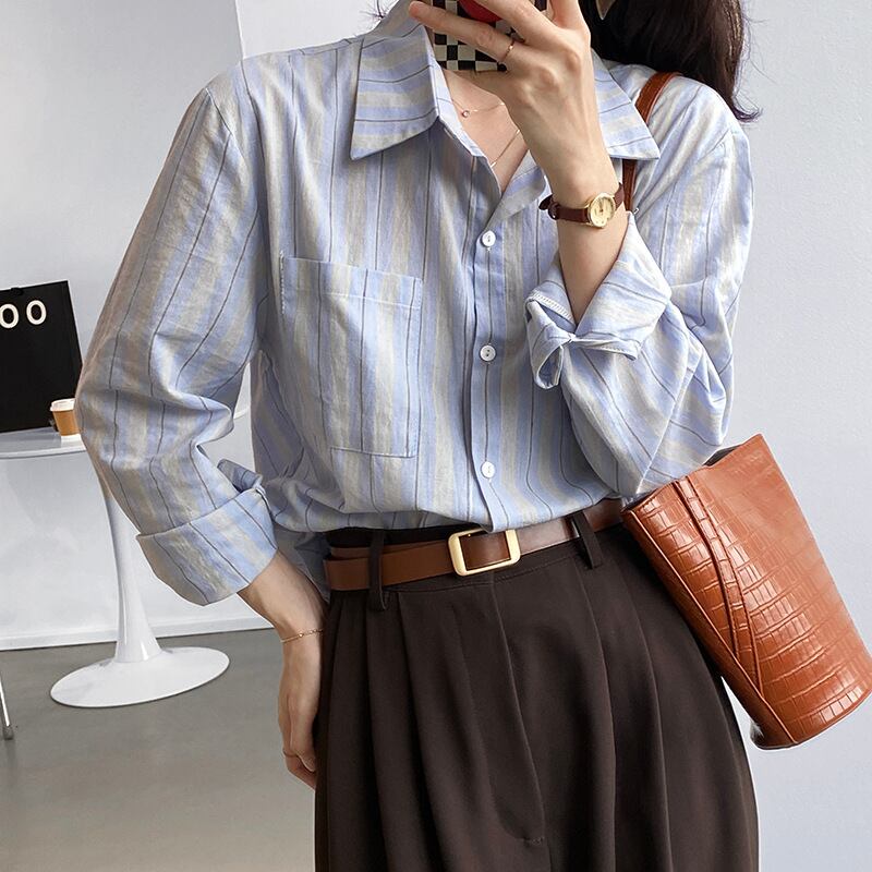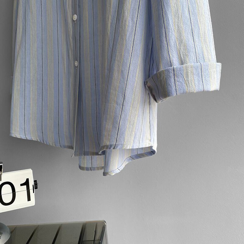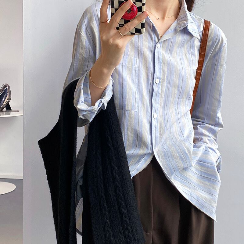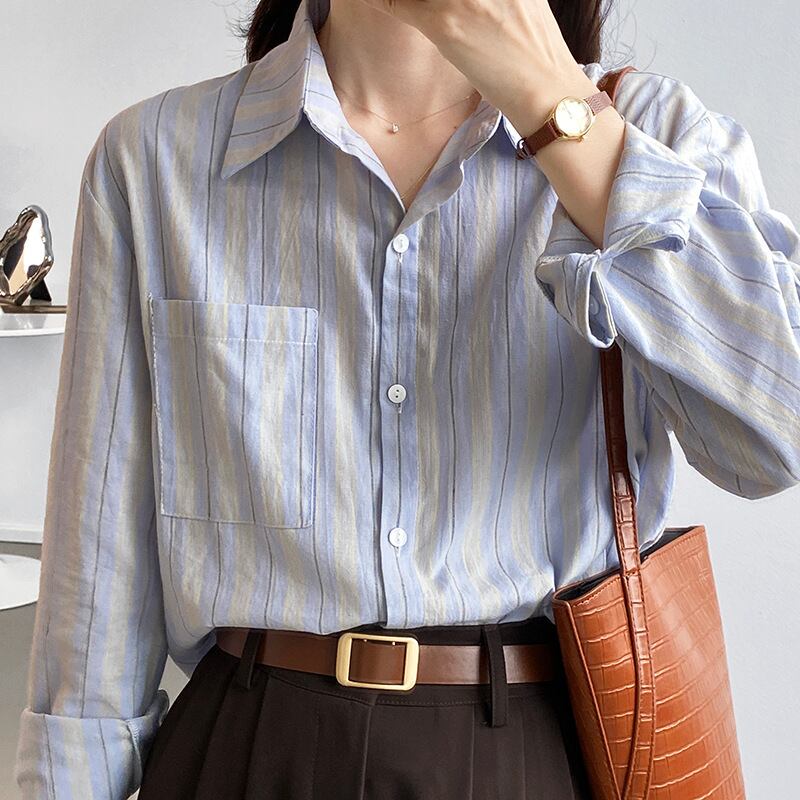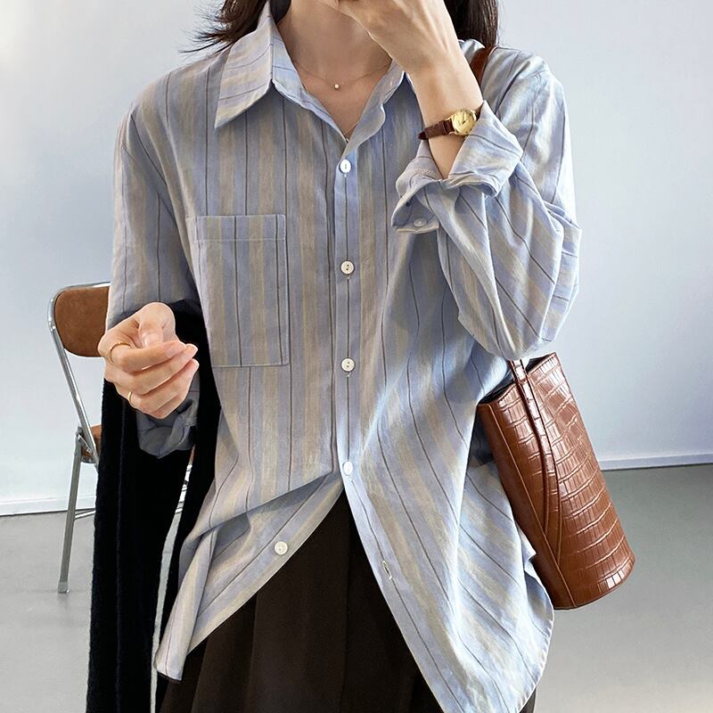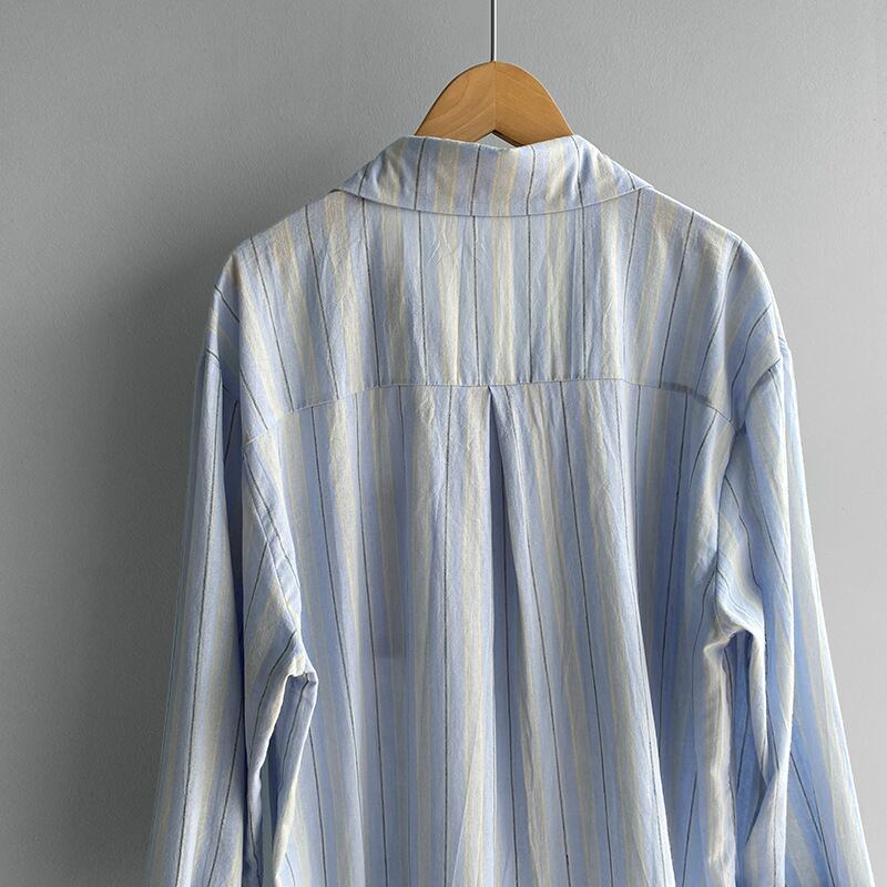 長袖デザインシャツ シンプル トップス シャツ ブラウス ミディアム丈 袖あり 長袖 襟付き ストレート シングルブレスト ボタン 大人女子 大人 上品 おしゃれ きれいめ シンプル カジュアル レトロ レトロ風 こなれ感 ラフ ルーズ シルエット 個性的 デザイン 主役級 存在感 柄 ストライプ 縞模様 ボーダー 春 スプリング 秋 オータム 20代 30代 40代 レディース 女性用 ママ 通勤 学生 通学 着回し 普段使い 重ね着 トレンド 定番 スタイル M L