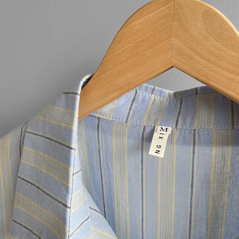 自分らしいおしゃれスタイルを追求できる長袖デザインシャツ。トップスとしてはもちろん、重ね着やジャケットアウターとしても使える、ミディアム丈のシャツです。シンプルでレトロなストライプとボーダーの柄が、ストレートなシングルブレストのデザインと絶妙にマッチしてます。特にボタンを開けて羽織ると、こなれ感のあるラフな雰囲気が漂います。