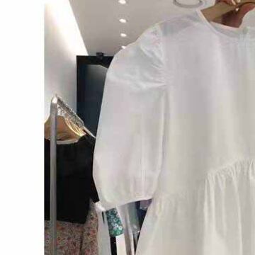 主役級の存在感がある、白のペプラムブラウス。ふんわりとしたパフスリーブとボリュームのあるフレアシルエットが、女性らしさを引き立てます。