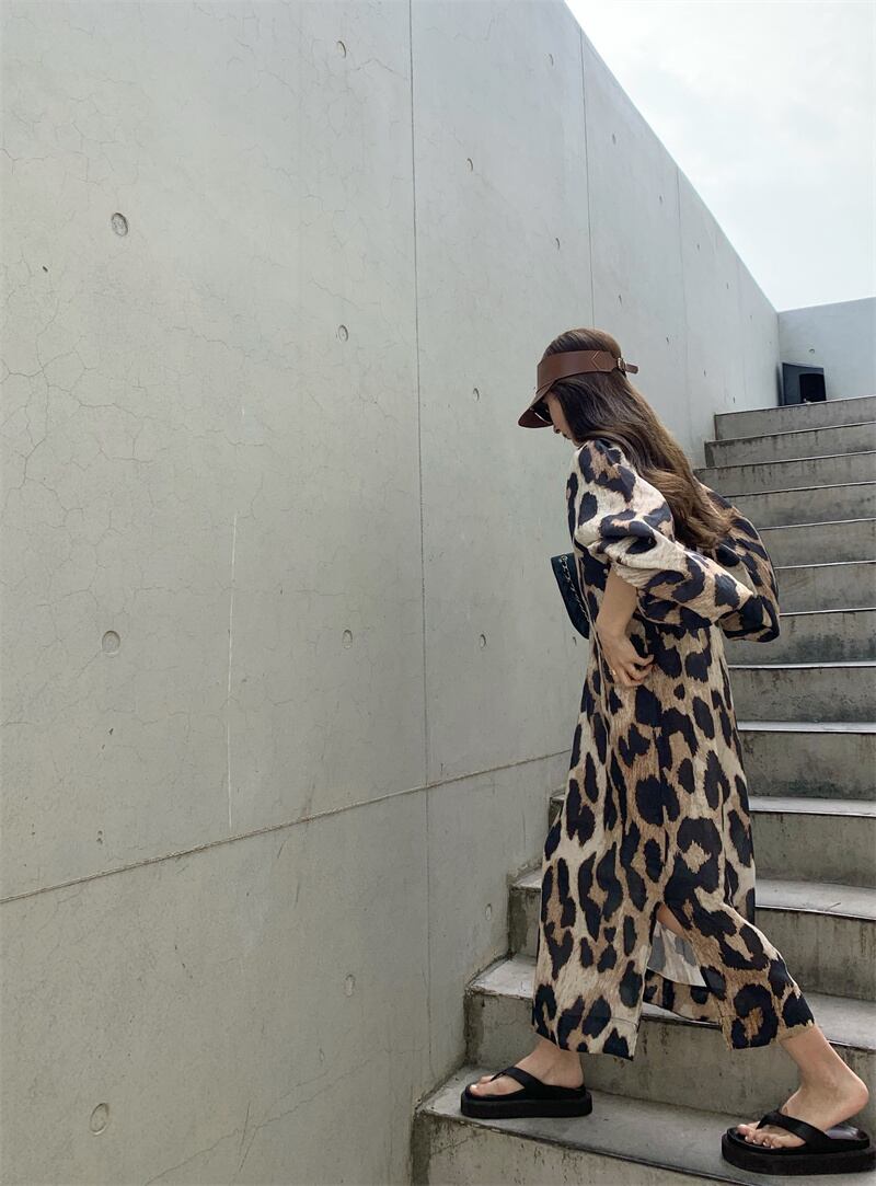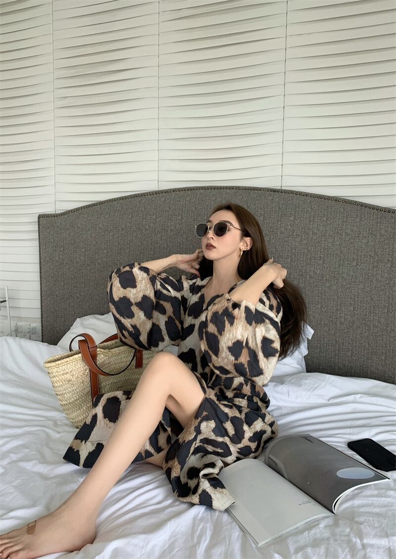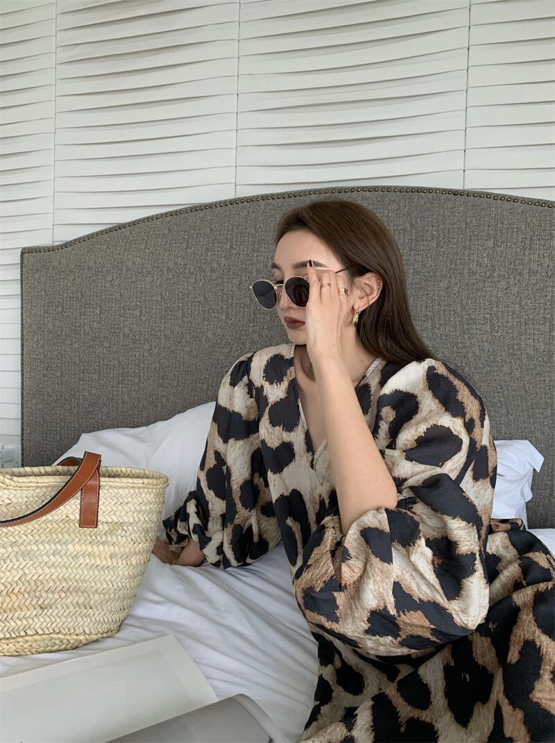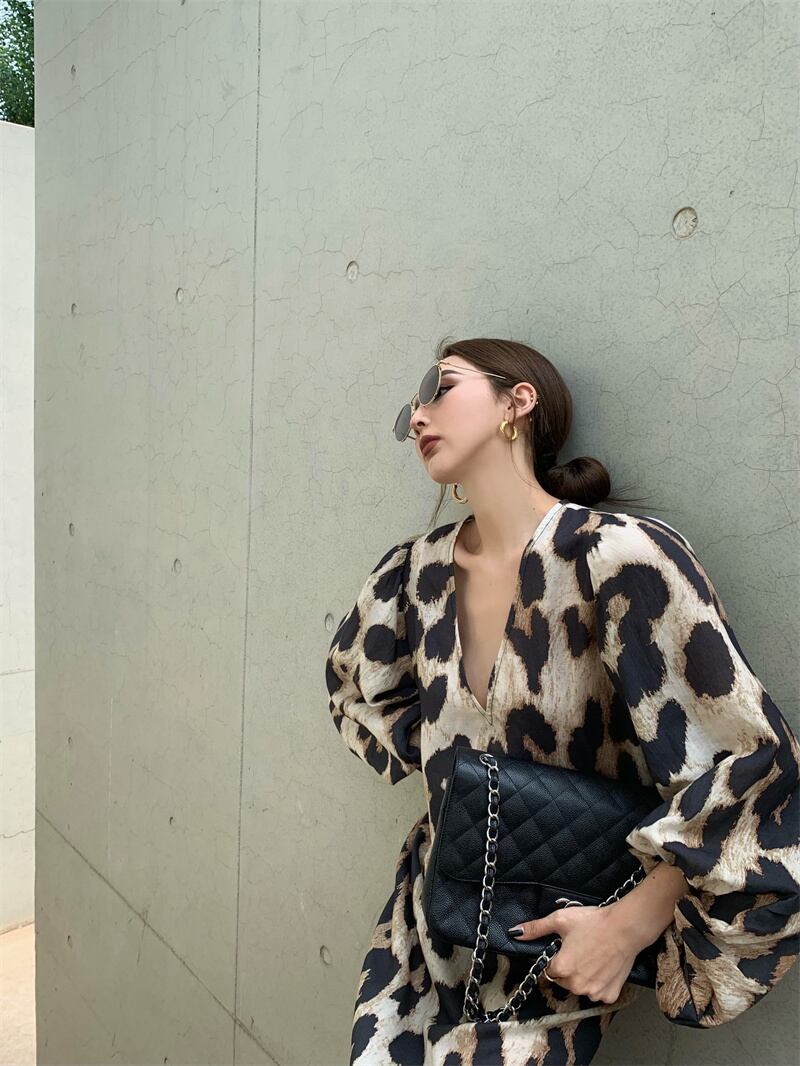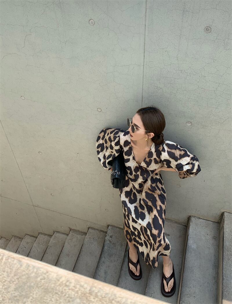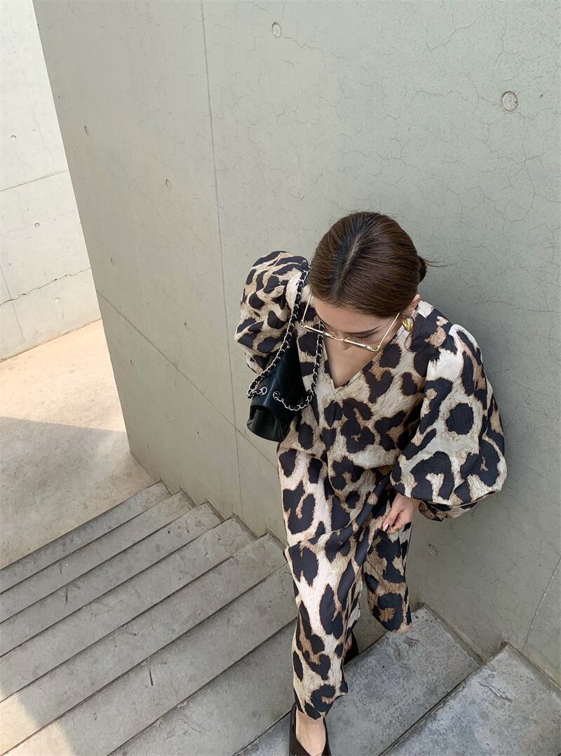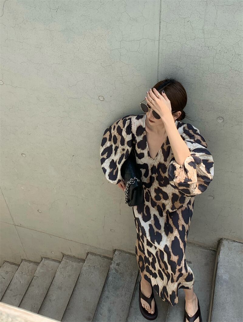 カジュアルワンピース 魅せる ワンピース ロング丈 袖あり 長袖 ボリューム袖 ランタンスリーブ Vネック ワイド スリット 大人女子 大人 上品 おしゃれ かっこいい クール カジュアル レトロ レトロ風 こなれ感 ラフ ルーズ シルエット 個性的 デザイン 主役級 存在感 柄 プリント アニマル柄 夏 サマー 20代 30代 40代 レディース 女性用 デート お出かけ 女子会 休日 おうち イベント リゾート 旅行 着回し 普段使い トレンド ワンサイズ