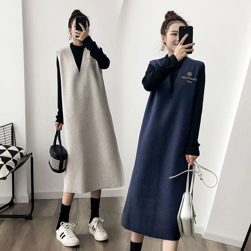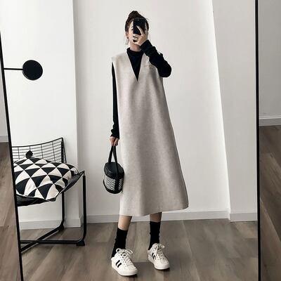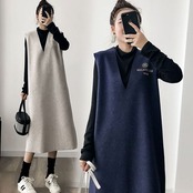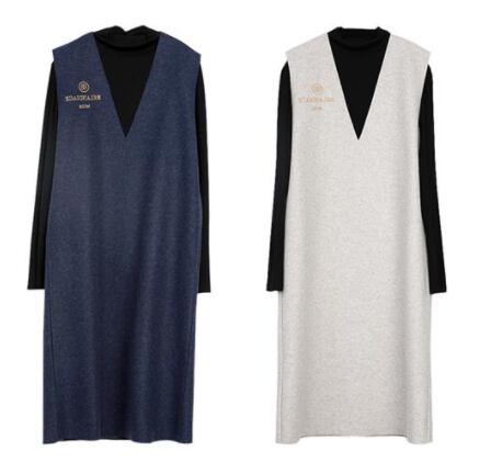 タンクワンピース 2ピースセット シンプル ワンピース Tシャツ ブラック 黒 グレー 灰色 ブルー 青 ミディアム丈 袖なし ノースリーブ 袖あり 長袖 Vネック ストレート ポリエステル 2点セット ツーピース 大人女子 大人 上品 おしゃれ カジュアル レトロ レトロ風 こなれ感 ラフ ルーズ シルエット 主役級 存在感 無地 秋 オータム 10代 20代 レディース 女性用 ママ 学生 通学 休日 おうち 着回し 普段使い M L XL 2XL 3XL 4XL 大きいサイズ