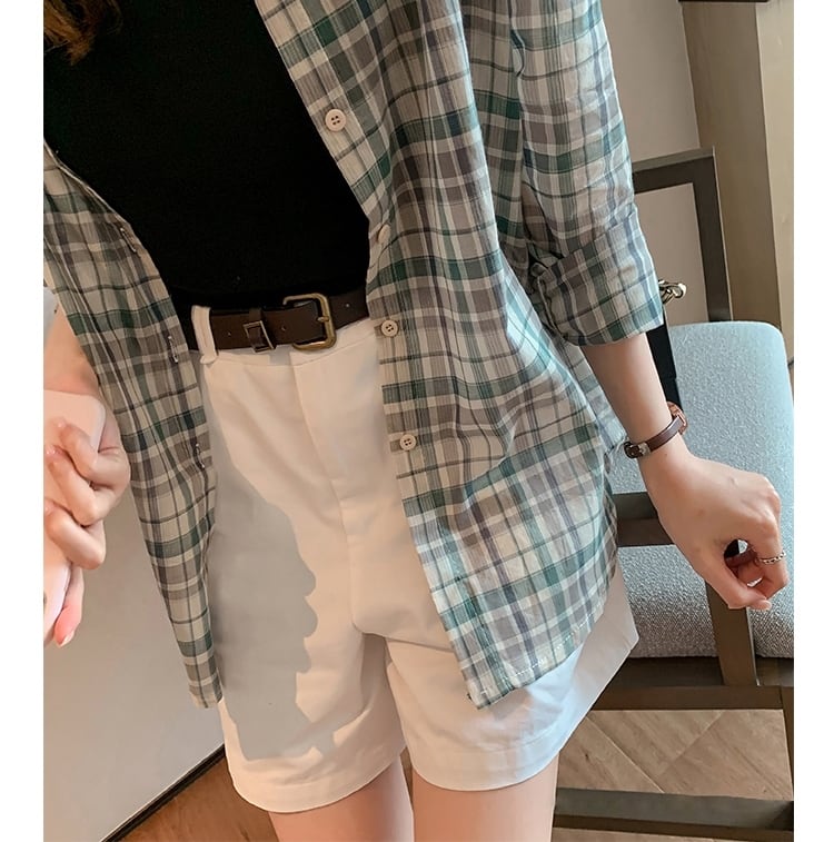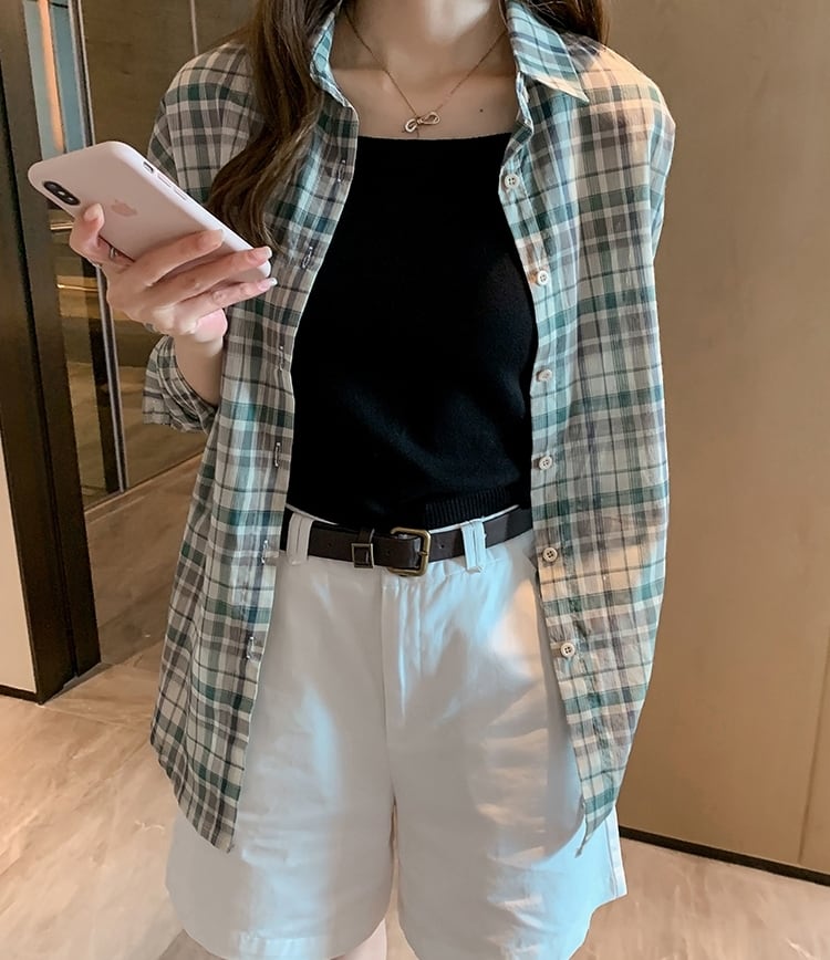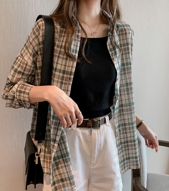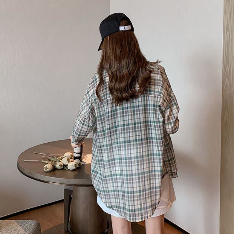 多色使いが可愛い後ろ裾が長めのチェック柄シャツ。