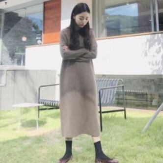 体のラインを強調しないIラインシルエットのニットワンピース。