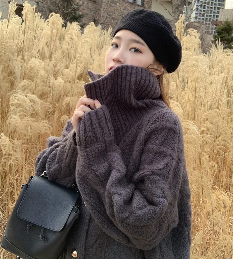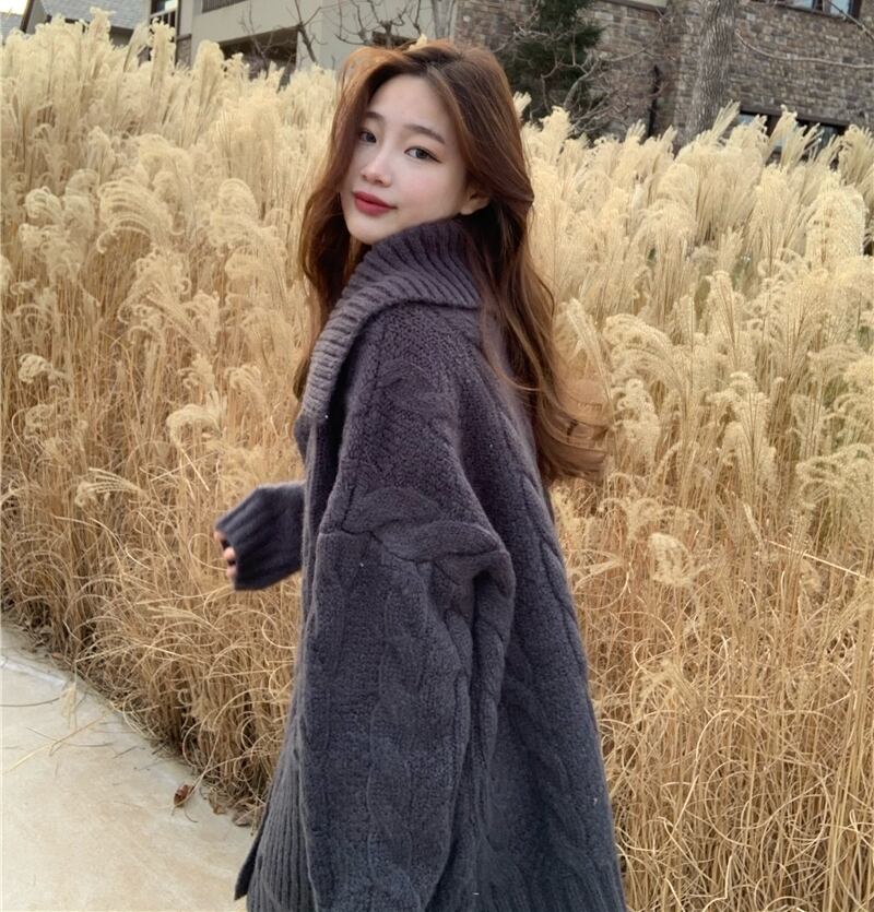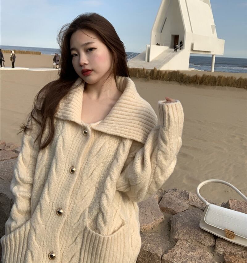 大きめ襟とゆったりオーバーサイズシルエットが今年らしい、縄編みやダイヤ柄編みを組み合わせた模様編みのニットカーディガン。