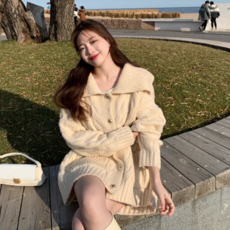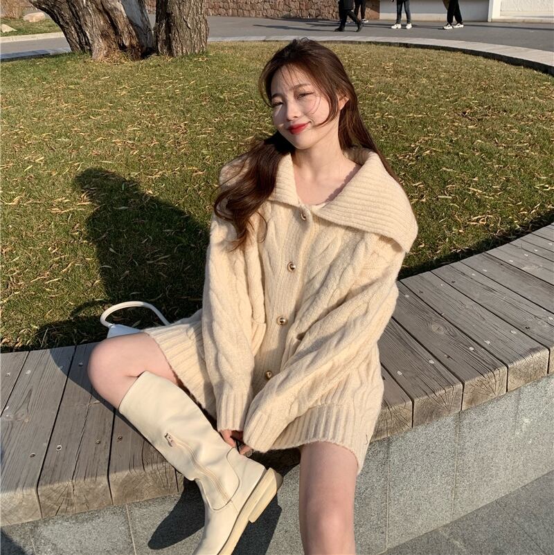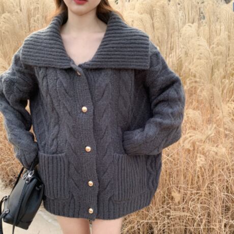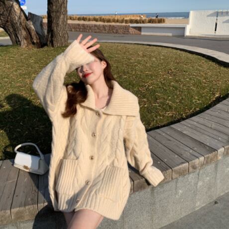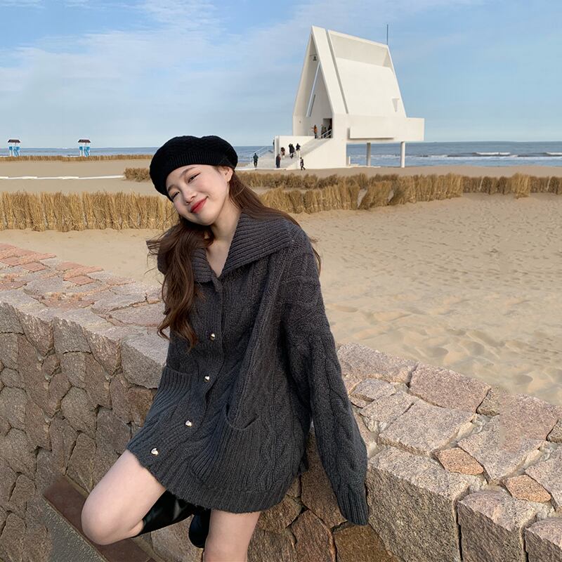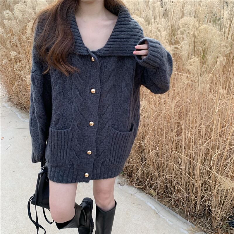 オーバーサイズ ビックカラー 模様編み ゴールドボタン コーディガン トップス セーター カーディガン 膝上 ミディアム丈 長袖 ドロップショルダー 萌袖 襟付き 前開き ケーブルニット かわいい 大人可愛い シンプル カジュアル 上品 おしゃれ こなれ感 春 秋 冬 2021 レディース 女性用 ママ マタニティ 女の子 学生 通学 デート お出かけ 公園デビュー 休日 着回し 普段使い 重ね着 韓国系 オルチャン コーデ 体系カバー フリーサイズ ゆったり ゆる サイズ グレー ベージュ