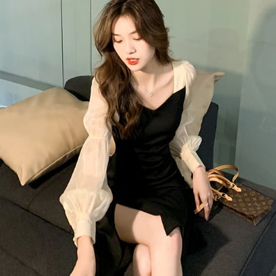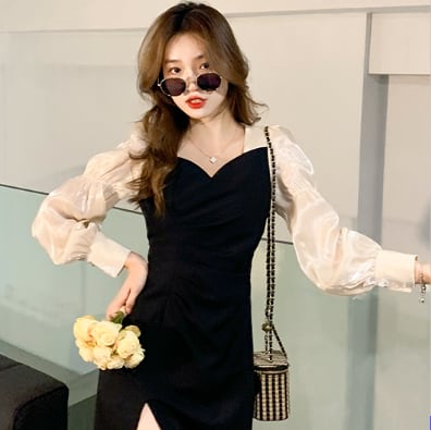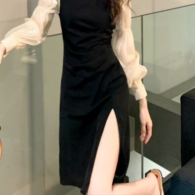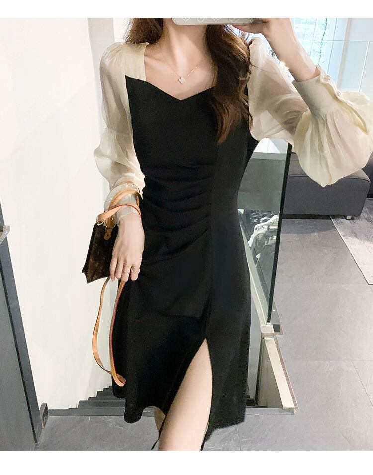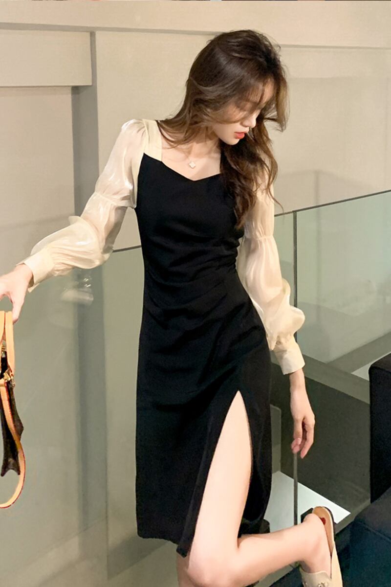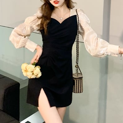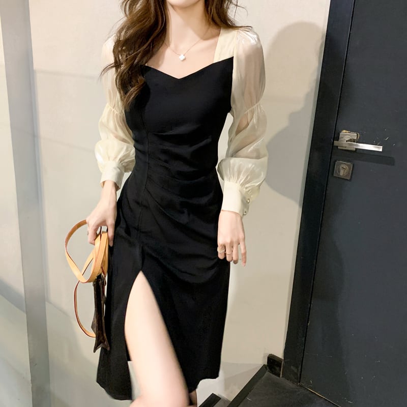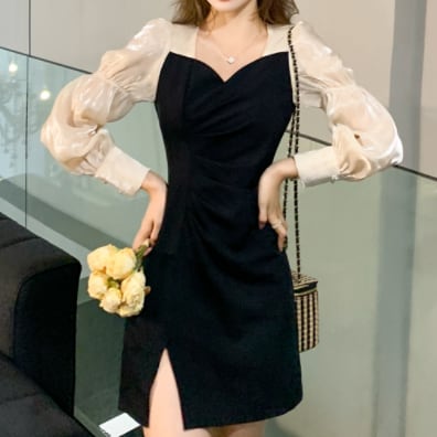 スリットワンピース ドッキングデザインワンピース ワンピース ミニ ミニ丈 膝丈 ひざ丈 膝上 長袖 パフスリーブ タイト 細身 切り替えデザイン ドッキング スリット シフォン かわいい 大人可愛い きれいめ 大人 上品 おしゃれ お洒落 大人可愛い 大人女子 ラブリー キュート ガーリー セクシー エレガント 主役級 存在感 フォーマル 無地 春 夏 結婚式 二次会 披露宴 10代 20代 30代 レディース 女性用 デート お出かけ 女子会 休日 パーティー イベント ホテル モテ 新作 定番